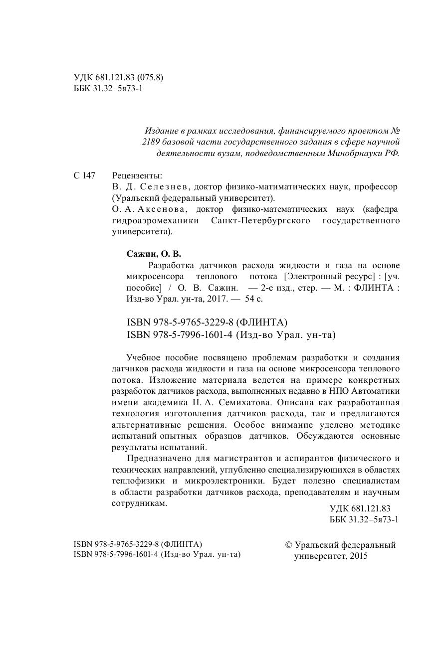 Учебное пособие посвящено проблемам разработки и создания датчиков расхода жидкости и газа на основе микросенсора теплового потока. Изложение материала ведется на примере конкретных разработок датчиков расхода, выполненных недавно в НПО Автоматики имени академика Н. А. Семихатова. Описана как разработанная технология изготовления датчиков расхода, так и предлагаются альтернативные решения. Особое внимание уделено методике испытаний опытных образцов датчиков. Обсуждаются основные результаты испытаний. Предназначено для магистрантов и аспирантов физического и технических направлений, углубленно специализирующихся в областях теплофизики и микроэлектроники. Будет полезно специалистам в области разработки датчиков расхода, преподавателям и научным сотрудникам.