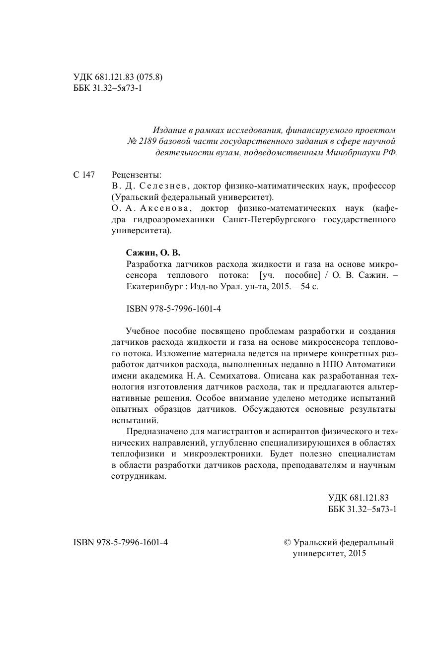 Разработка датчиков расхода жидкости и газа на основе микросенсора теплового потока: уч. пособие