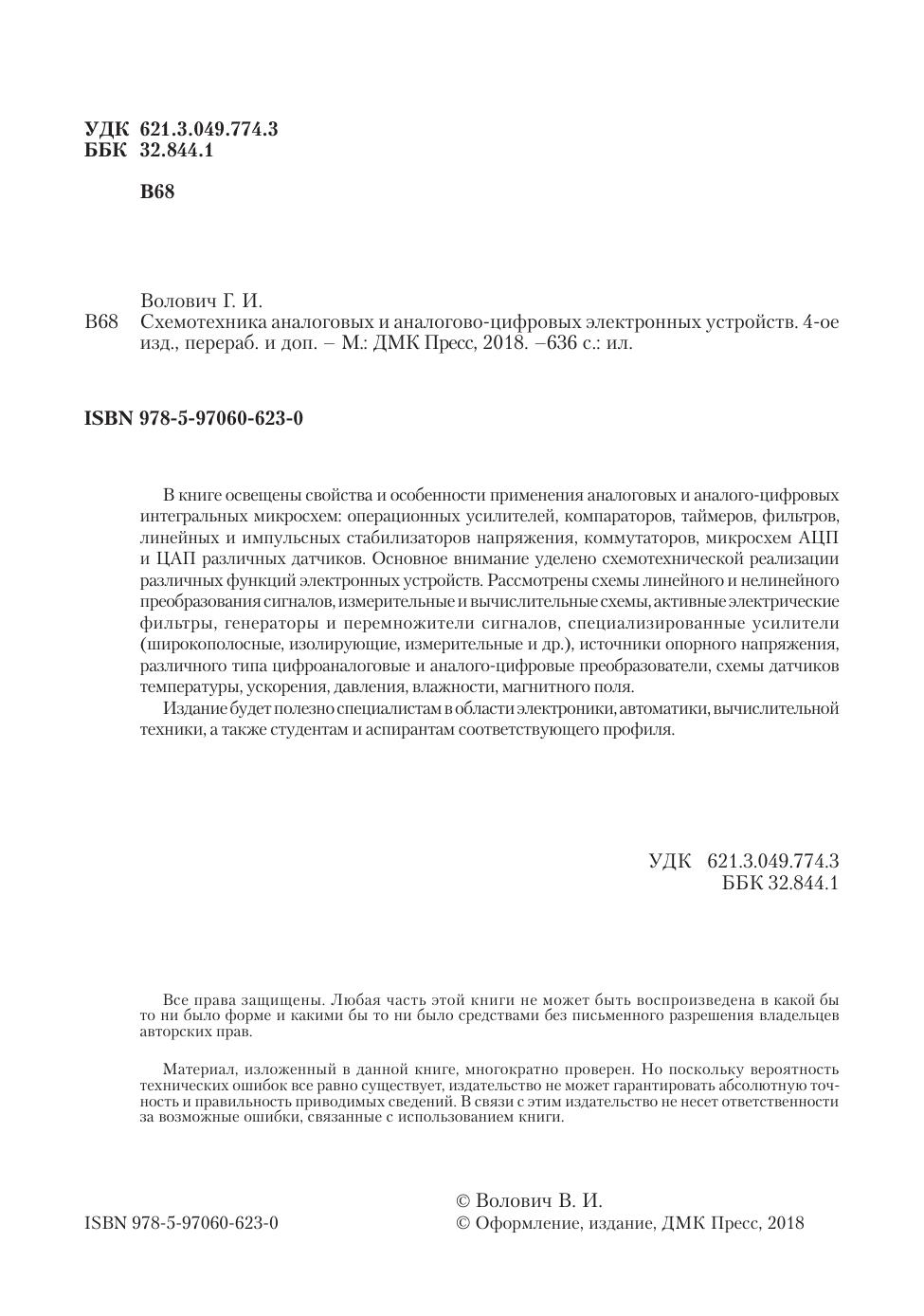 В книге освещены свойства и особенности применения аналоговых и аналого-цифровых интегральных микросхем: операционных усилителей, компараторов, таймеров, фильтров, линейных и импульсных стабилизаторов напряжения, коммутаторов, микросхем АЦП и ЦАП различных датчиков. Основное внимание уделено схемотехнической реализации различных функций электронных устройств. Рассмотрены схемы линейного и нелинейного преобразования сигналов, измерительные и вычислительные схемы, активные электрические фильтры, генераторы и перемножители сигналов, специализированные усилители (широкополосные, изолирующие, измерительные и др.), источники опорного напряжения, различного типа цифроаналоговые и аналого-цифровые преобразователи, схемы датчиков температуры, ускорения, давления, влажности, магнитного поля. Издание будет полезно специалистам в области электроники, автоматики, вычислительной техники, а также студентам и аспирантам соответствующего профиля.