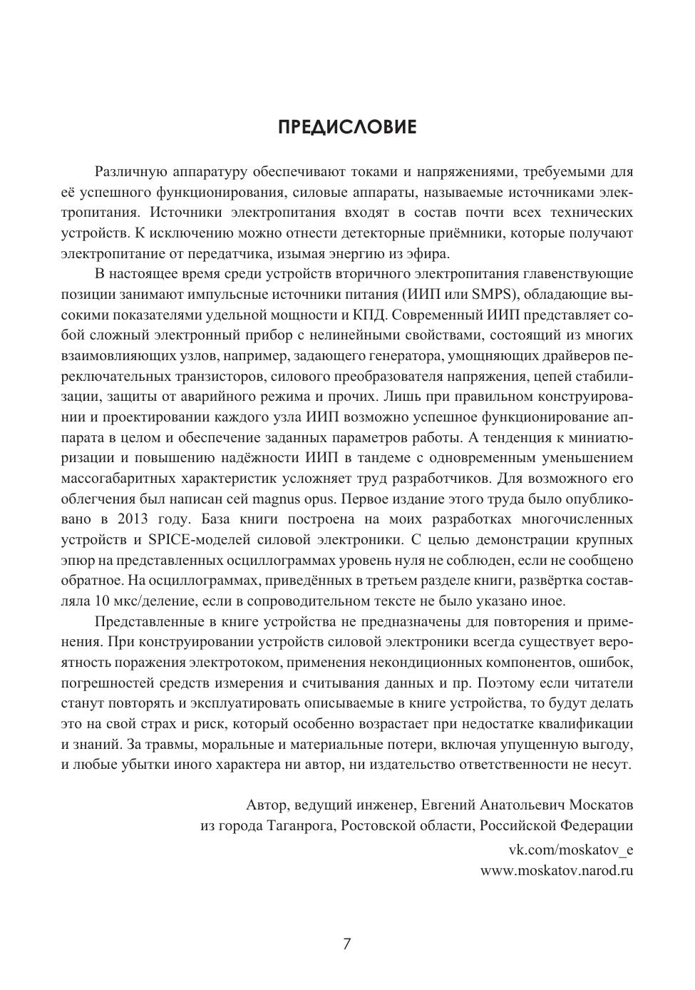 Приведены схемотехнические реализации и изложены теоретические аспекты конструирования, изготовления и настройки импульсных источников электропитания. Даны систематизированные сведения по современным силовым преобразователям. Описаны многочисленные спроектированные и изготовленные автором практические конструкции законченных электропитающих устройств различной сложности и мощности, их блоков, результаты экспериментально-исследовательских работ. Показаны модели, созданные в симуляторе LTspice. Проанализированы причины уменьшения энергетических параметров электропитающих устройств.