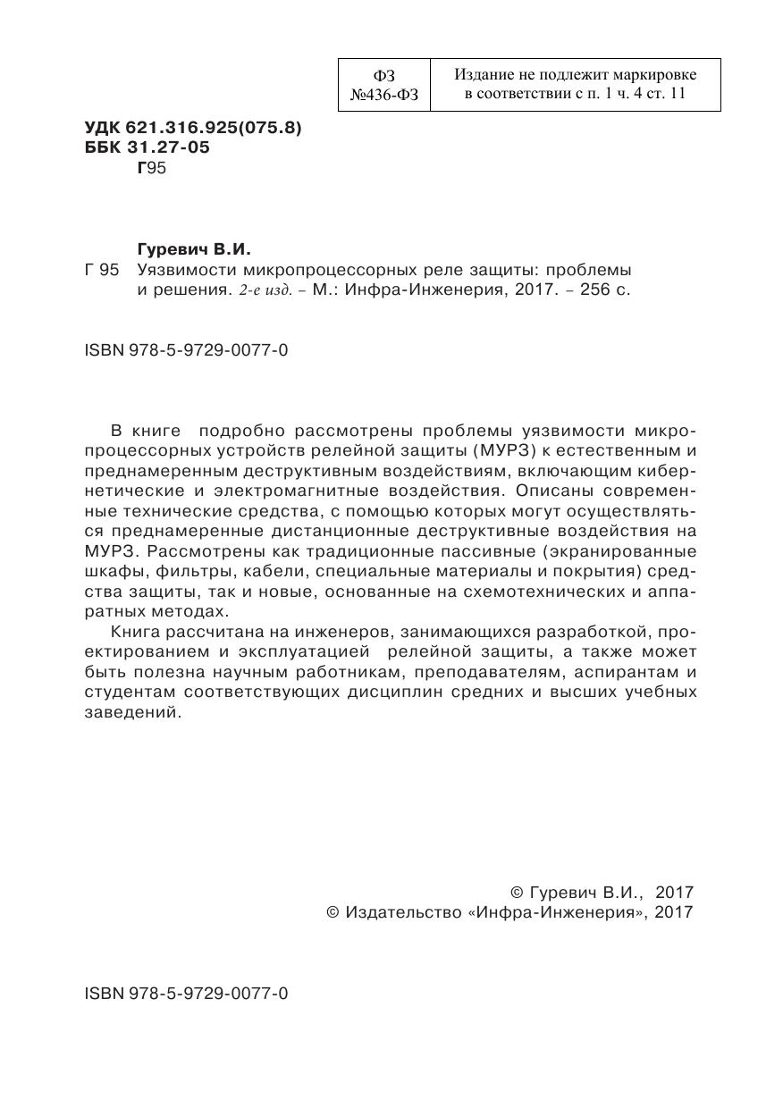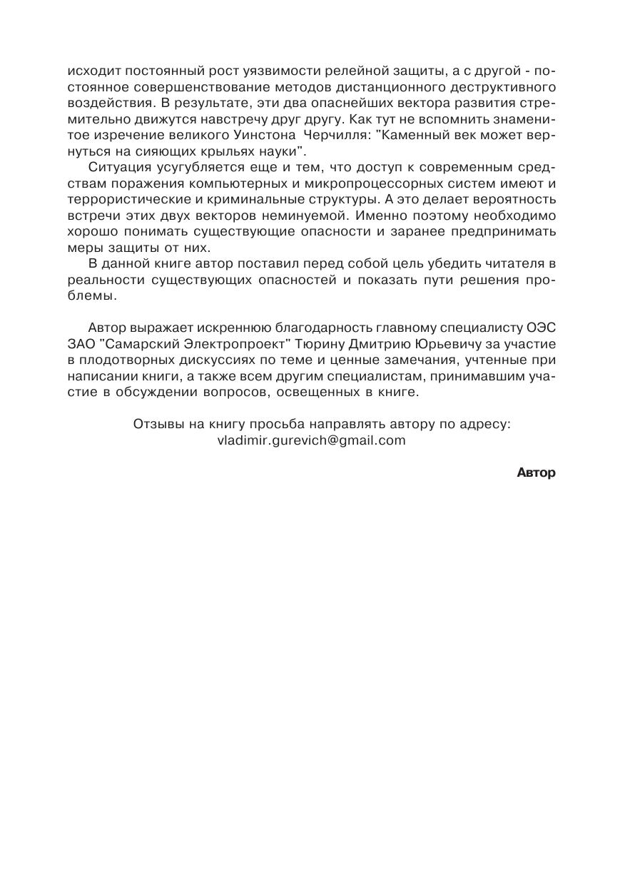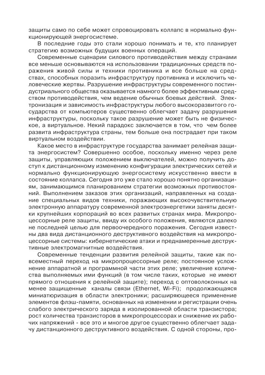 В книге подробно рассмотрены проблемы уязвимости микропроцессорных устройств релейной защиты (МУРЗ) к естественным и преднамеренным деструктивным воздействиям, включающим кибернетические и электромагнитные воздействия. Описаны современные технические средства, с помощью которых могут осуществляться преднамеренные дистанционные деструктивные воздействия на МУРЗ. Рассмотрены как традиционные пассивные (экранированные шкафы, фильтры, кабели, специальные материалы и покрытия) средства защиты, так и новые, основанные на схемотехнических и аппаратных методах.