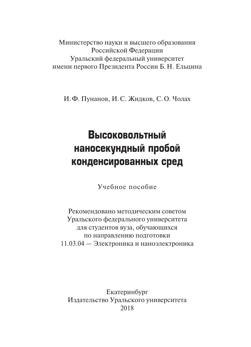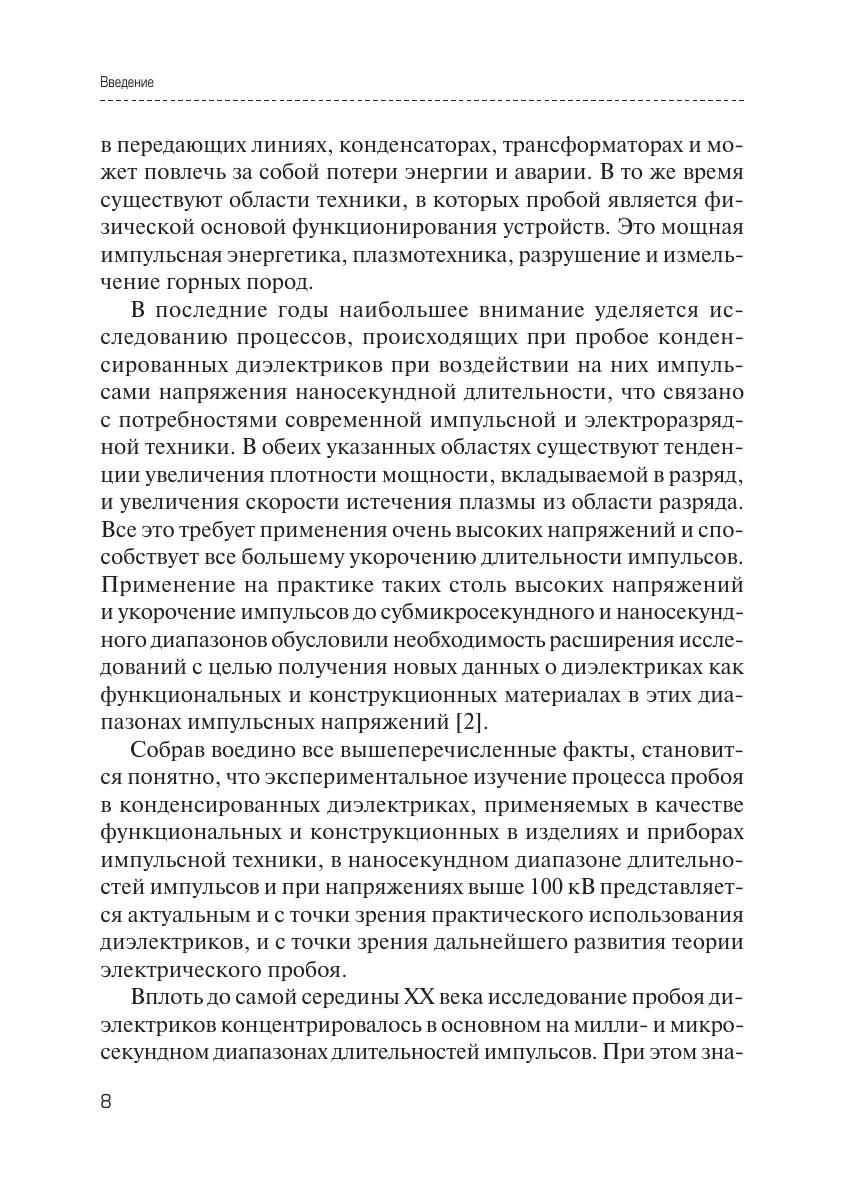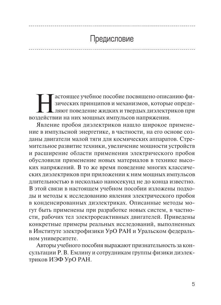 Учебное пособие предназначено для студентов, обучающихся по направлению 11.03.04 — Электроника и наноэлектроника, аспирантов и научных работников. Кратко описаны существующие модели пробоя в кристаллах и жидкостях. Изложены результаты экспериментальных исследований пробоя конденсированных диэлектриков по таким характеристикам, как скорость развития канала пробоя, ток формирования канала, давление в канале пробоя, параметры плазмы в канале пробоя, кристаллографическая направленность каналов. Рассмотрены некоторые экспериментальные методы. Учебное пособие может быть использовано для студентов и аспирантов физических специальностей, в том числе по курсам «Электрорадиоматериалы», «Электрофизические методы обработки материалов».