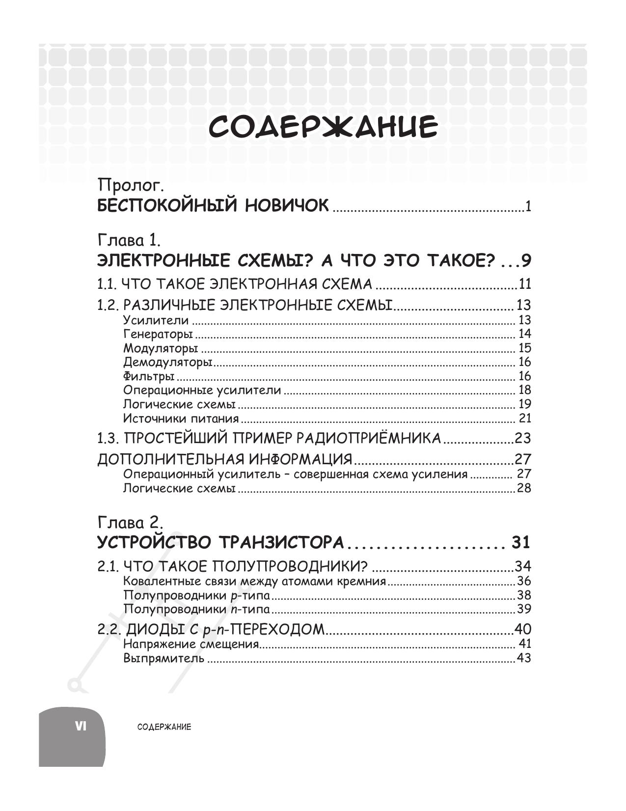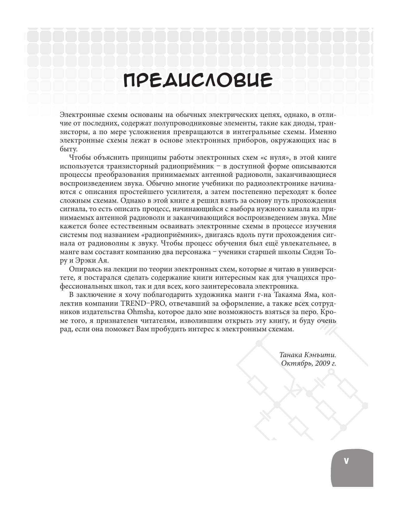 Электронные схемы основаны на обычных электрических цепях, однако, в отличие от последних, содержат полупроводниковые элементы, такие как диоды, транзисторы, а по мере усложнения превращаются в интегральные схемы. Именно электронные схемы лежат в основе электронных приборов, окружающих нас в быту. Чтобы объяснить принципы работы электронных схем «с нуля», в этой книге используется транзисторный радиоприёмник – в доступной форме описываются процессы преобразования принимаемых антенной радиоволн, заканчивающиеся воспроизведением звука. Обычно многие учебники по радиоэлектронике начинаются с описания простейшего усилителя, а затем постепенно переходят к более сложным схемам. Однако в этой книге автор решил взять за основу путь прохождения сигнала, то есть описать процесс, начинающийся с выбора нужного канала из принимаемых антенной радиоволн и заканчивающийся воспроизведением звука. Чтобы процесс обучения был ещё увлекательнее, в Манге вам составят компанию два персонажа – ученики старшей школы Сидэн Тору и Эрэки Ая. Простота изложения и увлекательный сюжет о любви старшеклассников поможет начинающим любителям электроники получить базовые знания по теории электронных схем.