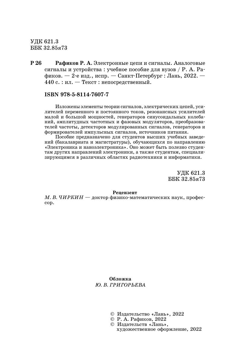 Изложены элементы теории сигналов, электрических цепей, усилителей переменного и постоянного токов, резонансных усилителей малой и большой мощностей, генераторов синусоидальных колебаний, амплитудных частотных и фазовых модуляторов, преобразователей частоты, детекторов модулированных сигналов, генераторов и формирователей импульсных сигналов, источников питания. Пособие предназначено для студентов высших учебных заведений (бакалавриата и магистратуры), обучающихся по направлению «Электроника и наноэлектроника». Оно может быть полезно студентам других направлений электроники, а также студентам, специализирующимся в различных областях радиотехники и информатики.