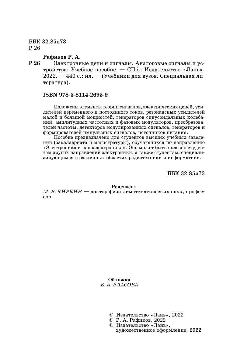 Изложены элементы теории сигналов, электрических цепей, усилителей переменного и постоянного токов, резонансных усилителей малой и большой мощностей, генераторов синусоидальных колебаний, амплитудных частотных и фазовых модуляторов, преобразователей частоты, детекторов модулированных сигналов, генераторов и формирователей импульсных сигналов, источников питания. Пособие предназначено для студентов высших учебных заведений (бакалавриата и магистратуры), обучающихся по направлению «Электроника и наноэлектроника». Оно может быть полезно студентам других направлений электроники, а также студентам, специализирующимся в различных областях радиотехники и информатики.
