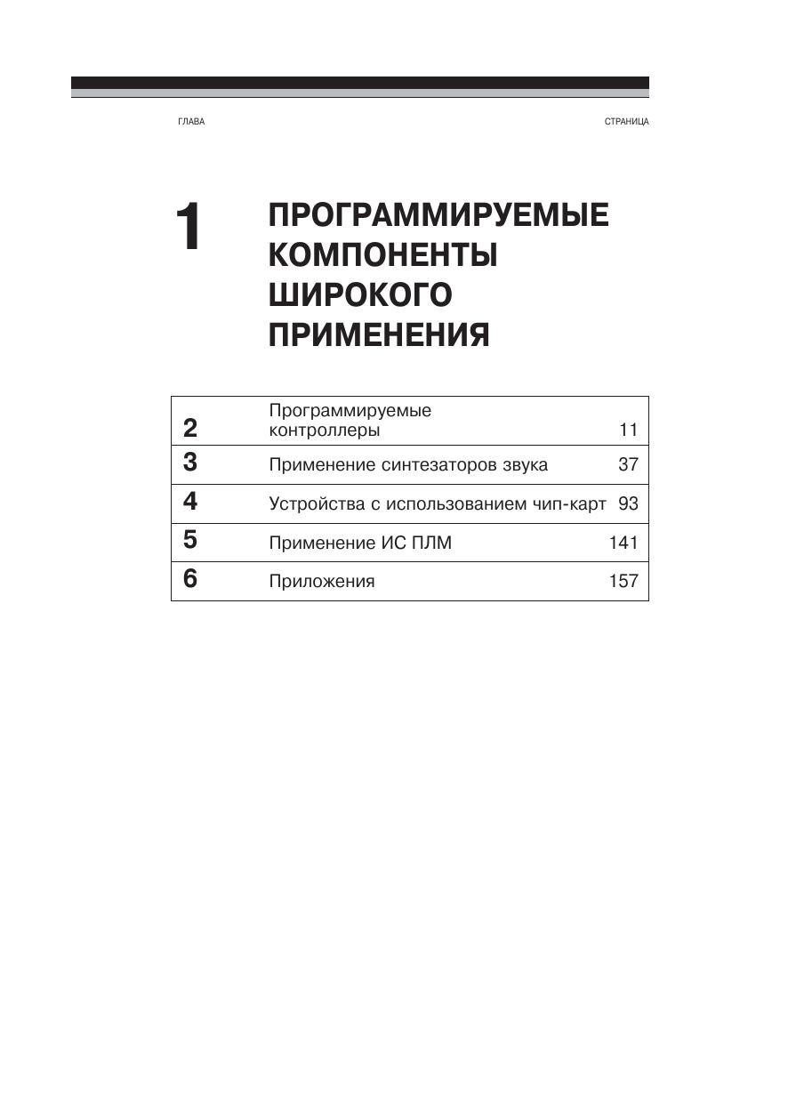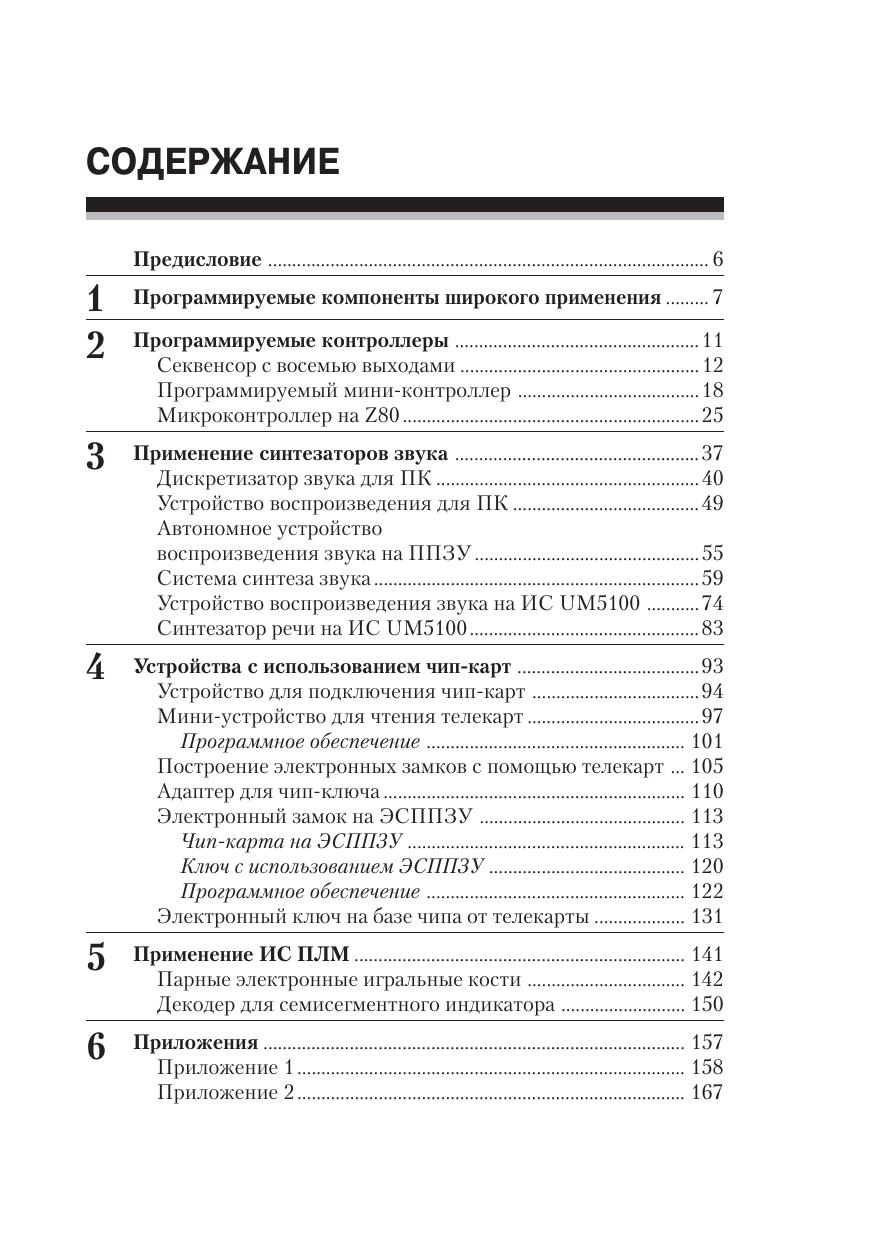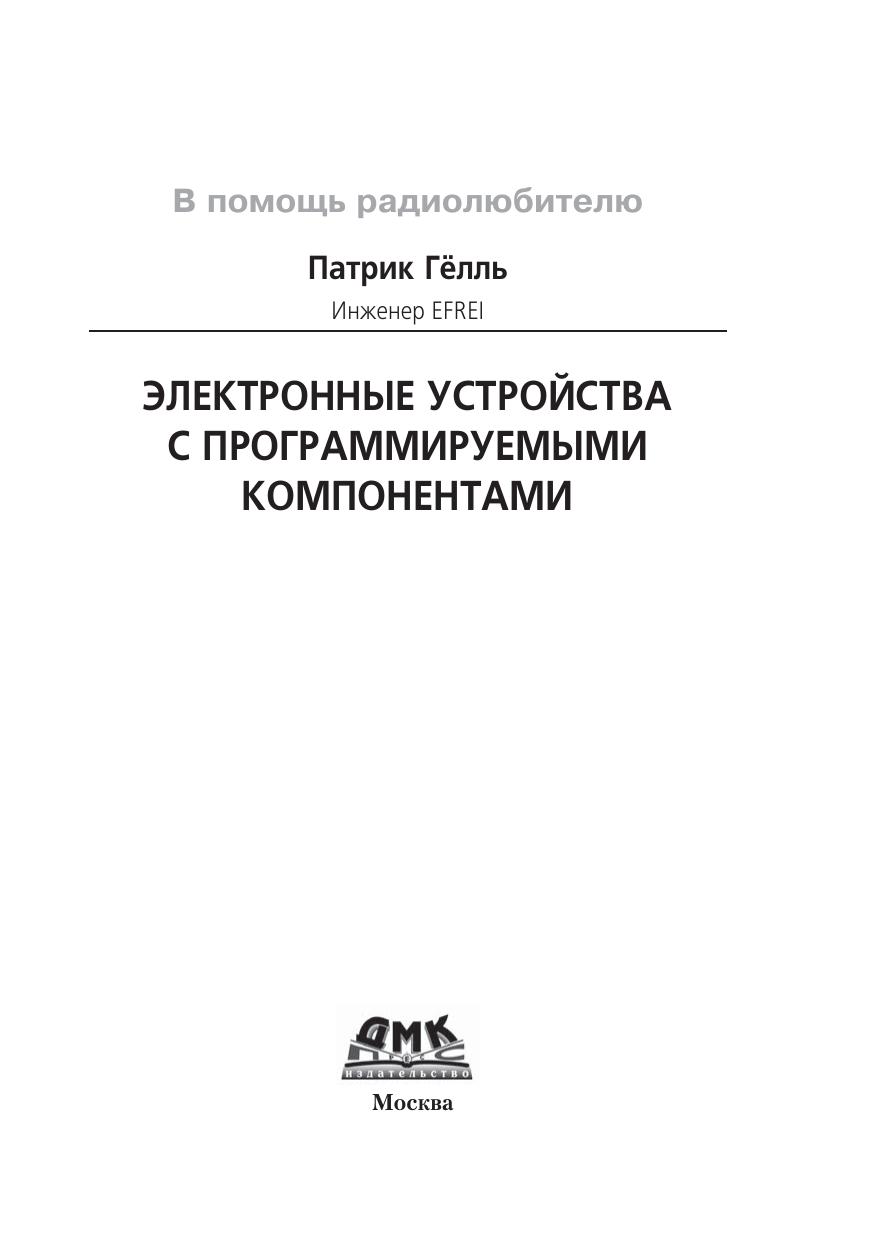 Книга известного французского автора Патрика Гёлля знакомит читателей с разнообразным применением программируемых электронных компонентов. Это микроконтроллеры, устройства записи и воспроизведения звука, синтеза речи, контроля доступа, декодирующие устройства, электронные игры. По сути, книга представляет собой лабораторный практикум, позволяющий читателю уверенно войти в динамично развивающийся мир новых электронных компонентов. Книга адресована радиолюбителям с разным уровнем подготовки, некоторые разделы будут интересны и специалистам. Изложенный материал позволит каждому, кто заинтересуется тем или иным схемотехническим решением, без особого труда воспроизвести его даже в домашних условиях.