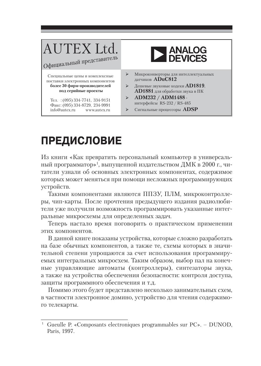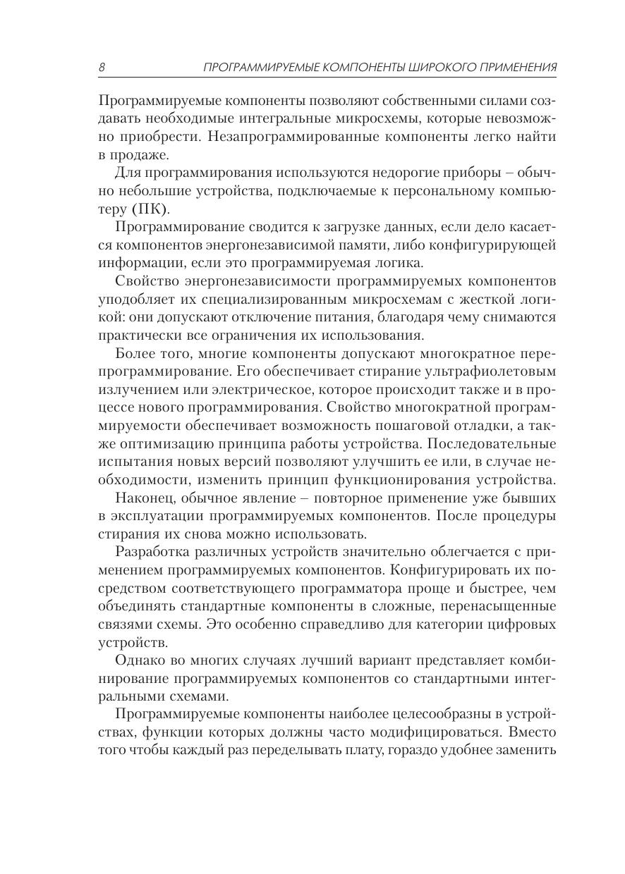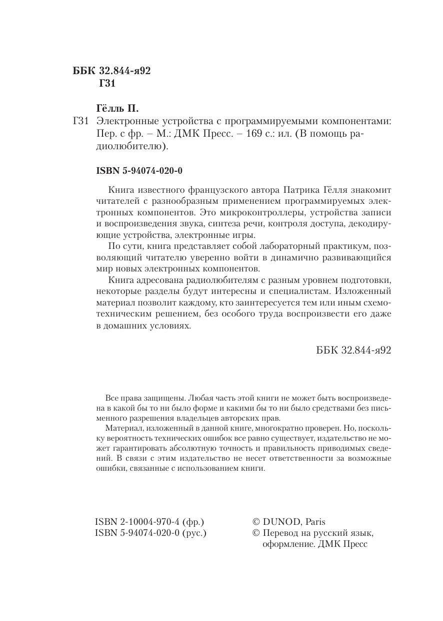 Книга известного французского автора Патрика Гёлля знакомит читателей с разнообразным применением программируемых электронных компонентов. Это микроконтроллеры, устройства записи и воспроизведения звука, синтеза речи, контроля доступа, декодирующие устройства, электронные игры. По сути, книга представляет собой лабораторный практикум, позволяющий читателю уверенно войти в динамично развивающийся мир новых электронных компонентов. Книга адресована радиолюбителям с разным уровнем подготовки, некоторые разделы будут интересны и специалистам. Изложенный материал позволит каждому, кто заинтересуется тем или иным схемотехническим решением, без особого труда воспроизвести его даже в домашних условиях.