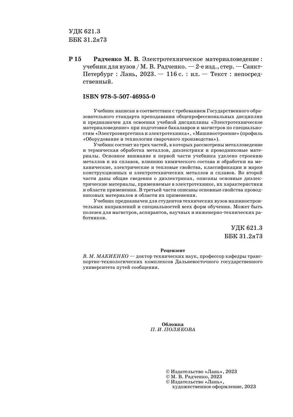 Учебник написан в соответствии с требованием государственного образовательного стандарта преподавания общепрофессиональных дисциплин и предназначен для освоения учебной дисциплины «Электротехническое материаловедение» при подготовке бакалавров и магистров по специальностям «Электроэнергетика и электротехника», «Машиностроение» (профиль «Оборудование и технологии сварочного производства»). Учебник состоит из трех частей, в которых рассмотрены металловедение и термическая обработка металлов, диэлектрики и проводниковые материалы. Основное внимание в первой части учебника уделено строению металлов и их сплавов, влиянию химического состава и обработки на механические, электрические и тепловые свойства, классификации и марки конструкционных и электротехнических металлов и сплавов. Во второй части даны общие сведения о диэлектриках, описаны основные диэлектрические материалы, применяемые в электротехнике, их характеристики и области применения. В третьей части описаны основные свойства проводниковых материалов и области их применения. Учебник предназначен для студентов технических вузов машиностроительных направлений и специальностей всех форм обучения. Может быть полезен для магистров, аспирантов, научных и инженерно-технических работников.