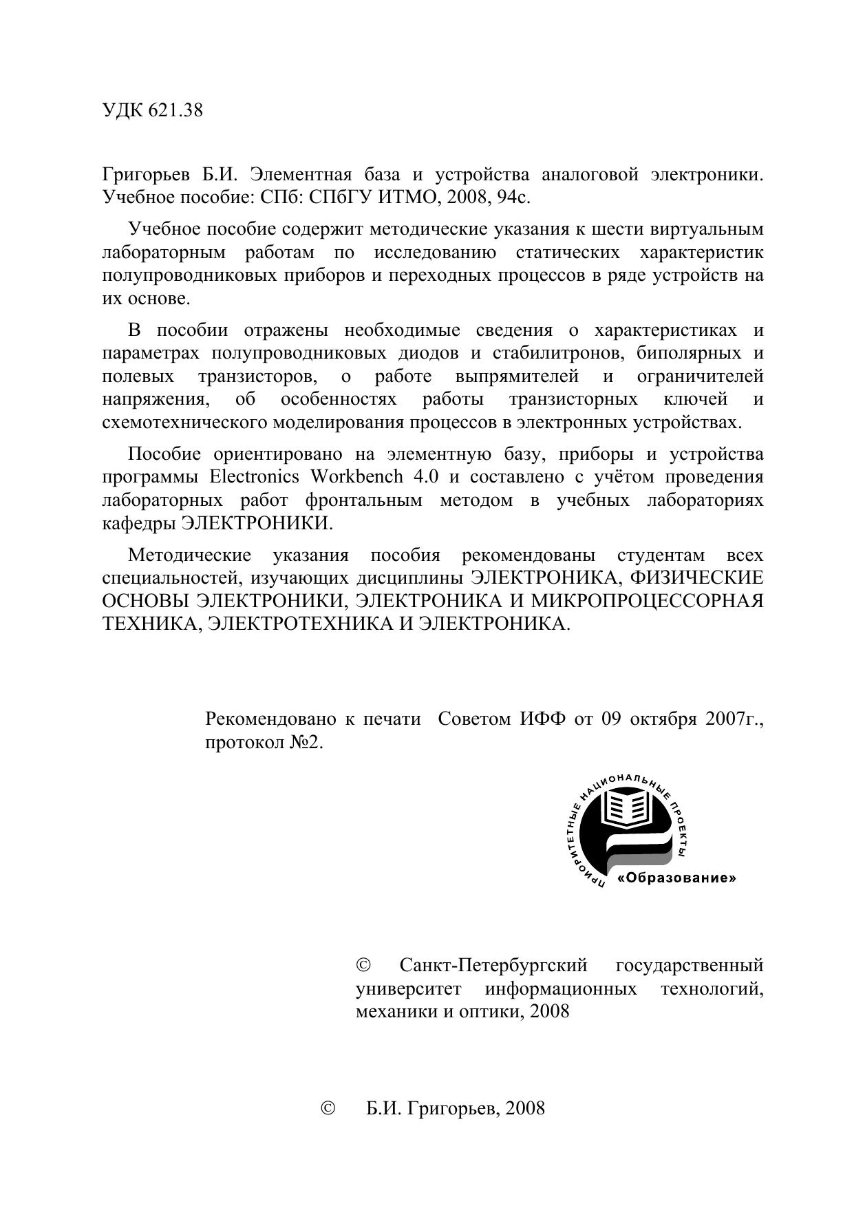 Учебное пособие содержит методические указания к шести виртуальным лабораторным работам по исследованию статических характеристик полупроводниковых приборов и переходных процессов в ряде устройств на их основе. В пособии отражены необходимые сведения о характеристиках и параметрах полупроводниковых диодов и стабилитронов, биполярных и полевых транзисторов, о работе выпрямителей и ограничителей напряжения, об особенностях работы транзисторных ключей исхемотехнического моделирования процессов в электронных устройствах. Пособие ориентировано на элементную базу, приборы и устройства программы Electronics Workbench 4.0 и составлено с учётом проведения лабораторных работ фронтальным методом в учебных лабораториях кафедры ЭЛЕКТРОНИКИ.