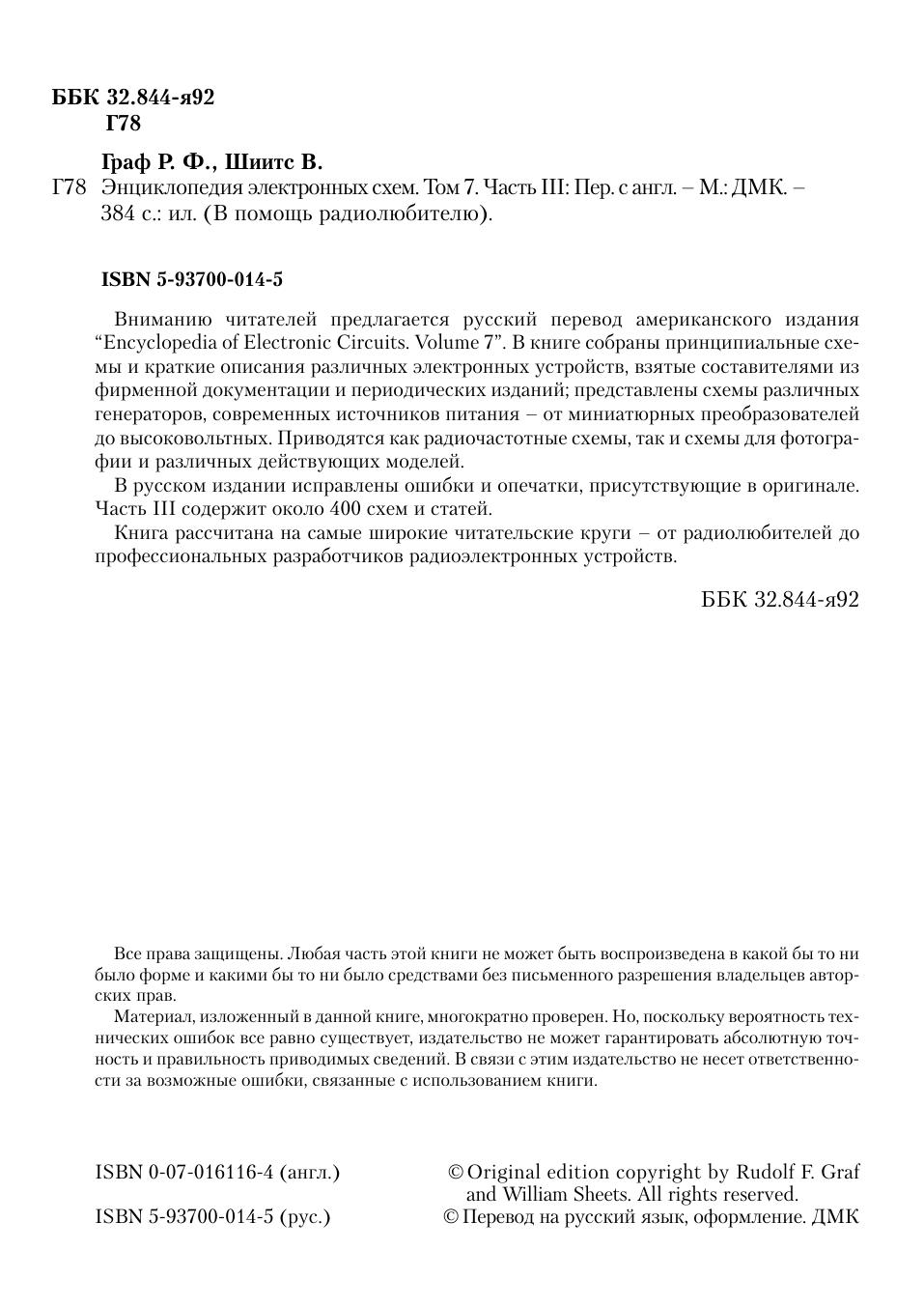 Вниманию читателей предлагается русский перевод американского издания “Encyclopedia of Electronic Circuits. Volume 7”. В книге собраны принципиальные схемы и краткие описания различных электронных устройств, взятые составителями из фирменной документации и периодических изданий, представлены схемы различных генераторов, современных источников питания – от миниатюрных преобразователей до высоковольтных. Приводятся как радиочастотные схемы, так и схемы для фотографии и различных действующих моделей. В русском издании исправлены ошибки и опечатки, присутствующие в оригинале. Часть III содержит около 400 схем и статей. Книга рассчитана на самые широкие читательские круги – от радиолюбителей до профессиональных разработчиков радиоэлектронных устройств.