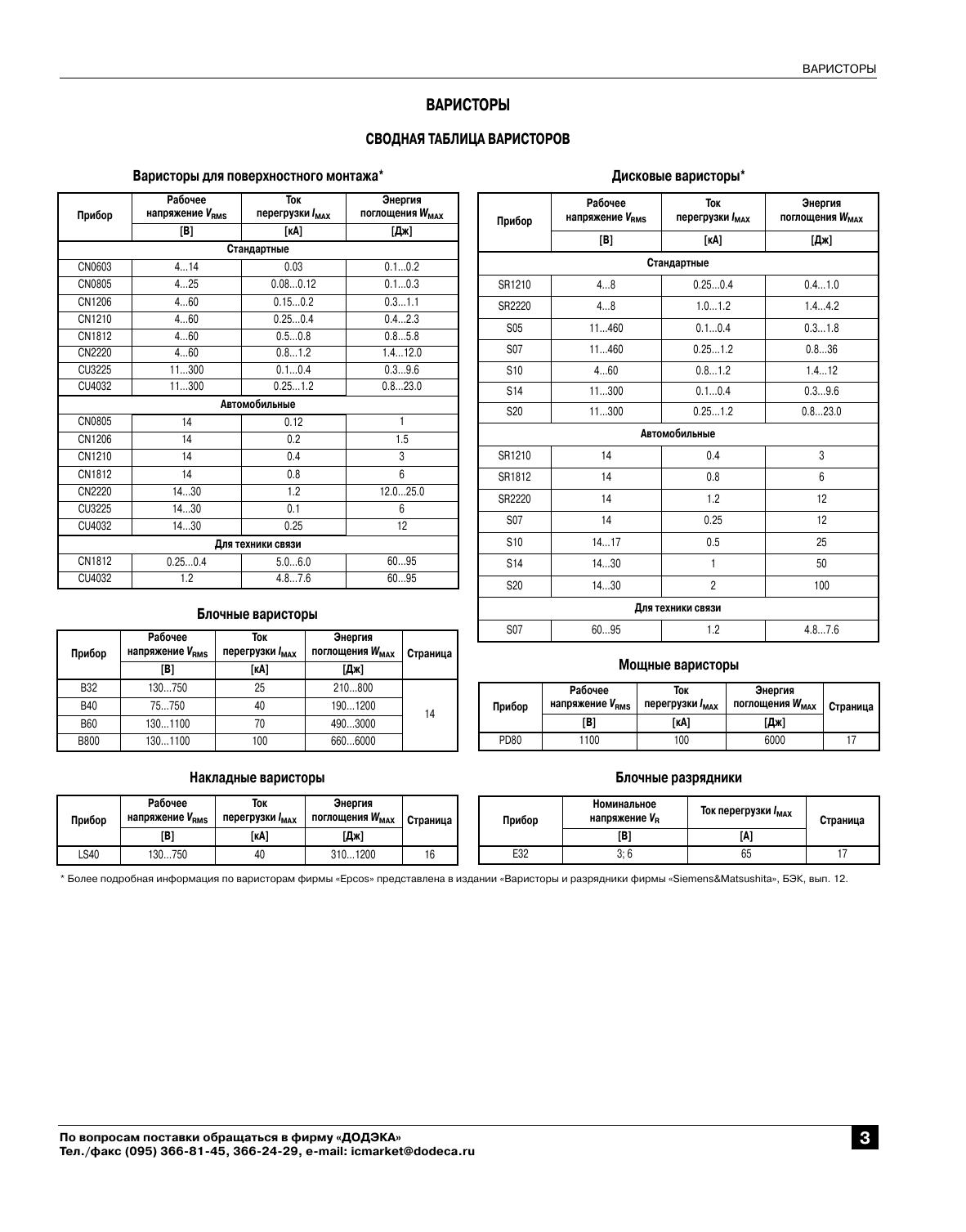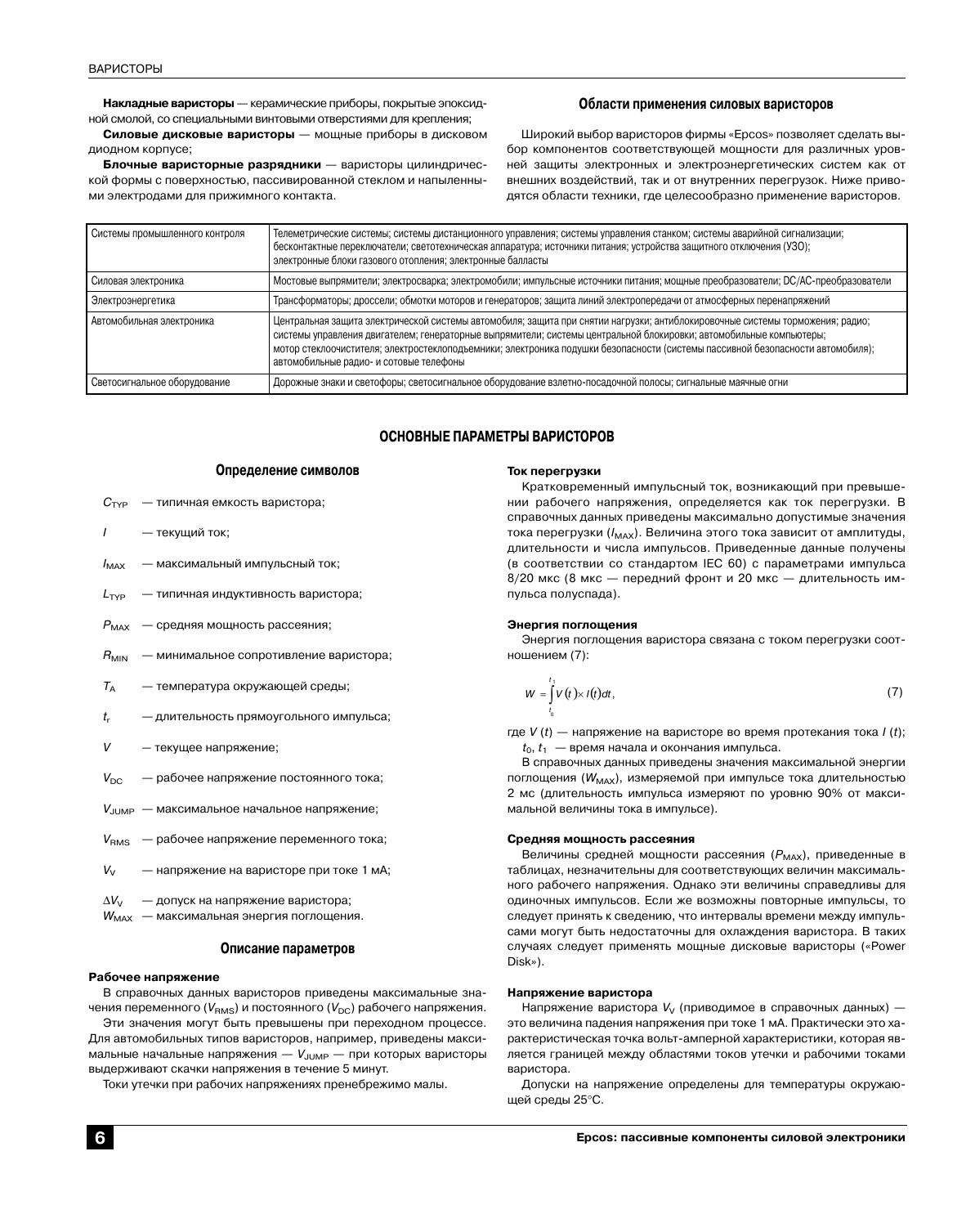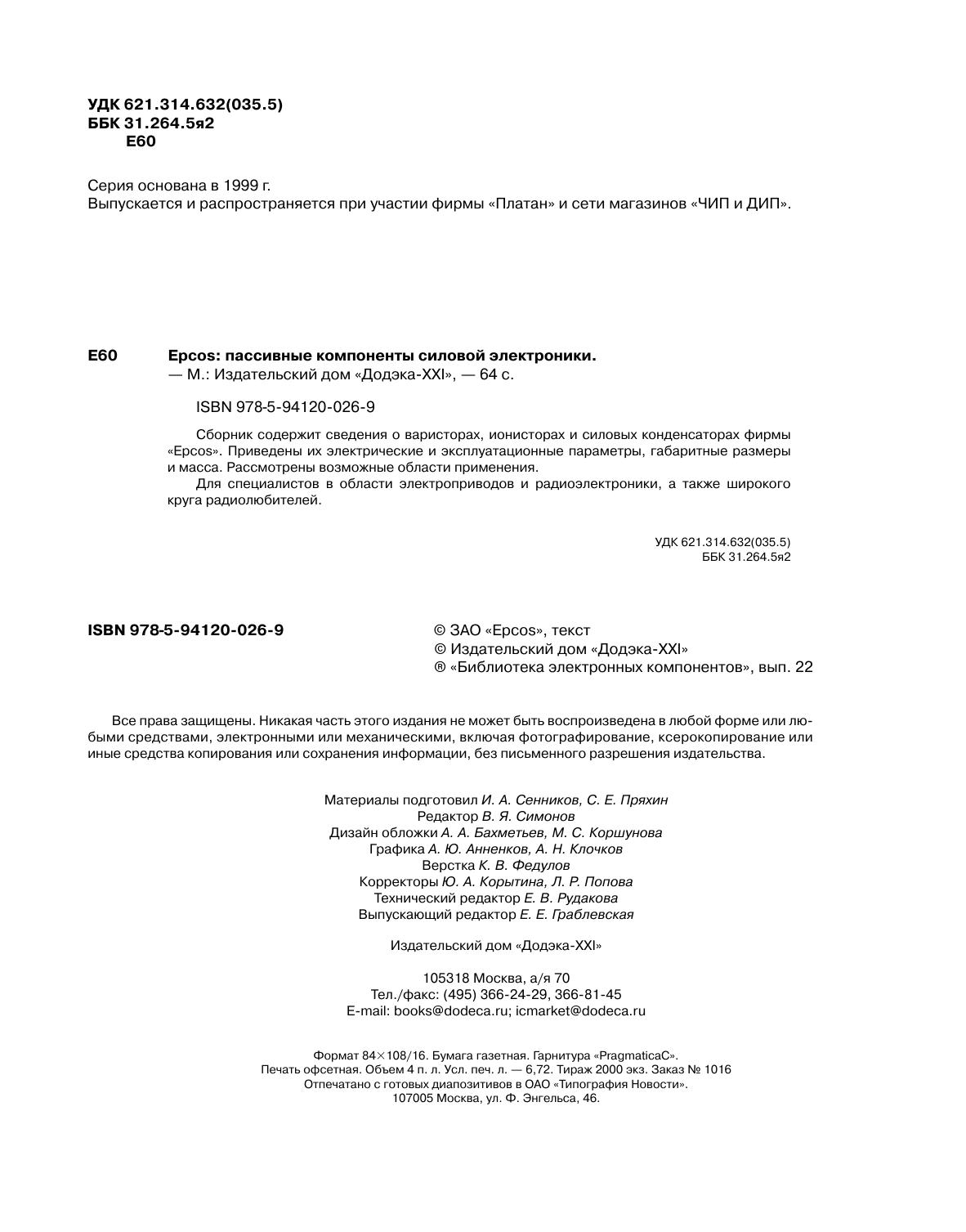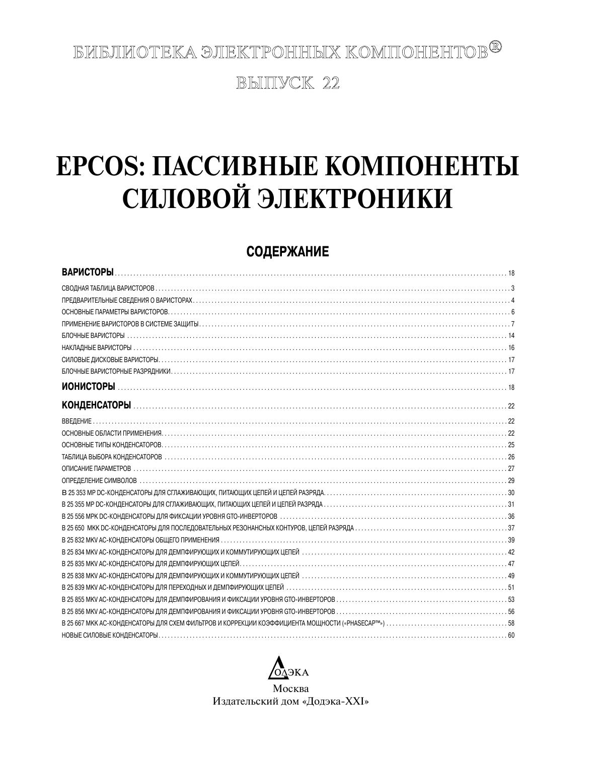 Сборник содержит сведения о варисторах, ионисторах и силовых конденсаторах фирмы «Epcos». Приведены их электрические и эксплуатационные параметры, габаритные размеры и масса. Рассмотрены возможные области применения. Для специалистов в области электроприводов и радиоэлектроники, а также широкого круга радиолюбителей.