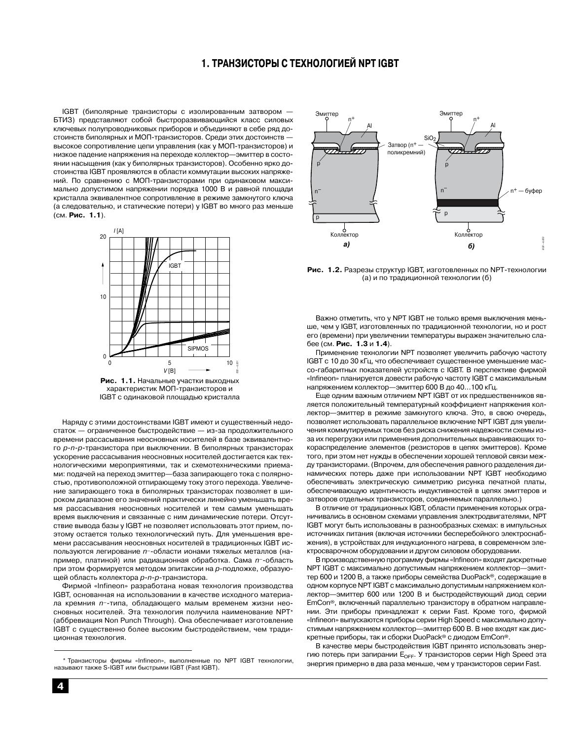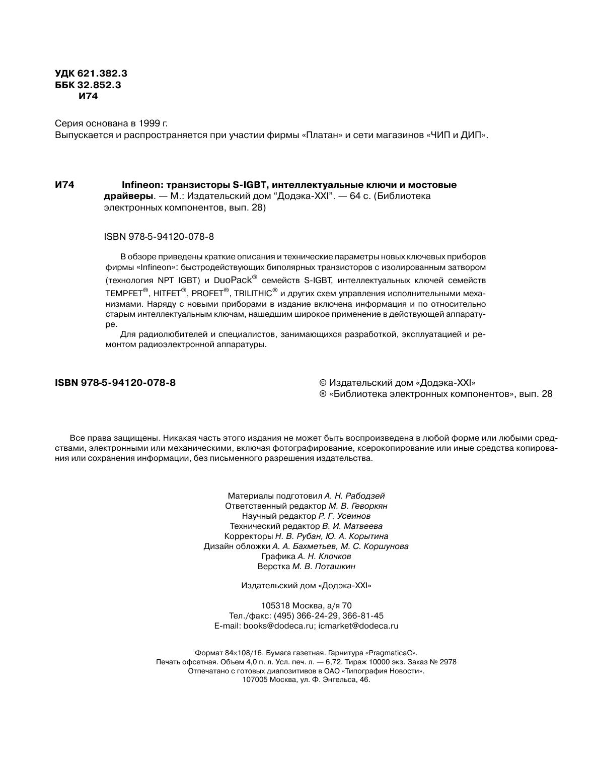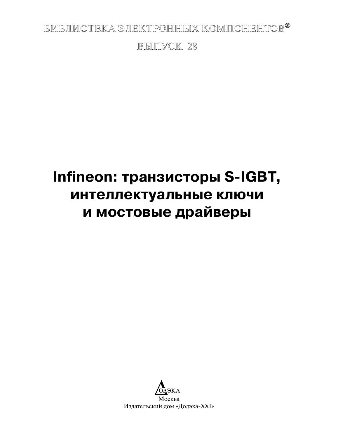 В обзоре приведены краткие описания и технические параметры новых ключевых приборов фирмы «Infineon»: быстродействующих биполярных транзисторов с изолированным затвором (технология NPT IGBT) и DuoPack® семейств S-IGBT, интеллектуальных ключей семейств TEMPFET®, HITFET®, PROFET®, TRILITHIC® и других схем управления исполнительными механизмами. Наряду с новыми приборами в издание включена информация и по относительно старым интеллектуальным ключам, нашедшим широкое применение в действующей аппаратуре. Для радиолюбителей и специалистов, занимающихся разработкой, эксплуатацией и ремонтом радиоэлектронной аппаратуры.