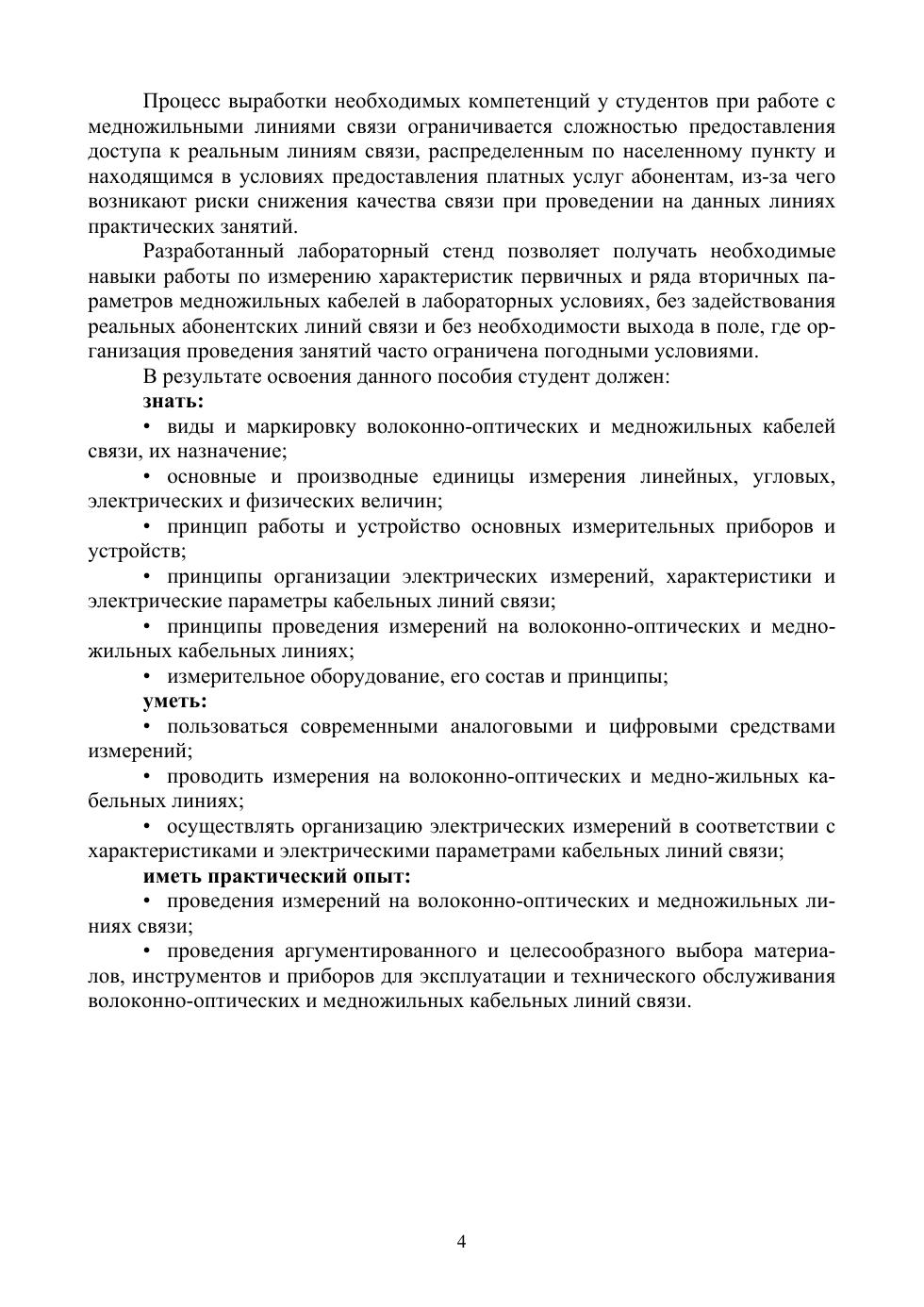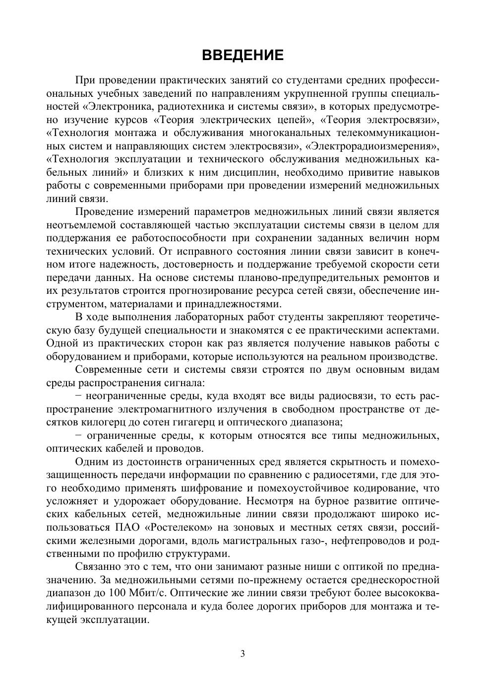 Целью проведения курса лабораторных работ является закрепление теоретических знаний и усвоение основ методики производства практических работ на медножильных кабельных линиях связи. В процессе выполнения лабораторных работ студентами используются современные цифровые измерительные приборы, которые используются в реальных производственных подразделениях отрасли, при проведении плановых профилактических измерений и выявлении повреждений на них в результате оценки электрических характеристик медножильных кабельных линий связи. Соответствует современным требованиям Федерального государственного образовательного стандарта среднего профессионального образования и профессиональным квалификационным требованиям. Практикум предназначен для студентов средних профессиональных учебных заведений, обучающихся по направлениям подготовки укрупненной группы специальностей «Электроника, радиотехника и системы связи». Практикум также может быть использован при проведении курсов повышения квалификации технических работников отрасли связи.