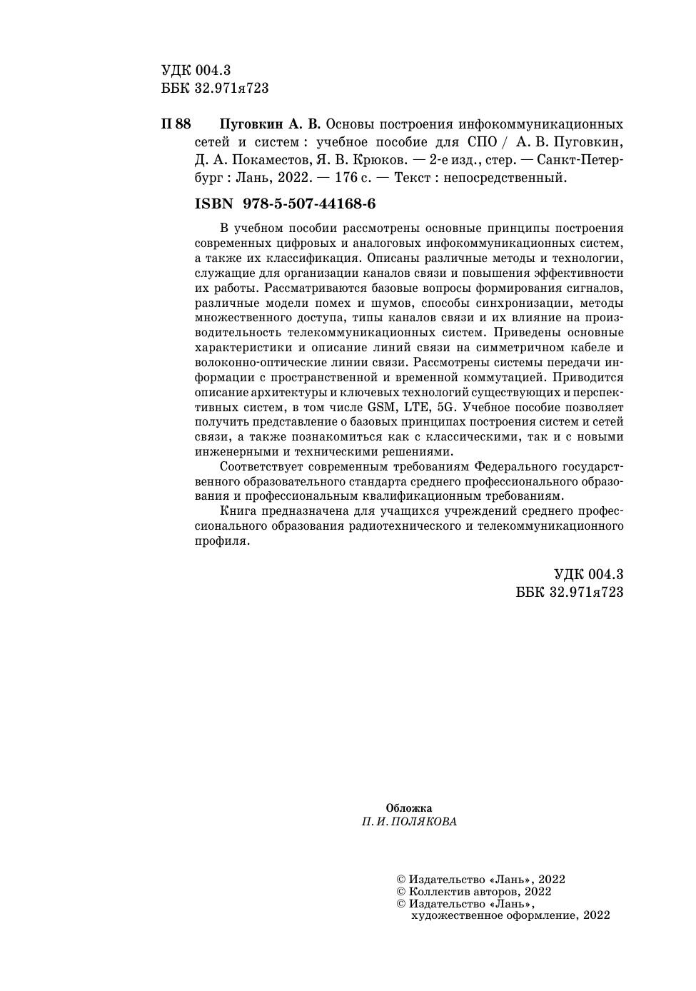 В учебном пособии рассмотрены основные принципы построения современных цифровых и аналоговых инфокоммуникационных систем, а также их классификация. Описаны различные методы и технологии, служащие для организации каналов связи и повышения эффективности их работы. Рассматриваются базовые вопросы формирования сигналов, различные модели помех и шумов, способы синхронизации, методы множественного доступа, типы каналов связи и их влияние на производительность телекоммуникационных систем. Приведены основные характеристики и описание линий связи на симметричном кабеле и волоконнооптические линии связи. Рассмотрены системы передачи информации с пространственной и временной коммутацией. Приводится описание архитектуры и ключевых технологий существующих и перспективных систем, в том числе GSM, LTE, 5G. Учебное пособие позволяет получить представление о базовых принципах построения систем и сетей связи, а также познакомиться с как с классическими, так и с новыми инженерными и техническими решениями. Соответствует современным требованиям Федерального государственного образовательного стандарта среднего профессионального образования и профессиональным квалификационным требованиям. Книга предназначена для учащихся учреждений среднего профессионального образования радиотехнического и телекоммуникационного профиля.