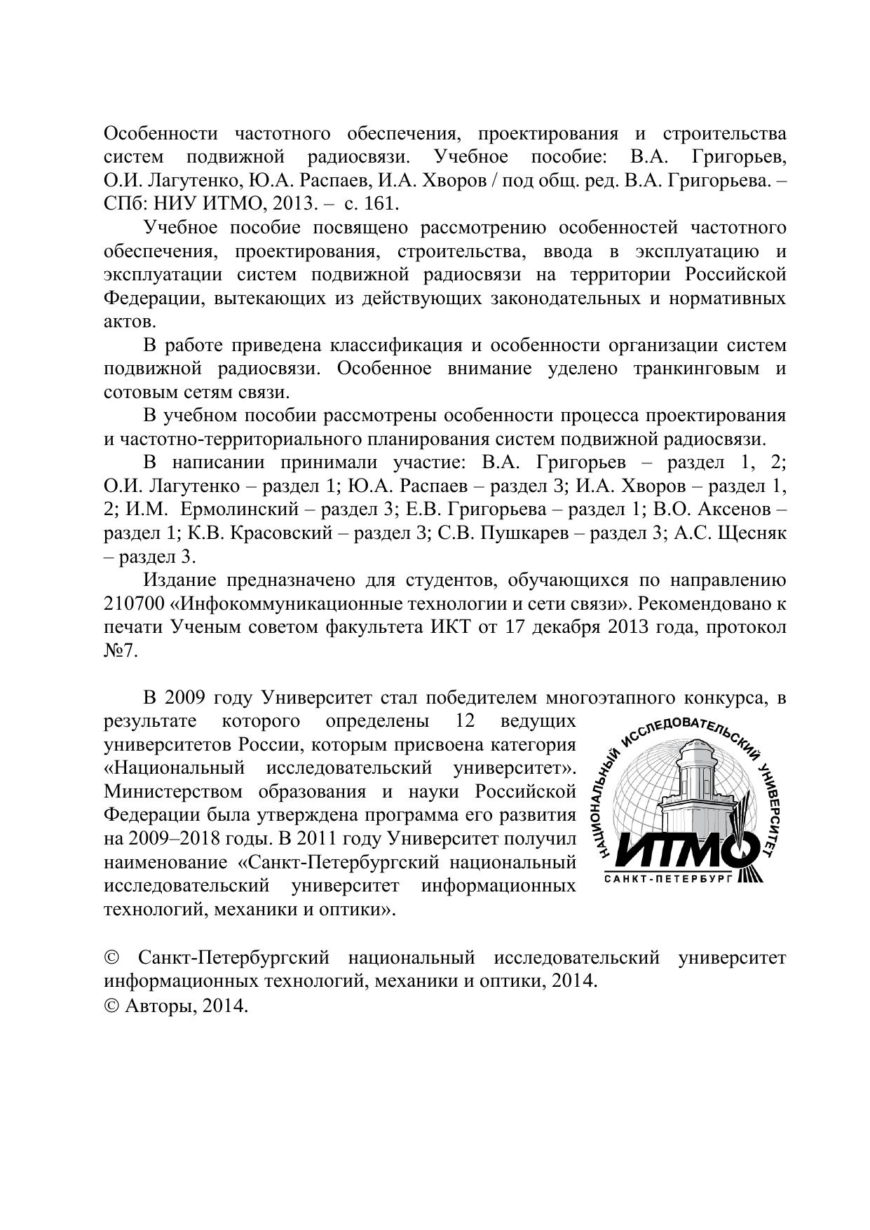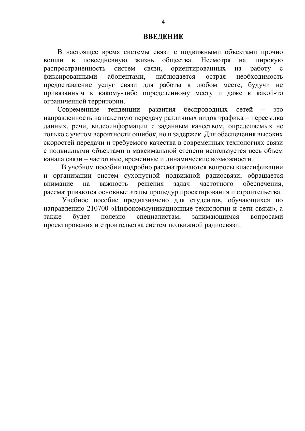 Учебное пособие посвящено рассмотрению особенностей частотного обеспечения, проектирования, строительства, ввода в эксплуатацию и эксплуатации систем подвижной радиосвязи на территории Российской Федерации, вытекающих из действующих законодательных и нормативных актов. В работе приведена классификация и особенности организации систем подвижной радиосвязи. Особенное внимание уделено транкинговым и сотовым сетям связи. В учебном пособии рассмотрены особенности процесса проектирования и частотно-территориального планирования систем подвижной радиосвязи. В написании принимали участие: В.А. Григорьев – раздел 1, 2 О.И. Лагутенко – раздел 1 Ю.А. Распаев – раздел 3 И.А. Хворов – раздел 1,2 И.М. Ермолинский – раздел 3 Е.В. Григорьева – раздел 1 В.О. Аксенов – раздел 1 К.В. Красовский – раздел 3 С.В. Пушкарев – раздел 3 А.С. Щесняк – раздел 3. Издание предназначено для студентов, обучающихся по направлению 210700 «Инфокоммуникационные технологии и сети связи».