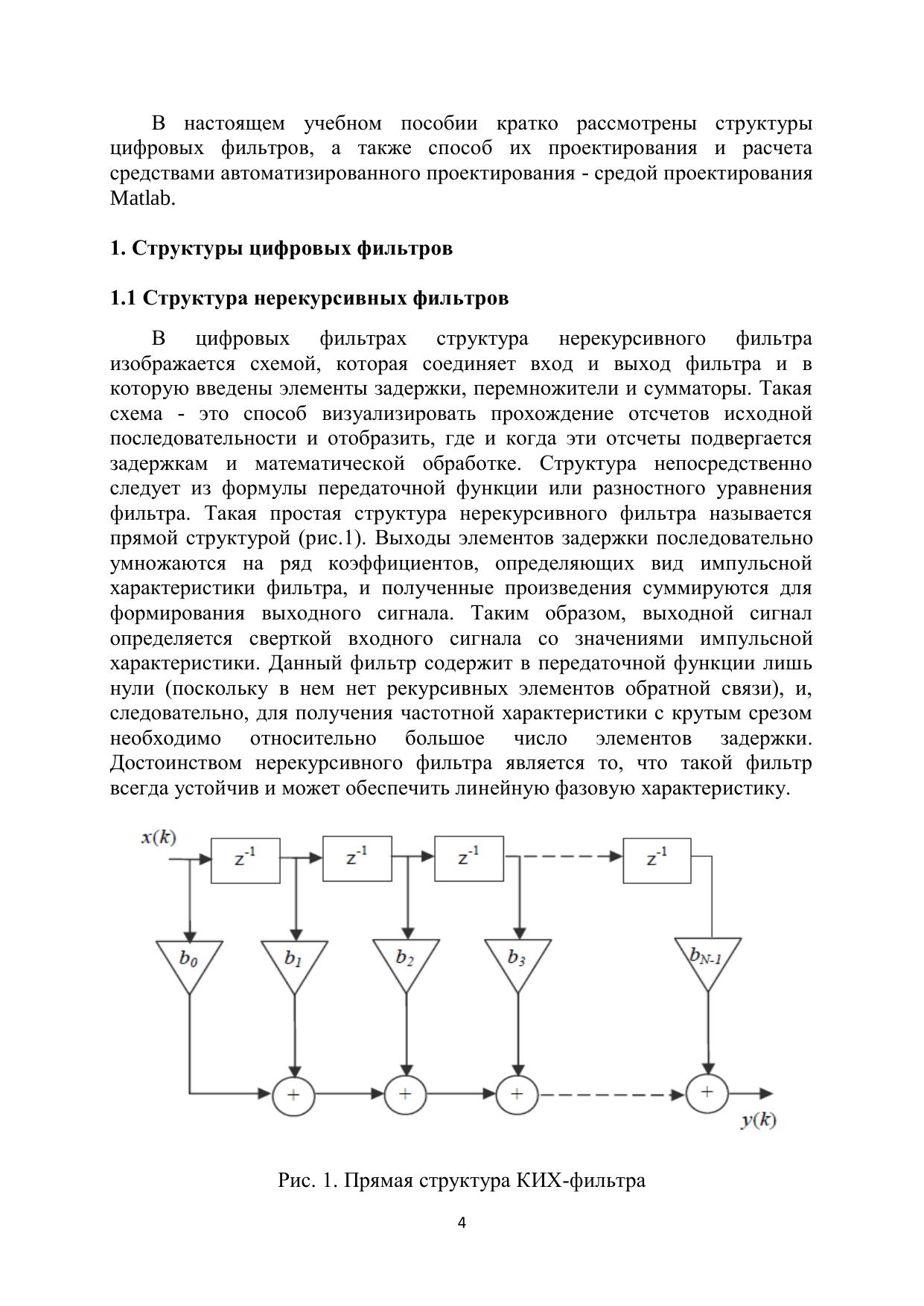 В учебном пособии кратко рассмотрены структуры цифровых фильтров, а также способ их проектирования и расчета средствами автоматизированного проектирования - средой проектирования Matlab. Учебной пособие адресовано студентам бакалавриата и магистрантам, обучающихся по направлению 210700 Инфокоммуникационные технологии и системы связи» и изучающим курс «Цифровая обработка сигналов»