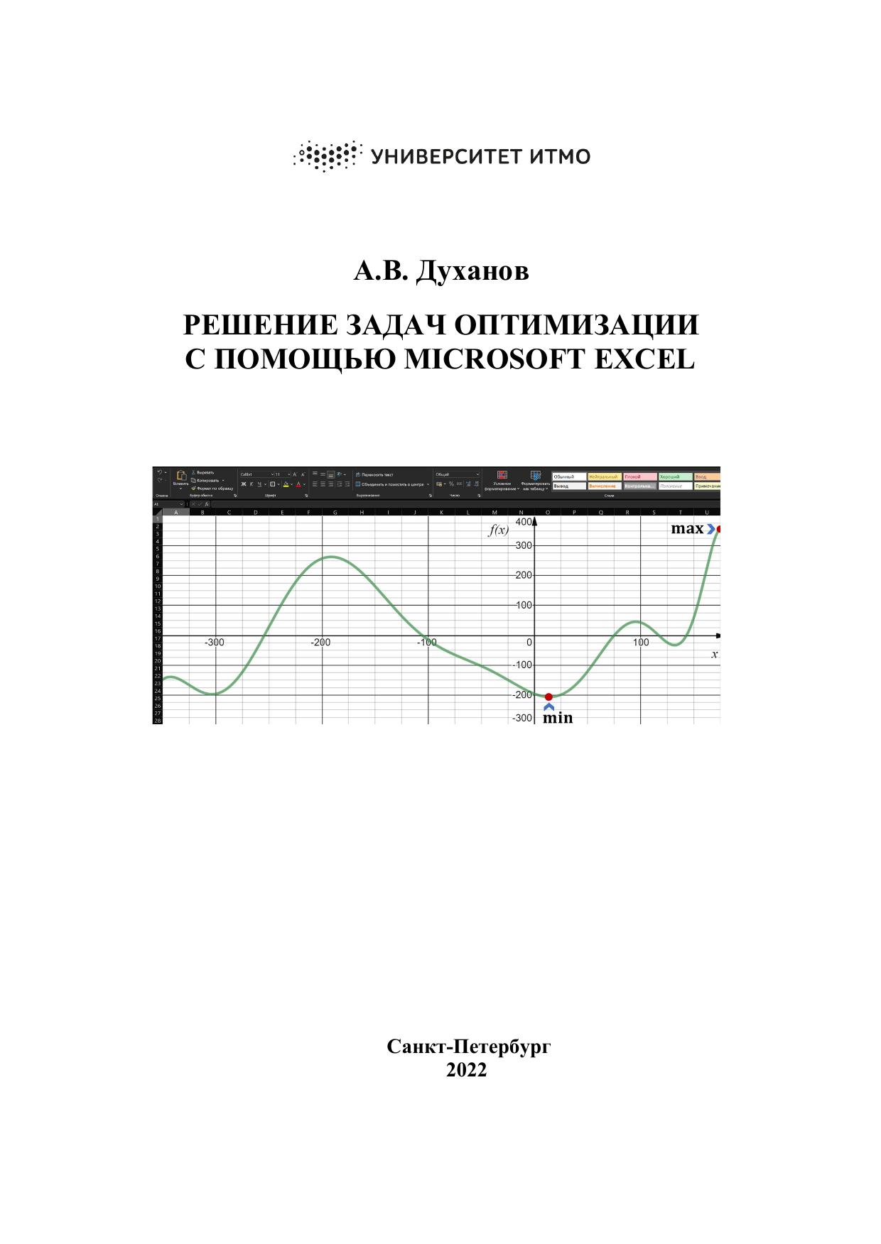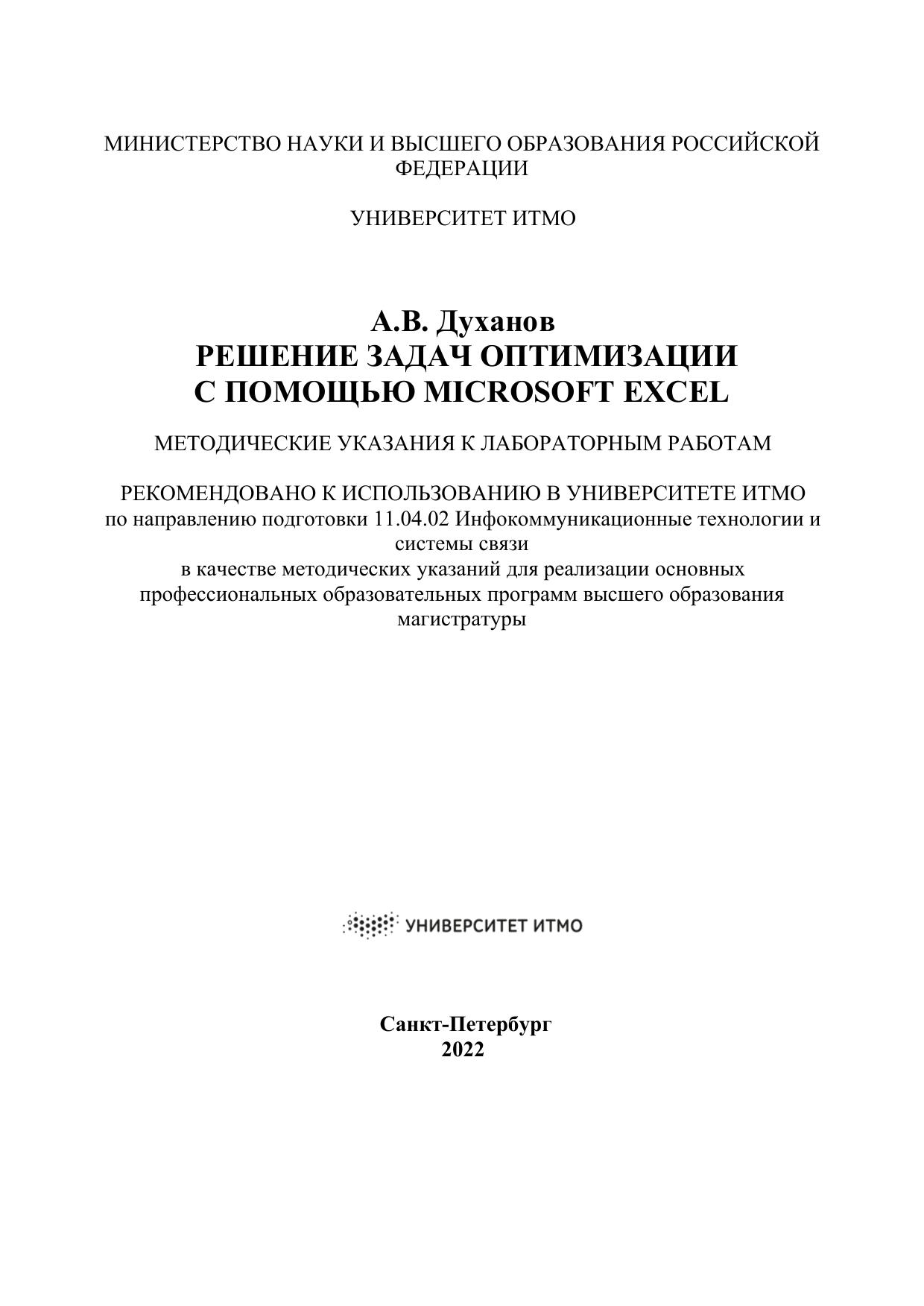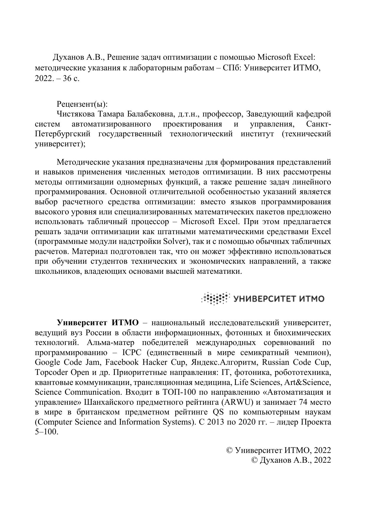 Методические указания предназначены для формирования представлений и навыков применения численных методов оптимизации. В них рассмотрены методы оптимизации одномерных функций, а также решение задач линейного программирования. Основной отличительной особенностью указаний является выбор расчетного средства оптимизации: вместо языков программирования высокого уровня или специализированных математических пакетов предложено использовать табличный процессор – Microsoft Excel. При этом предлагается решать задачи оптимизации как штатными математическими средствами Excel (программные модули надстройки Solver), так и с помощью обычных табличных расчетов. Материал подготовлен так, что он может эффективно использоваться при обучении студентов технических и экономических направлений, а также школьников, владеющих основами высшей математики