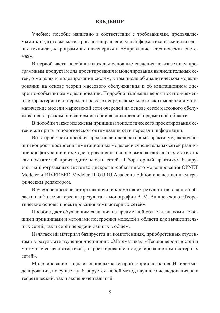 Представлены общие сведения об известных программных продуктах, используемых в предметной области, вероятностно-временные характеристики передачи на базе непрерывных марковских моделей, основные результаты теории массового обслуживания, принципы создания имитационных моделей на основе дискретно-событийного моделирования и принципы топологического проектирования сетей. Приводятся примеры, демонстрирующие возможности применения рассмотренных методов моделирования.