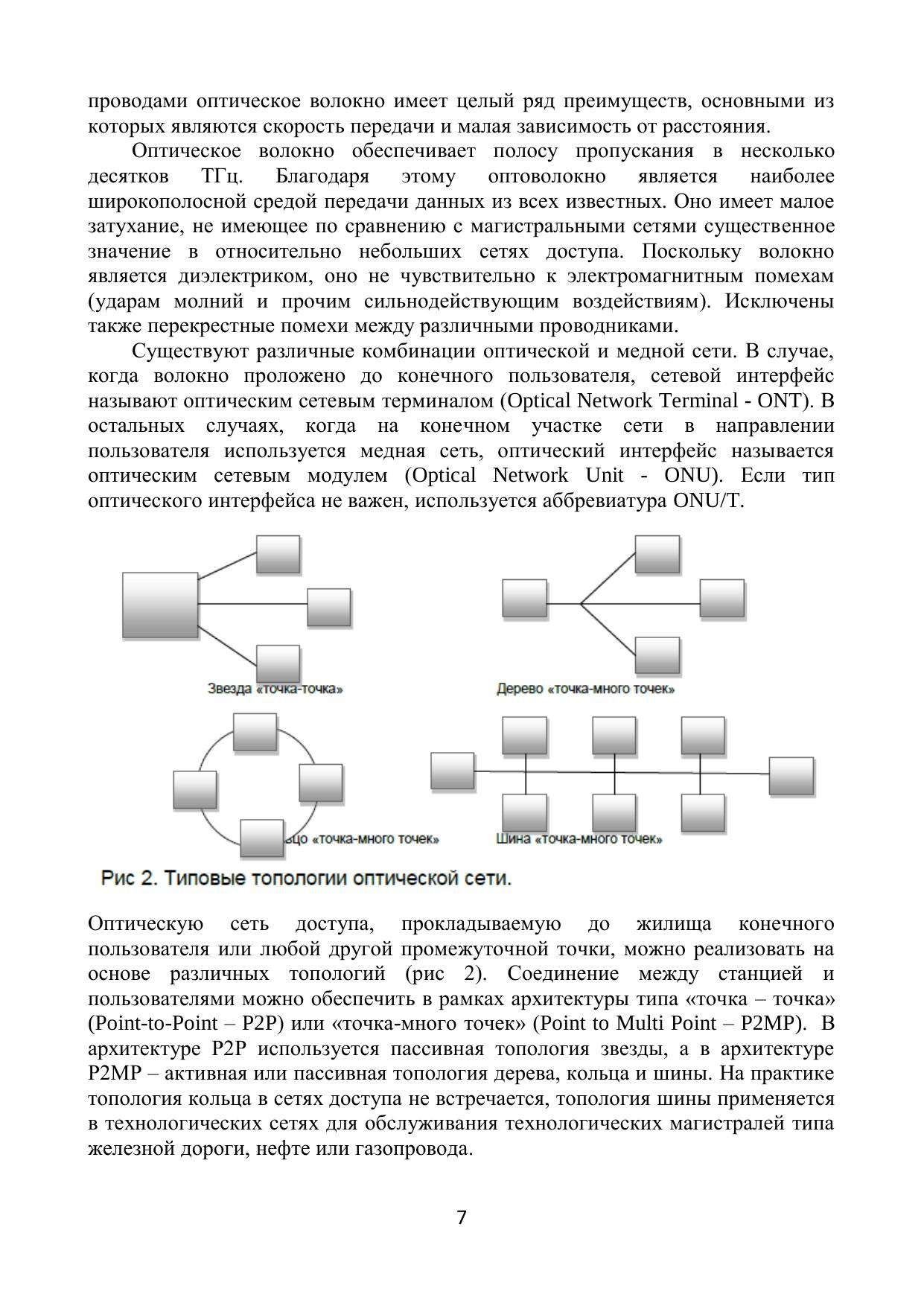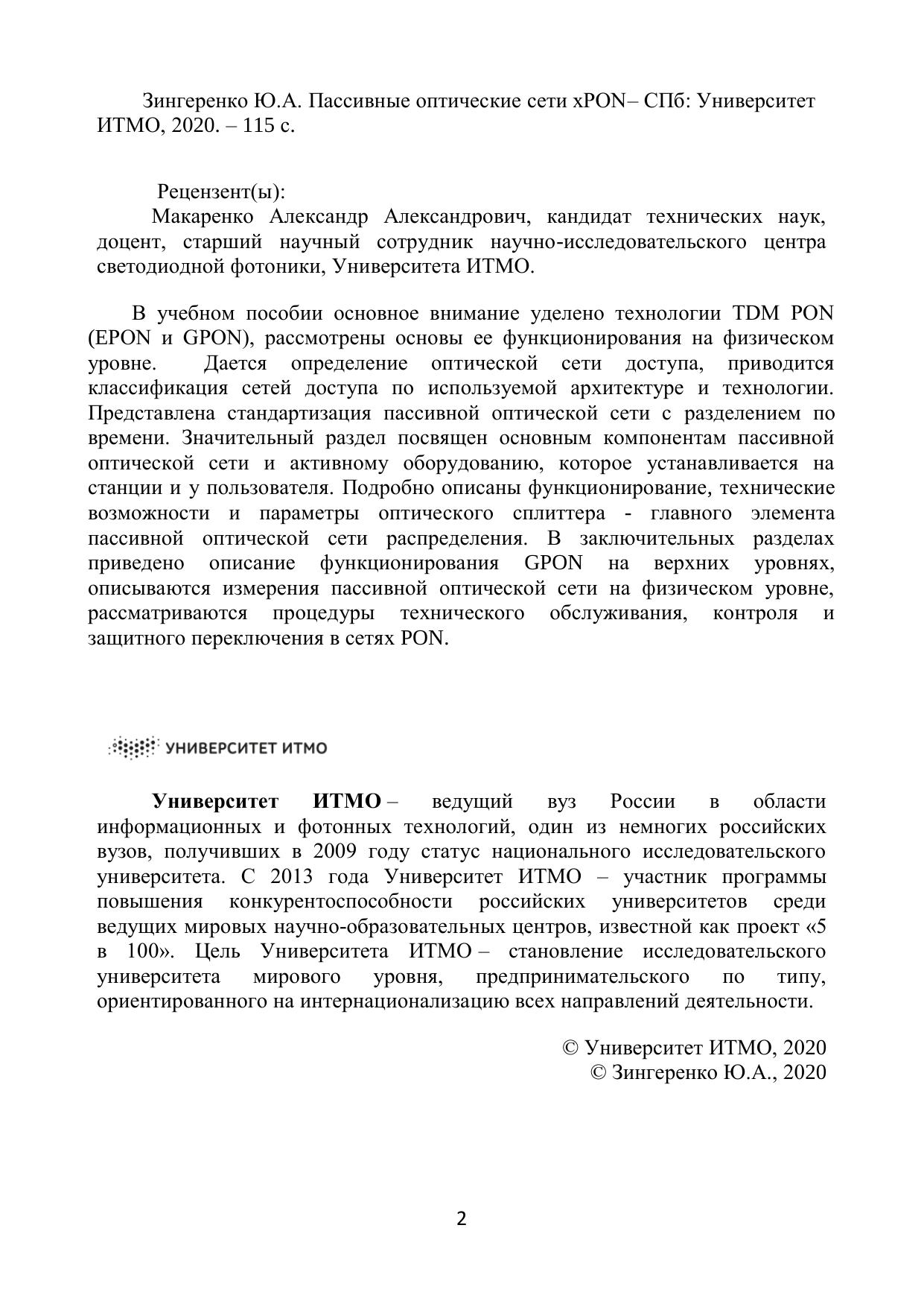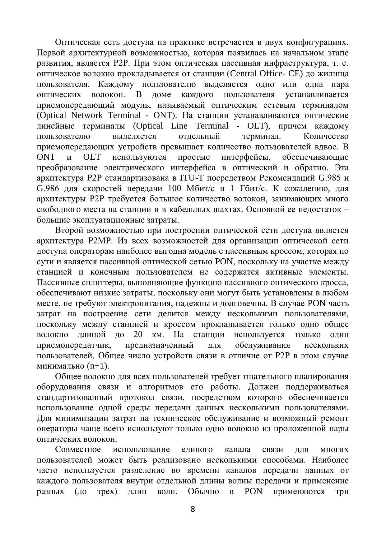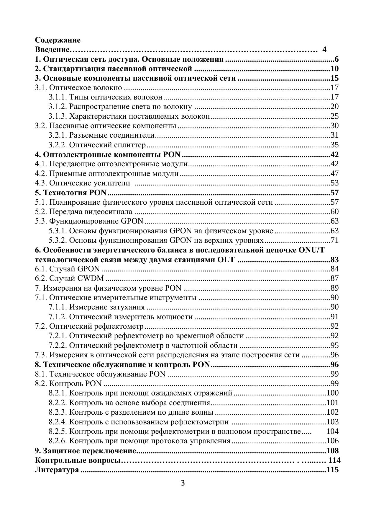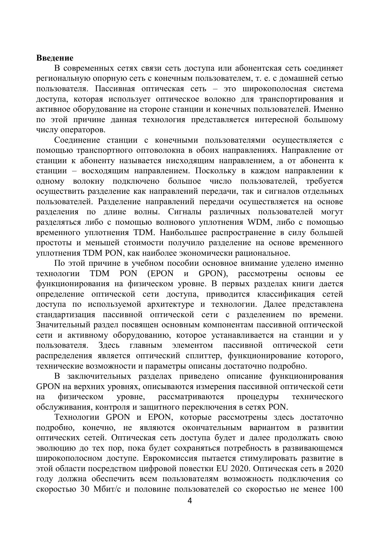 В учебном пособии основное внимание уделено технологии TDM PON (EPON и GPON), рассмотрены основы ее функционирования на физическом уровне. Дается определение оптической сети доступа, приводится классификация сетей доступа по используемой архитектуре и технологии. Представлена стандартизация пассивной оптической сети с разделением по времени. Значительный раздел посвящен основным компонентам пассивной оптической сети и активному оборудованию, которое устанавливается на станции и у пользователя. Подробно описаны функционирование, технические возможности и параметры оптического сплиттера - главного элемента пассивной оптической сети распределения. В заключительных разделах приведено описание функционирования GPON на верхних уровнях, описываются измерения пассивной оптической сети на физическом уровне, рассматриваются процедуры технического обслуживания, контроля и защитного переключения в сетях PON.