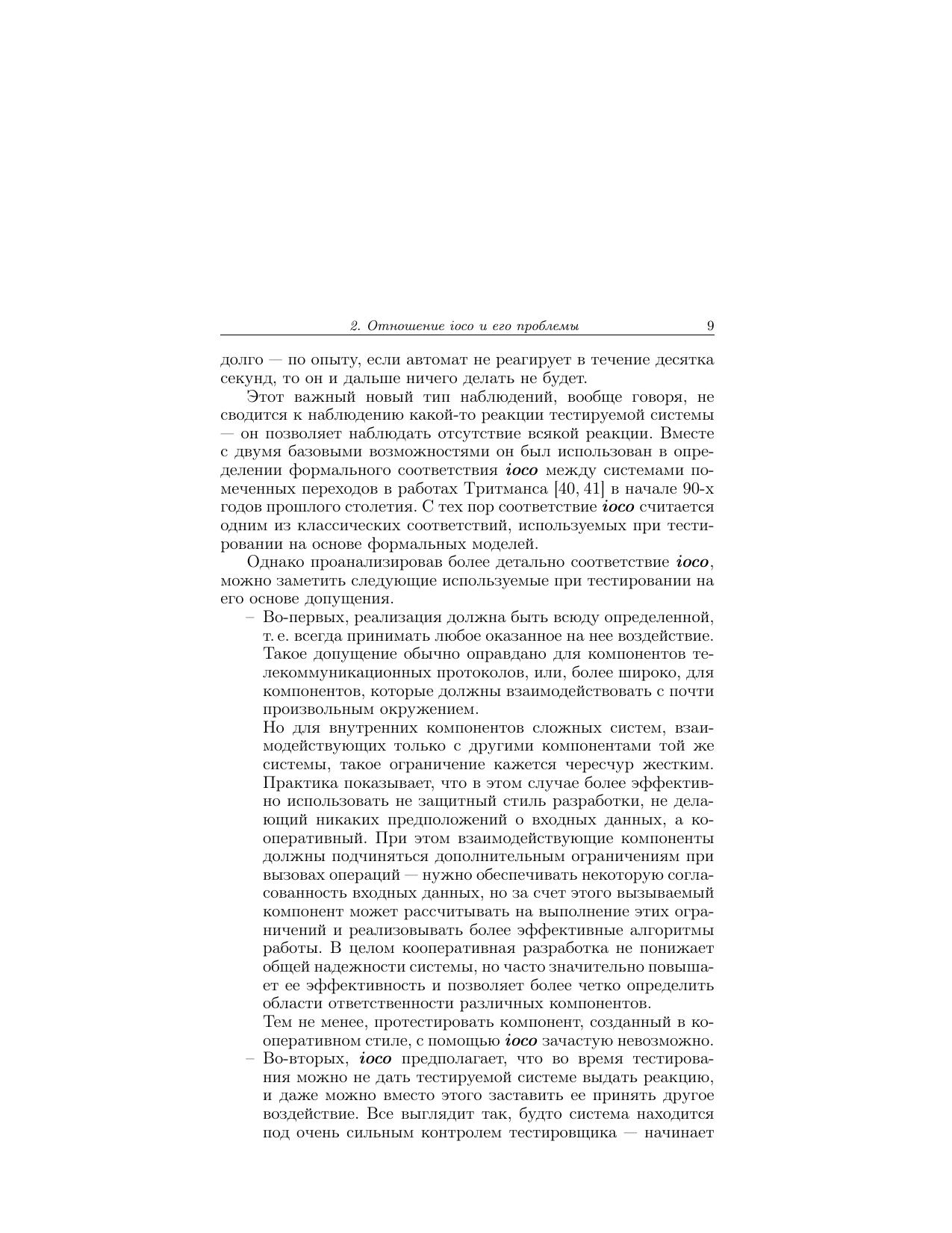 В работе изучается тестирование соответствия систем, в которых возможна блокировка (приёма) стимулов и разрушение системы. Дивергенция также моделируется разрушением. В качестве соответствия предлагается отношение ioco_beta gamma delta - обобщение отношения ioco (Input-Output COnformance). Для того чтобы избегать разрушения реализации при тестировании, отношение строится только на безопасных трассах, которые не могут привести к разрушению. Предлагается гипотеза о безопасности, определяющая класс реализаций, которые можно тестировать на соответствие заданной спецификации. Рассматриваются два вида моделей: трассовые модели и система переходов (Labelled Transion System), и показывается их эквивалентность. Описывается генерация тестов и её алгоритмизация. Рассматриваются различные виды пополнения спецификаций частично-определённых по стимулам. Сравниваются семантики отношений ioco и ioco_beta gamma delta . Рассматривается проблема несохранения соответствия при композиции и предлагается её решение с помощью монотонного преобразования спецификаций. Излагается общая теория монотонности соответствия и определяются достаточные условия монотонности. Предлагаются монотонные преобразования для общего случая и для подклассов без блокировок и/или разрушения. Рассматриваются проблемы алгоритмизации преобразований и композиции и описываются соответствующие алгоритмы.