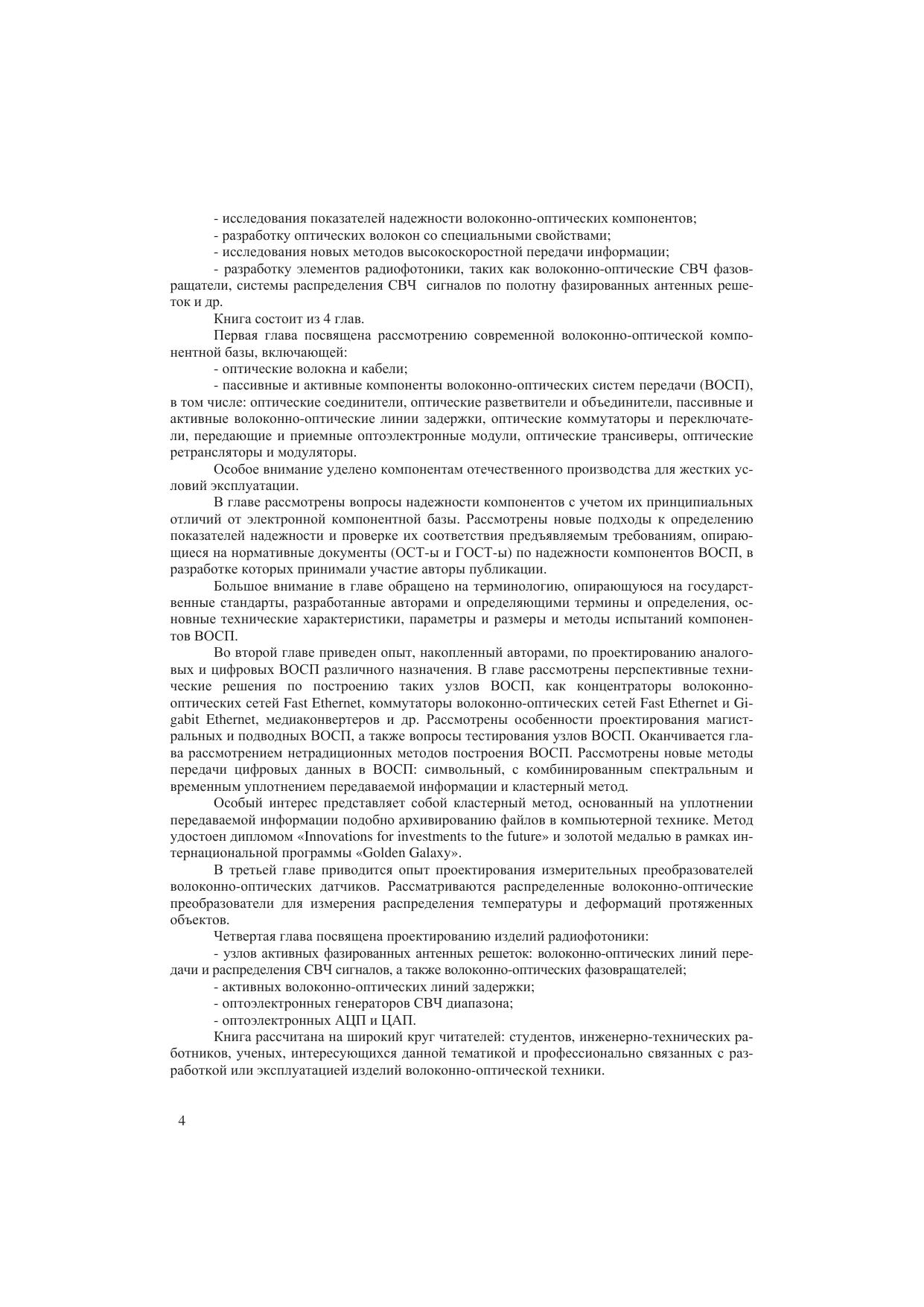 Рассмотрена отечественная волоконно-оптическая компонентная база, предназначенная для жестких условий эксплуатации. Приведены основные технические характеристики волоконно-оптических компонентов и методы их измерения. Предложены методы контроля параметров безотказности с учетом принципиальных отличий волоконно-оптических компонентов от электронных. Даны практические рекомендации по построению традиционных и оригинальных цифровых волоконно-оптических систем и их элементов.