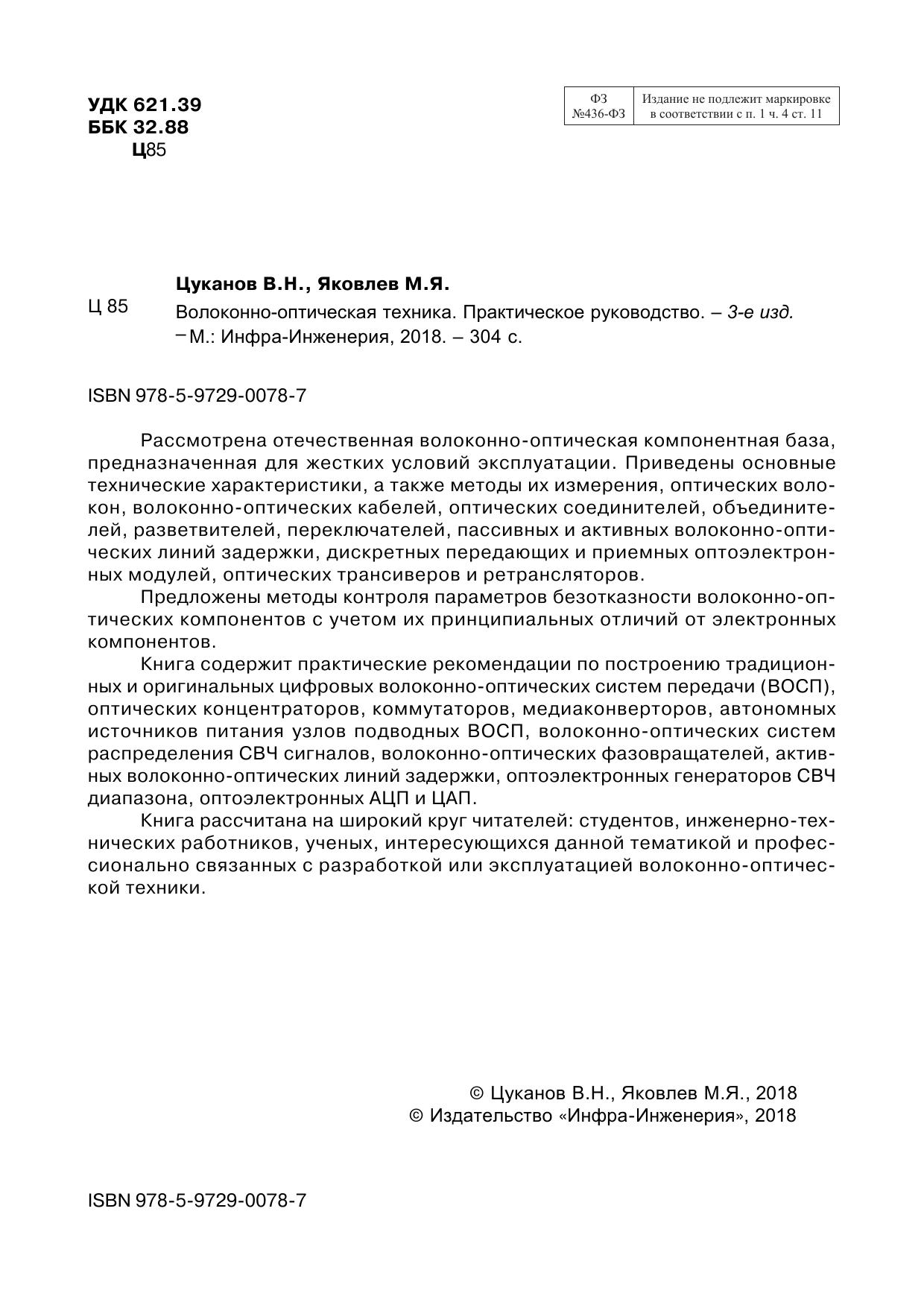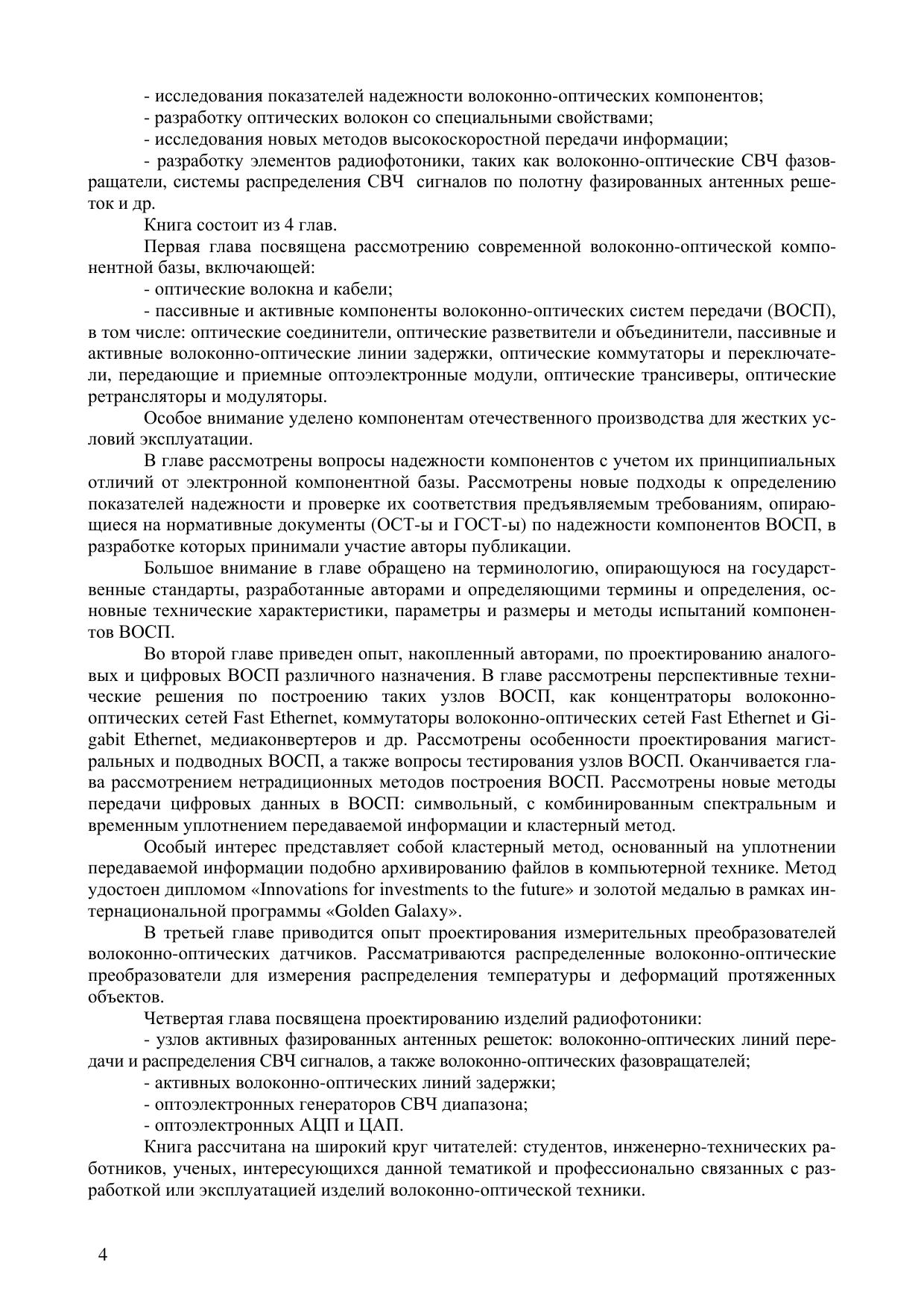 Книга содержит практические рекомендации по построению традиционных и оригинальных цифровых волоконно-оптических систем передачи (ВОСП), оптических концентраторов, коммутаторов, медиаконверторов, автономных источников питания узлов подводных ВОСП, волоконно-оптических систем распределения СВЧ сигналов, волоконно-оптических фазовращателей, активных волоконно-оптических линий задержки, оптоэлектронных генераторов СВЧ диапазона, оптоэлектронных АЦП и ЦАП