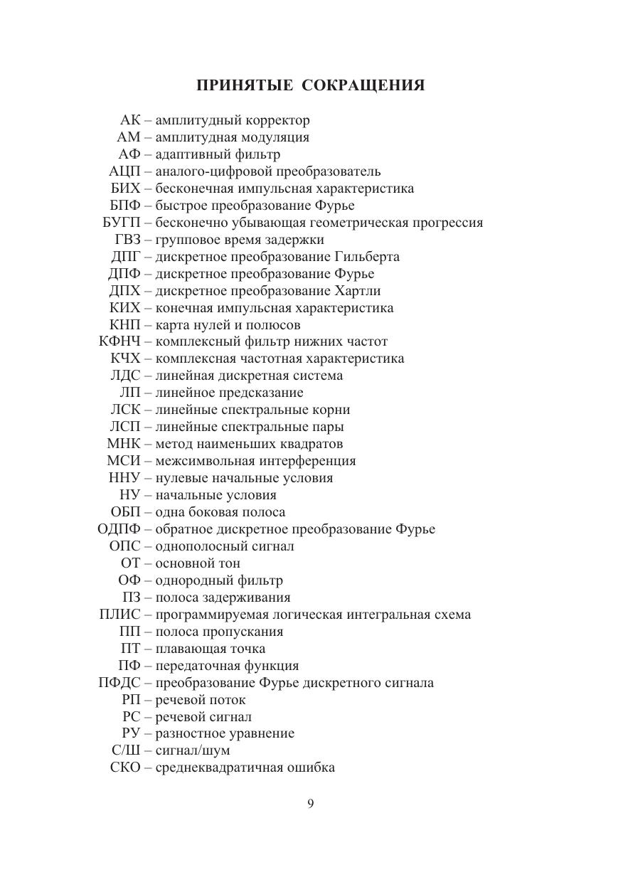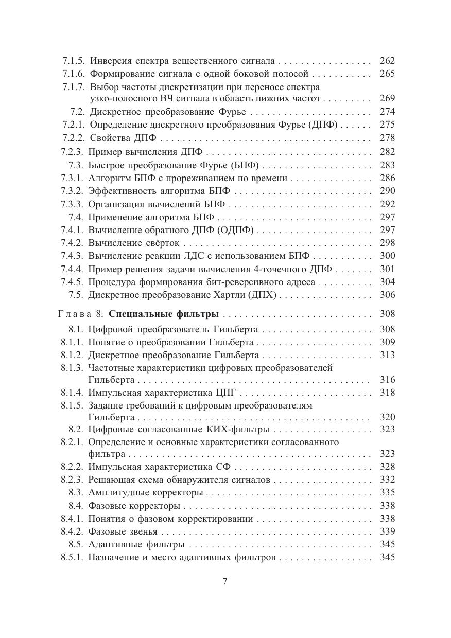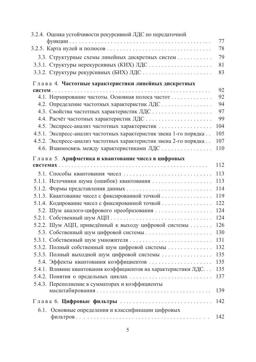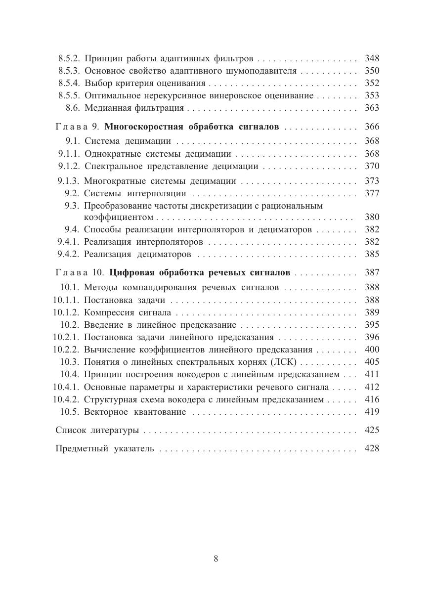 Рассматривается обобщённая схема цифровой обработки аналогового сигнала, понятие режима реального времени, понятие нормированного времени, изучаются типовые дискретные сигналы. Дано описание линейных дискретных систем (ЛДС) во временнóй области: свойства, условия физической реализуемости, разностные уравнения, рекурсивные и нерекурсивные ЛДС. Приводится пример экспресс-анализа частотных характеристик, устанавливается взаимосвязь между временными, операторными и частотными характеристиками ЛДС. Изучается арифметика и квантование чисел в цифровых системах. Даются основы цифрового спектрального анализа. Исследуется дискретизация относительно узкополосных сигналов, преобразования спектра, изучается дискретное преобразование Фурье. Изложен принцип организации многоскоростной обработки сигналов: однократных и многократных систем децимации и интерполяции, а также способы реализации интерполяторов и дециматоров. Изучаются методы компандирования речевых сигналов.