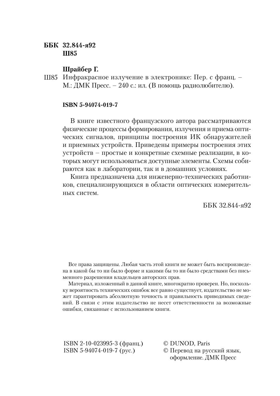 В книге известного французского автора рассматриваются физические процессы формирования, излучения и приема оптических сигналов, принципы построения ИК обнаружителей и приемных устройств. Приведены примеры построения этих устройств – простые и конкретные схемные реализации, в которых могут использоваться доступные элементы. Схемы собираются как в лаборатории, так и в домашних условиях. Книга предназначена для инженерно-технических работников, специализирующихся в области оптических измерительных систем.