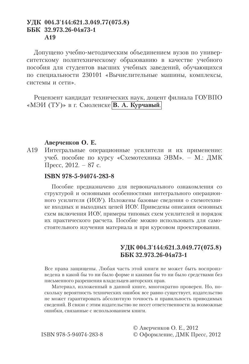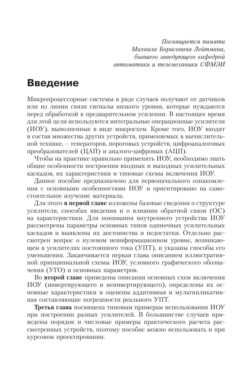 Пособие предназначено для первоначального ознакомления со структурой и основными особенностями интегрального операционного усилителя (ИОУ). Изложены базовые сведения о схемотехнике входных и выходных цепей ИОУ. Приведены описания основных схем включения ИОУ, примеры типовых схем усилителей и порядок их практического расчета. Пособие можно использовать для самостоятельного изучения материала и при курсовом проектировании.