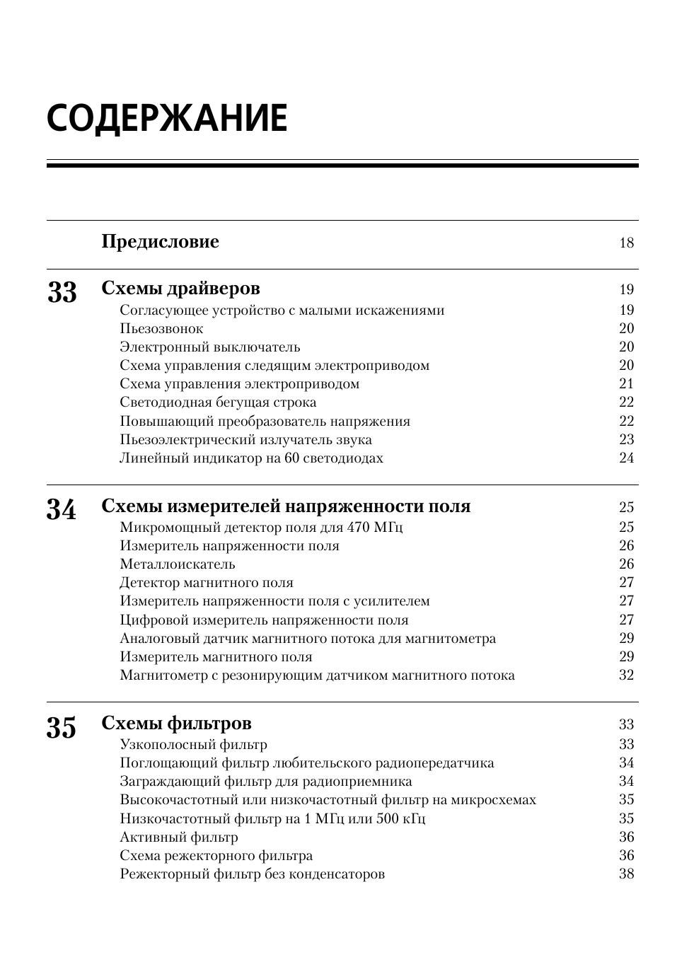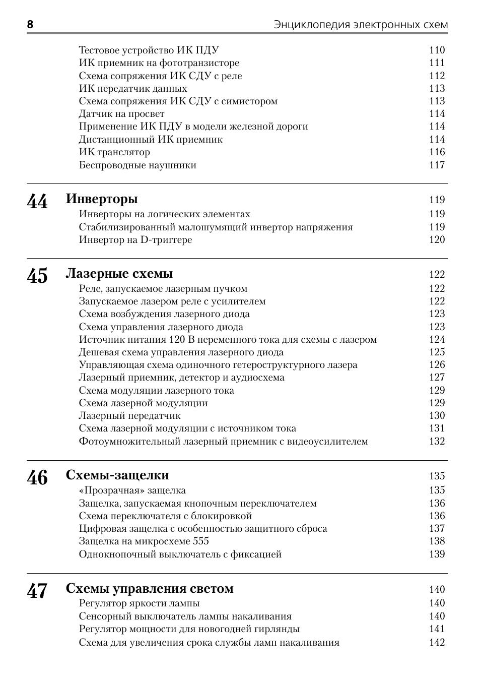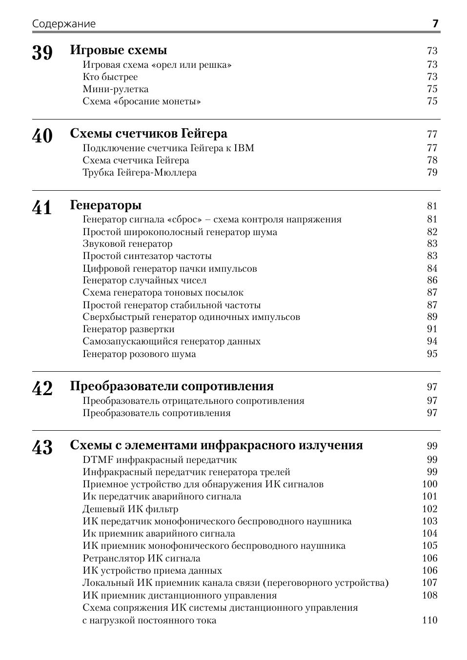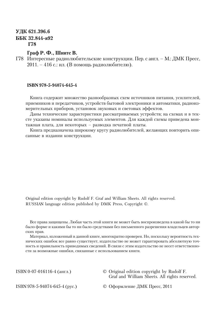 Книга содержит множество разнообразных схем источников питания, усилителей, приемников и передатчиков, устройств бытовой электроники и автоматики, радиоизмерительных приборов, установок звуковых и световых эффектов. Даны технические характеристики рассматриваемых устройств, на схемах и в тексте указаны номиналы используемых элементов. Для каждой схемы приведена монтажная плата, для некоторых – разводка печатной платы. Книга предназначена широкому кругу радиолюбителей, желающих повторить описанные в издании конструкции.