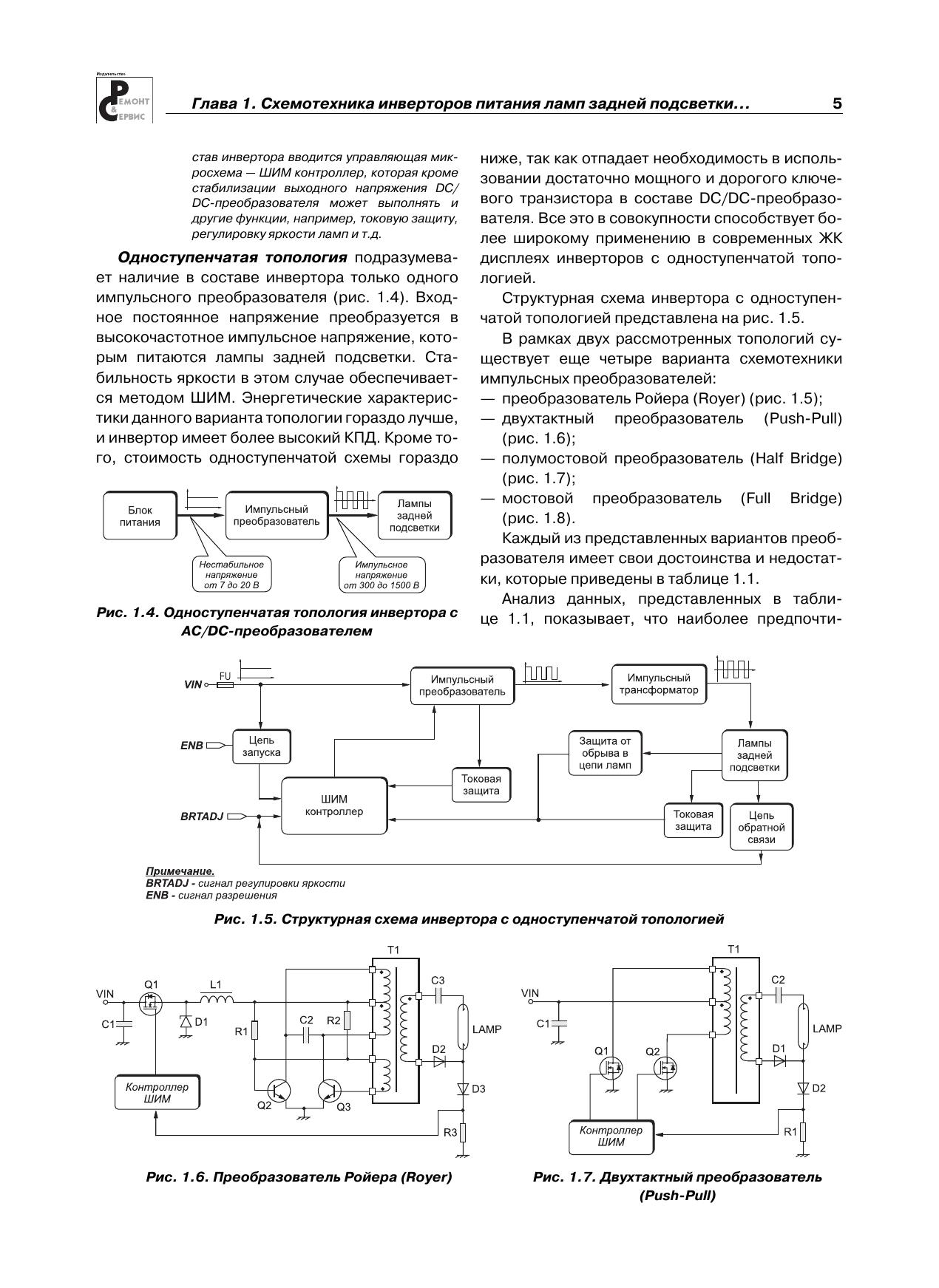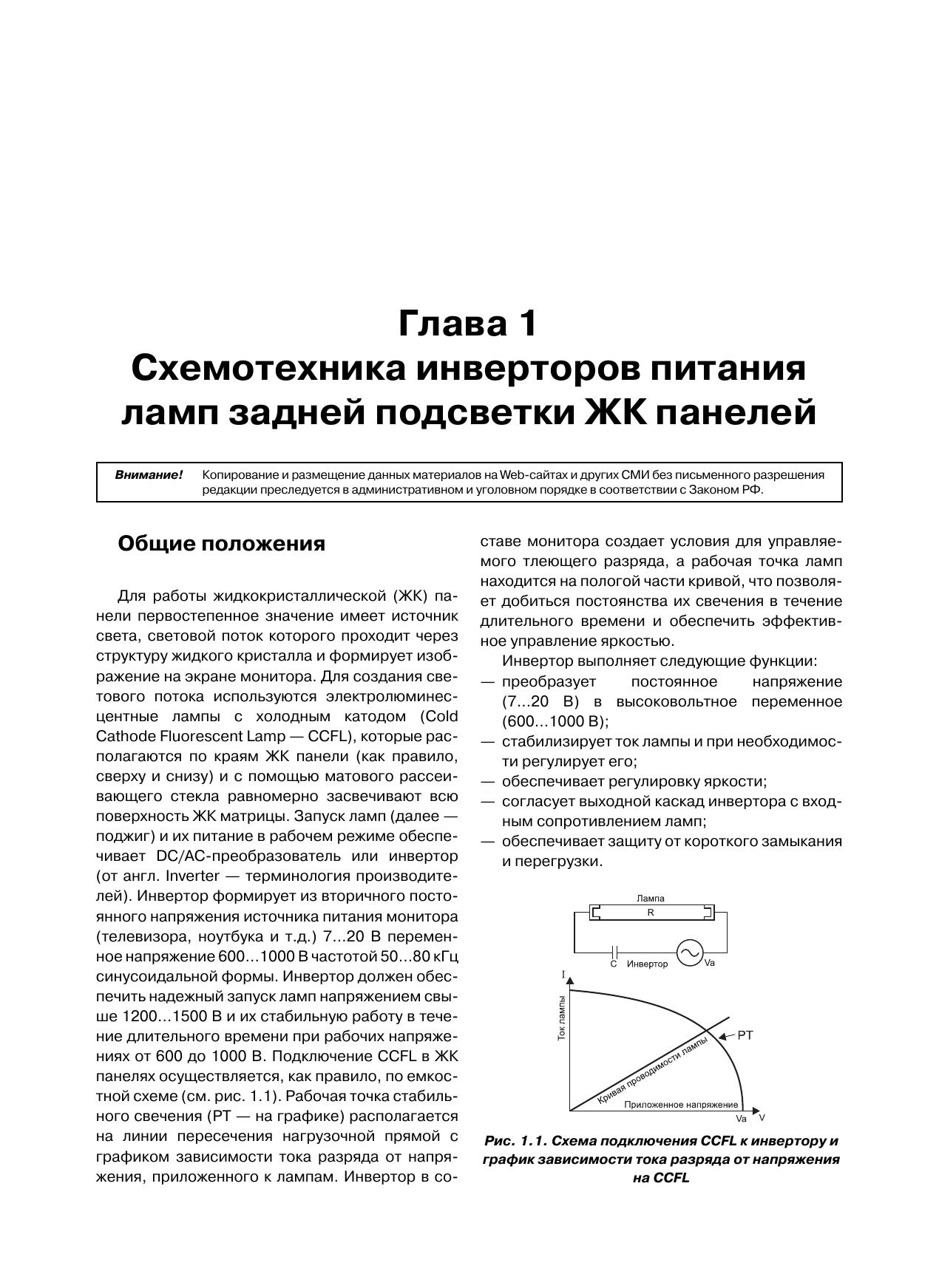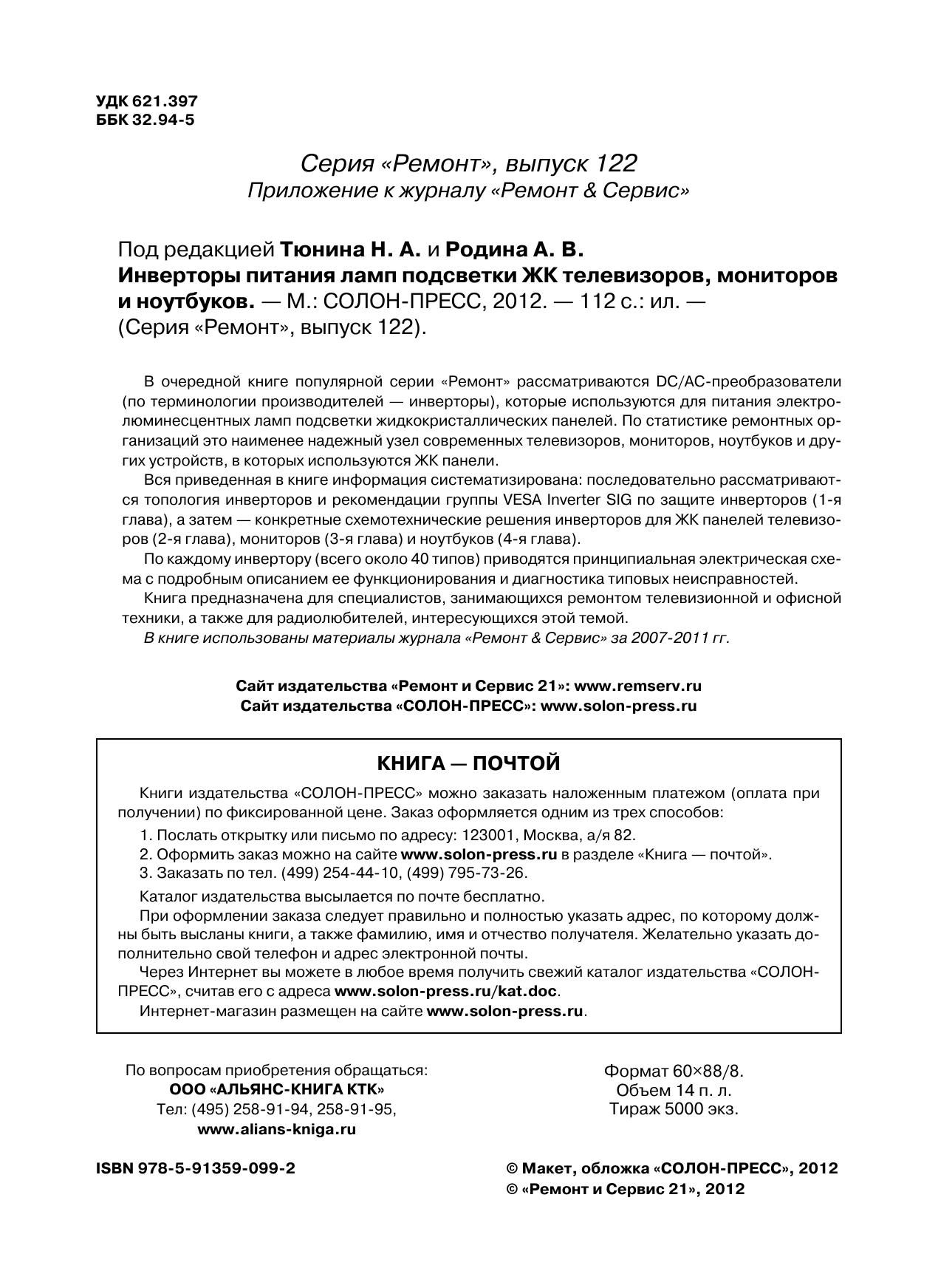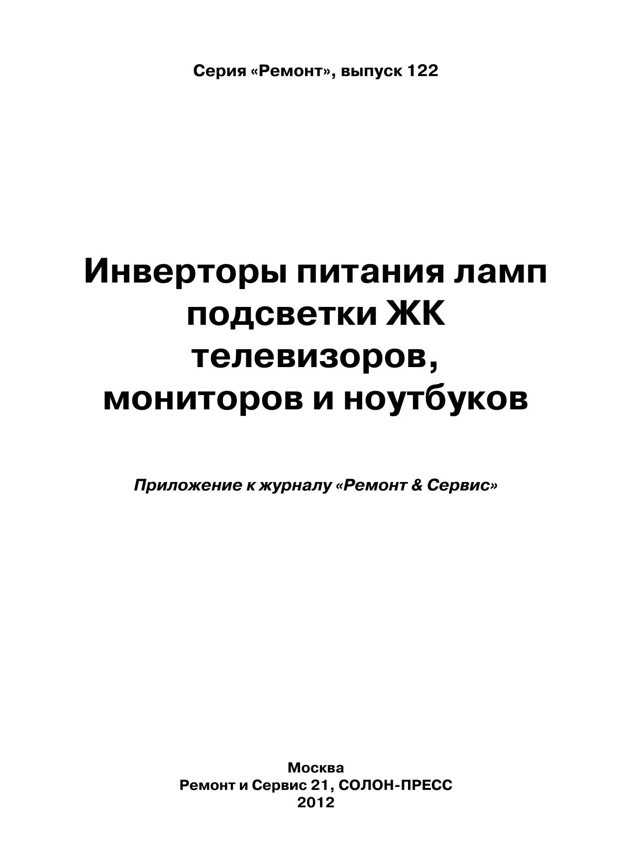 В очередной книге популярной серии «Ремонт» рассматриваются DC/AC-преобразователи (по терминологии производителей — инверторы), которые используются для питания электролюминесцентных ламп подсветки жидкокристаллических панелей. По статистике ремонтных организаций это наименее надежный узел современных телевизоров, мониторов, ноутбуков и других устройств, в которых используются ЖК панели.Вся приведенная в книге информация систематизирована: последовательно рассматриваются топология инверторов и рекомендации группы VESA Inverter SIG по защите инверторов (1-я глава), а затем — конкретные схемотехнические решения инверторов для ЖК панелей телевизоров (2-я глава), мониторов (3-я глава) и ноутбуков (4-я глава).По каждому инвертору (всего около 40 типов) приводятся принципиальная электрическая схема с подробным описанием ее функционирования и диагностика типовых неисправностей.Книга предназначена для специалистов, занимающихся ремонтом телевизионной и офисной техники, а также для радиолюбителей, интересующихся этой темой.В книге использованы материалы журнала «Ремонт & Сервис» за 2007-2011 гг.