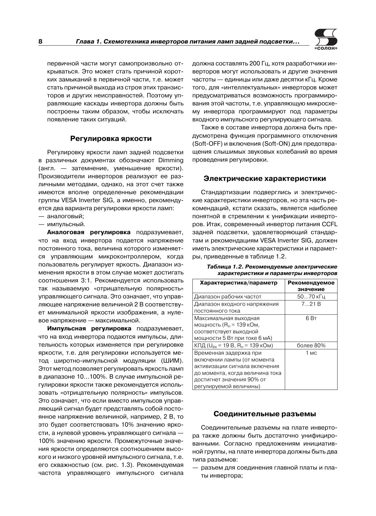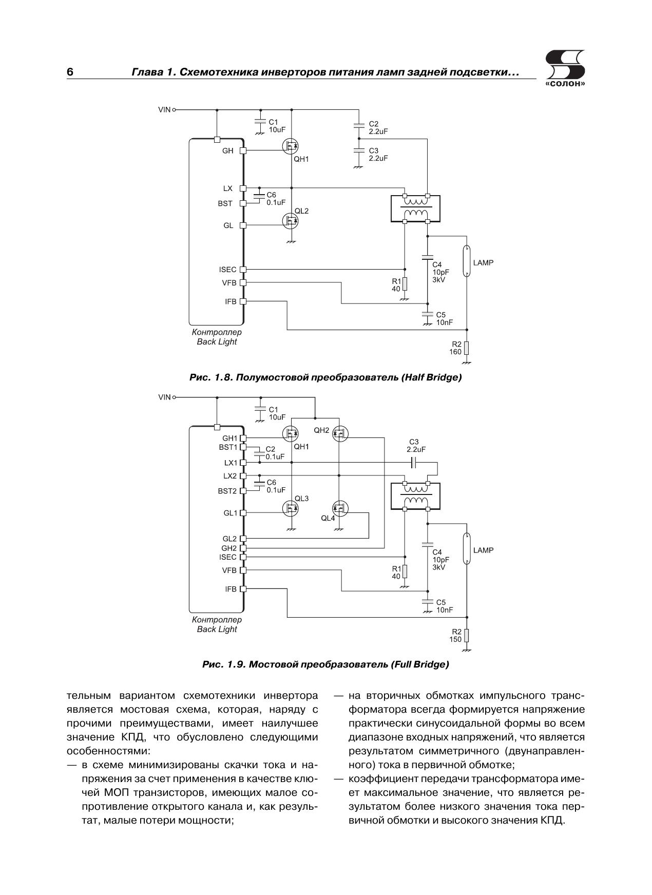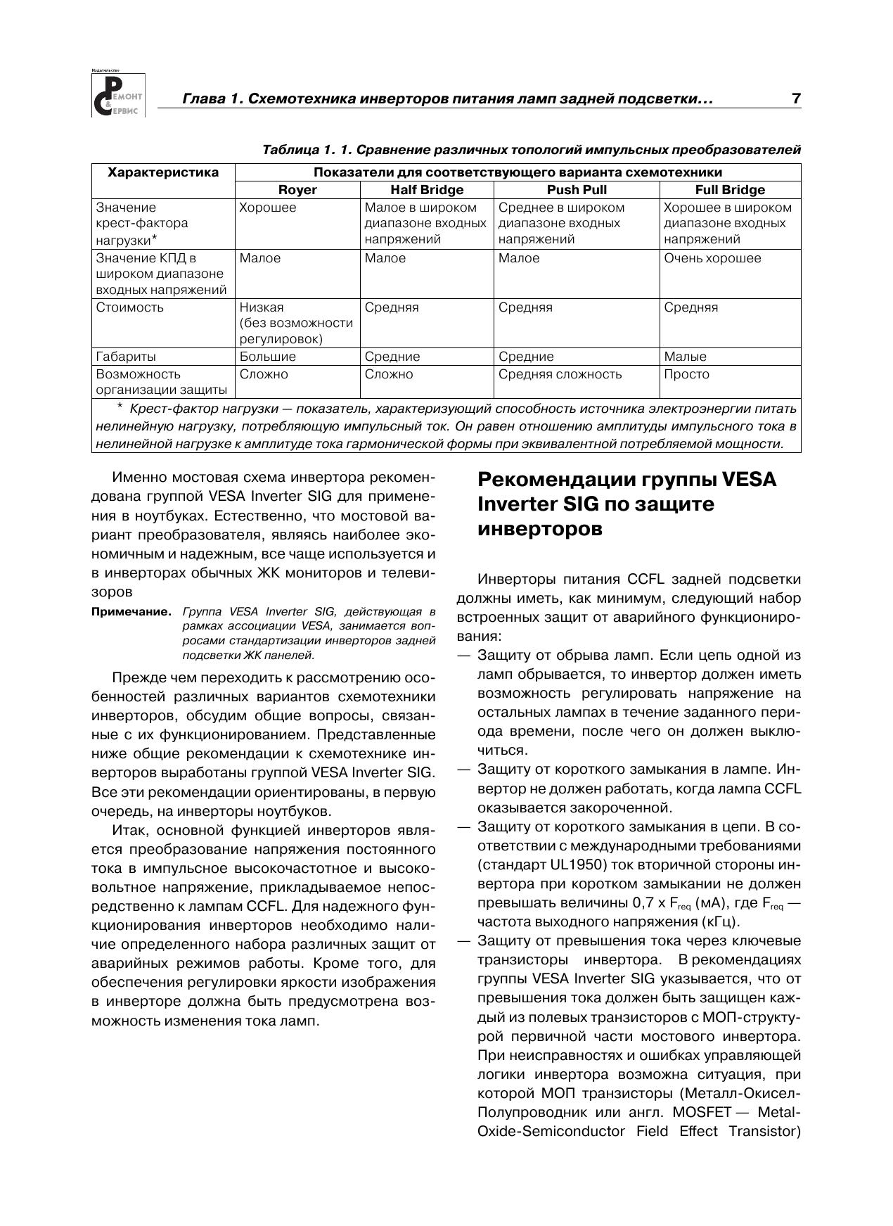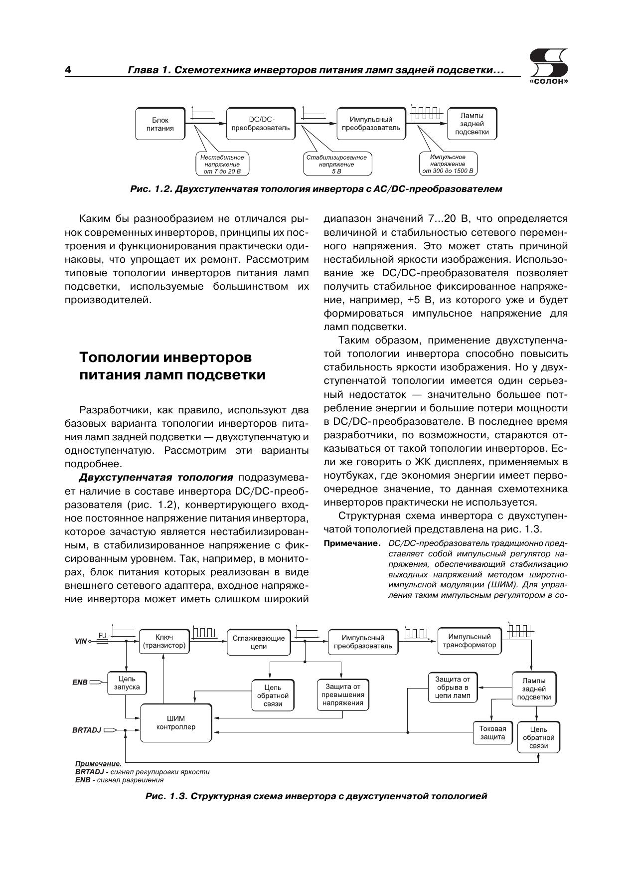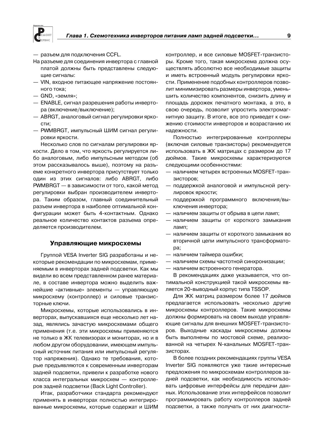 В очередной книге популярной серии «Ремонт» рассматриваются DC/AC-преобразователи (по терминологии производителей — инверторы), которые используются для питания электролюминесцентных ламп подсветки жидкокристаллических панелей. По статистике ремонтных организаций это наименее надежный узел современных телевизоров, мониторов, ноутбуков и других устройств, в которых используются ЖК панели.Вся приведенная в книге информация систематизирована: последовательно рассматриваются топология инверторов и рекомендации группы VESA Inverter SIG по защите инверторов (1-я глава), а затем — конкретные схемотехнические решения инверторов для ЖК панелей телевизоров (2-я глава), мониторов (3-я глава) и ноутбуков (4-я глава).По каждому инвертору (всего около 40 типов) приводятся принципиальная электрическая схема с подробным описанием ее функционирования и диагностика типовых неисправностей.Книга предназначена для специалистов, занимающихся ремонтом телевизионной и офисной техники, а также для радиолюбителей, интересующихся этой темой.В книге использованы материалы журнала «Ремонт & Сервис» за 2007-2011 гг.