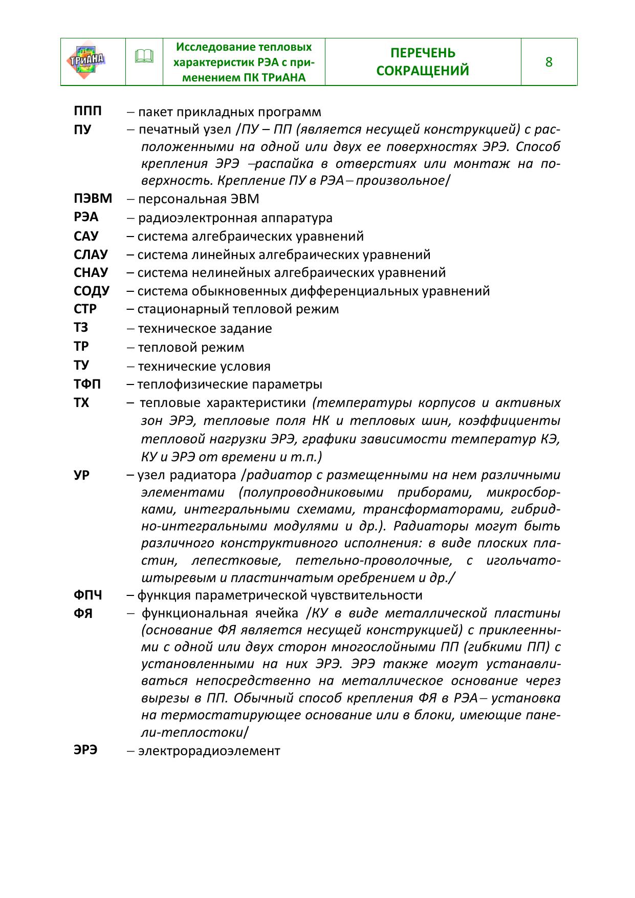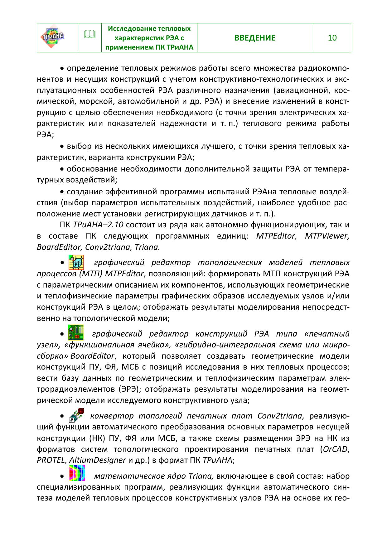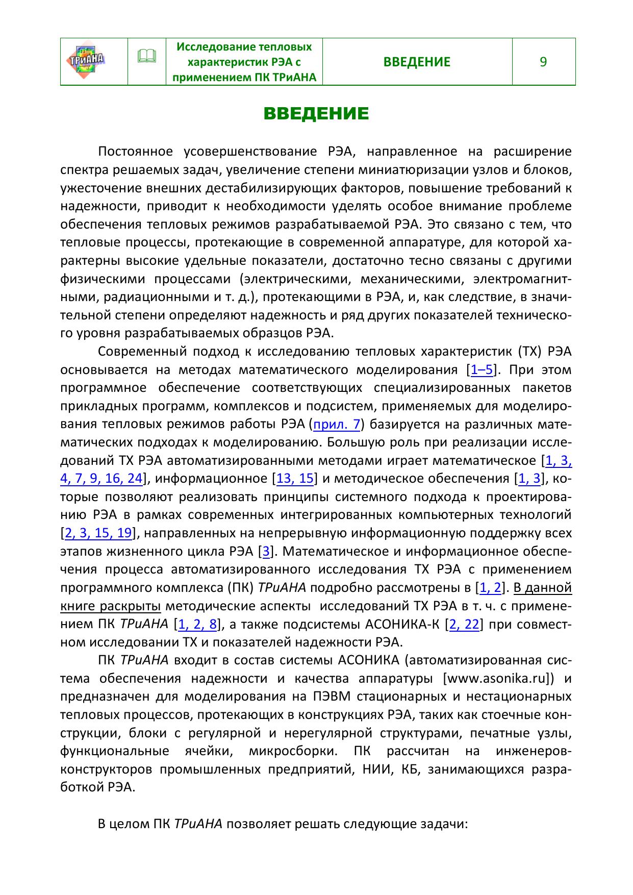 Изложены основные аспекты методического обеспечения проектных задач, связанных с анализом тепловых характеристик конструкций радиоэлектронной аппаратуры (РЭА) средствами математического моделирования, в т. ч. с применением программного комплекса (ПК) ТРиАНА. Приводятся основные разделы программной документации «Руководство пользователя ПК ТРиАНА-2.10.0», набор методик по разработке моделей тепловых процессов, анализа тепловых режимов конструкций РЭА различных уровней иерархии, примеры применения ПК ТРиАНА в практике промышленного проектирования различных образцов РЭА, в т. ч. совместно с подсистемой АСОНИКА-К. Предназначено для специалистов, занимающихся исследованием тепловых характеристик конструкций РЭА методами математического моделирования