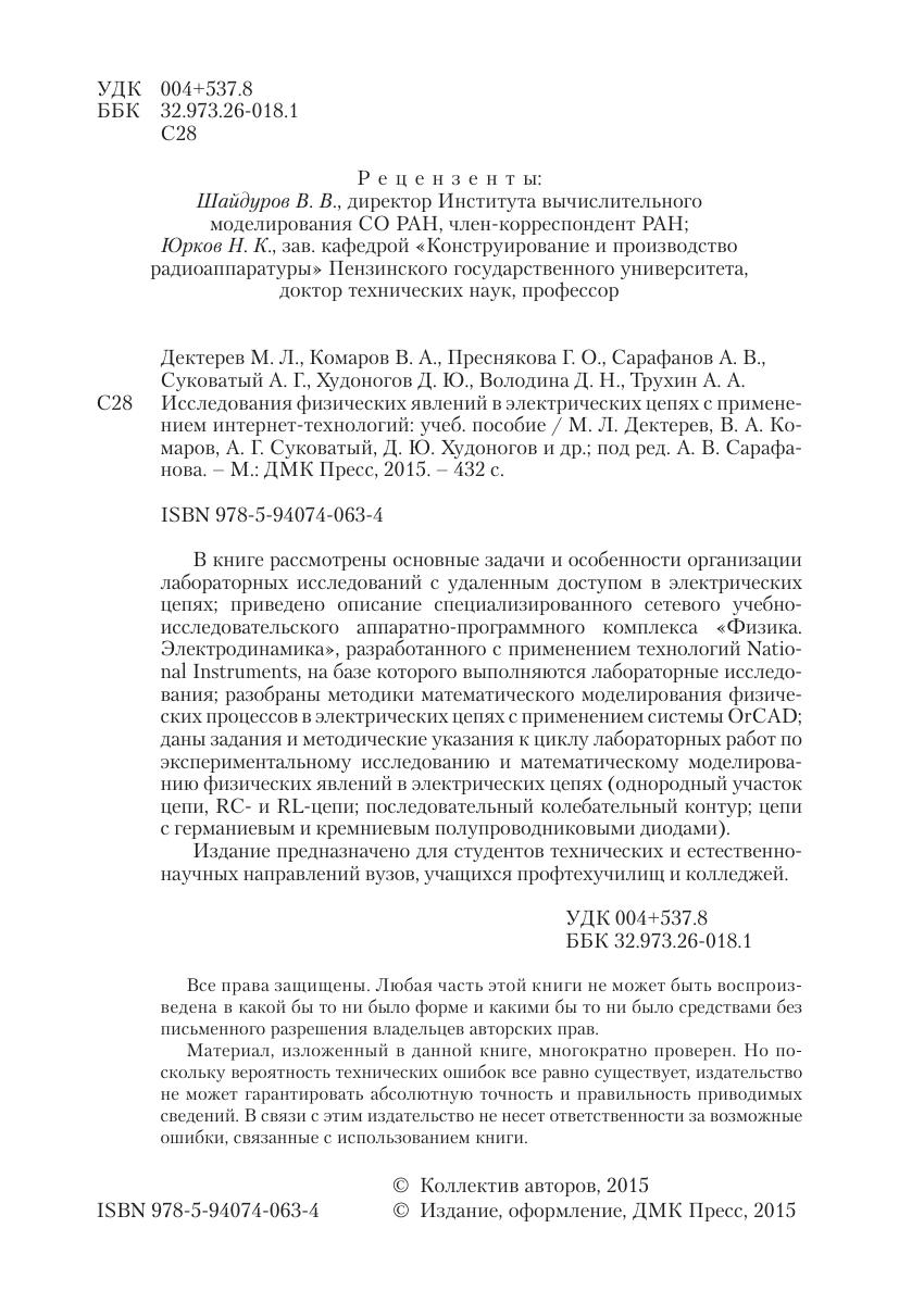 В книге рассмотрены основные задачи и особенности организации лабораторных исследований с удаленным доступом в электрических цепях, приведено описание специализированного сетевого учебно-исследовательского аппаратно-программного комплекса «Физика. Электродинамика», разработанного с применением технологий Na tional Instru ments, на базе которого выполняются лабораторные исследования, разобраны методики математического моделирования физических процессов в электрических цепях с применением системы OrCAD, даны задания и методические указания к циклу лабораторных работ по экспериментальному исследованию и математическому моделированию физических явлений в электрических цепях (однородный участок цепи, RC- и RL-цепи, последовательный колебательный контур, цепи с германиевым и кремниевым полупроводниковыми диодами). Издание предназначено для студентов технических и естественно-научных направлений вузов, учащихся профтехучилищ и колледжей.