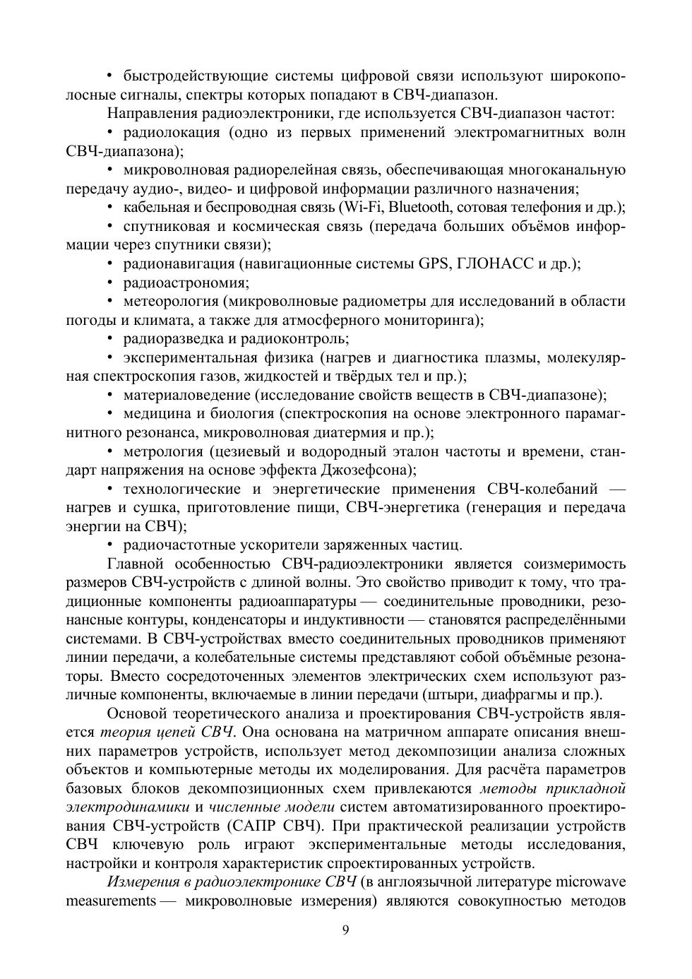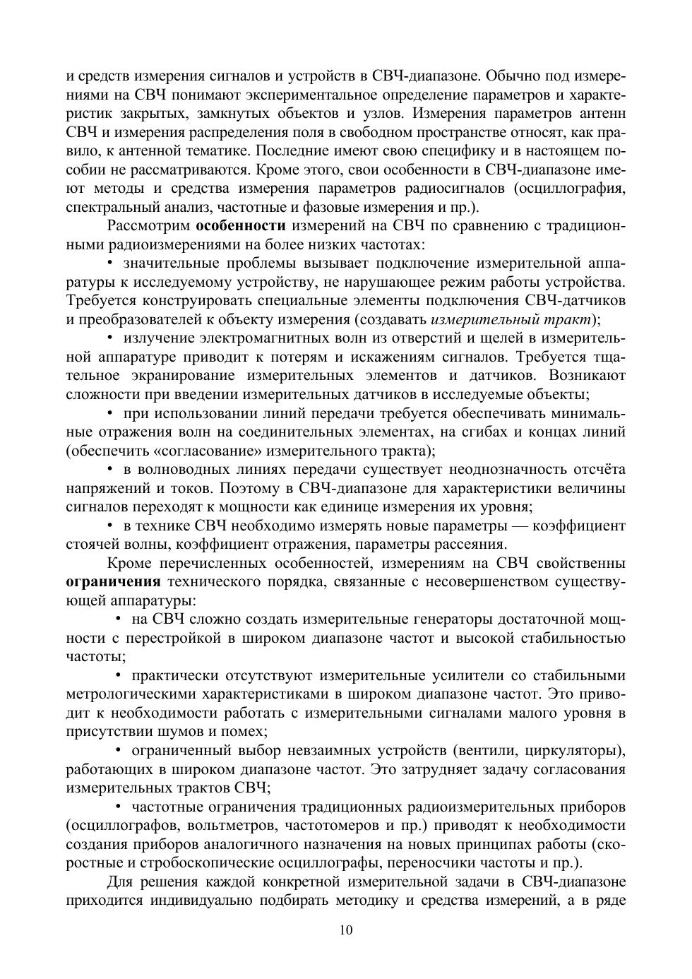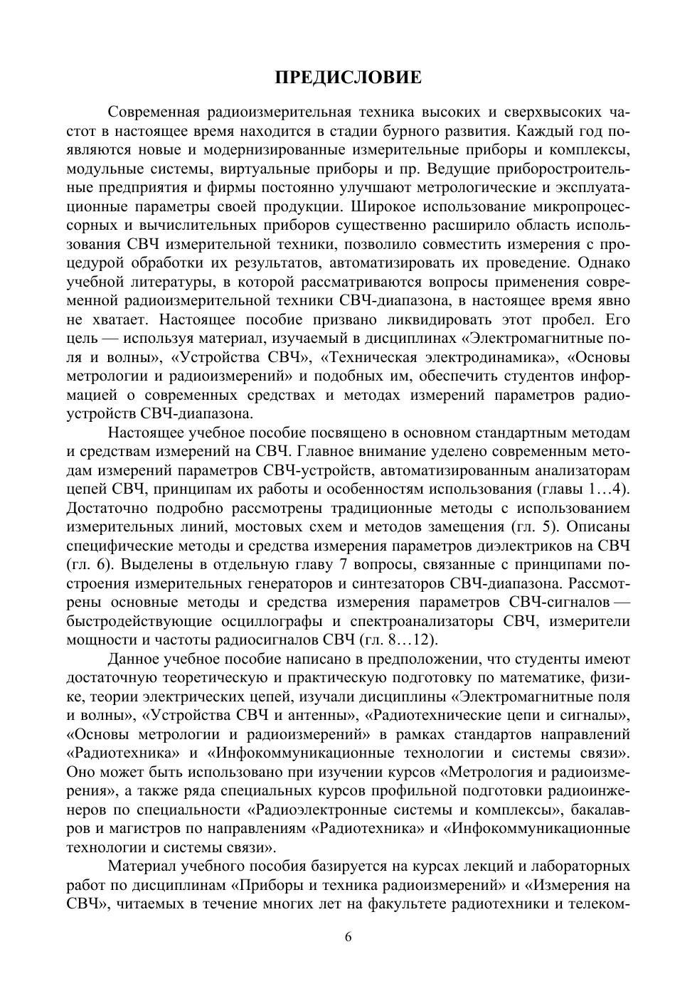 В учебном пособии рассмотрены основные методы измерения параметров устройств и сигналов в диапазоне СВЧ, структурные схемы и способы построения современных измерительных приборов СВЧ-диапазона. Приведены технические характеристики и особенности их использования при экспериментальных исследованиях устройств СВЧ различного назначения. Материал пособия представлен с учетом современных достижений радиоизмерительной техники, что позволяет ликвидировать пробелы в существующей учебной литературе по аналогичной тематике. Помимо теоретического материала приводятся контрольные вопросы для самостоятельной работы студентов. Учебное пособие рекомендовано для использования в учебном процессе технических вузов по программам подготовки бакалавров и магистров по направлениям «Радиотехника», «Инфокоммуникационные технологии и системы связи», «Конструирование и технология электронных средств», а также по программе подготовки специалистов «Радиоэлектронные системы и комплексы». Пособие может быть полезным для аспирантов, инженеров и специалистов, работающих в области СВЧ-радиоэлектроники.