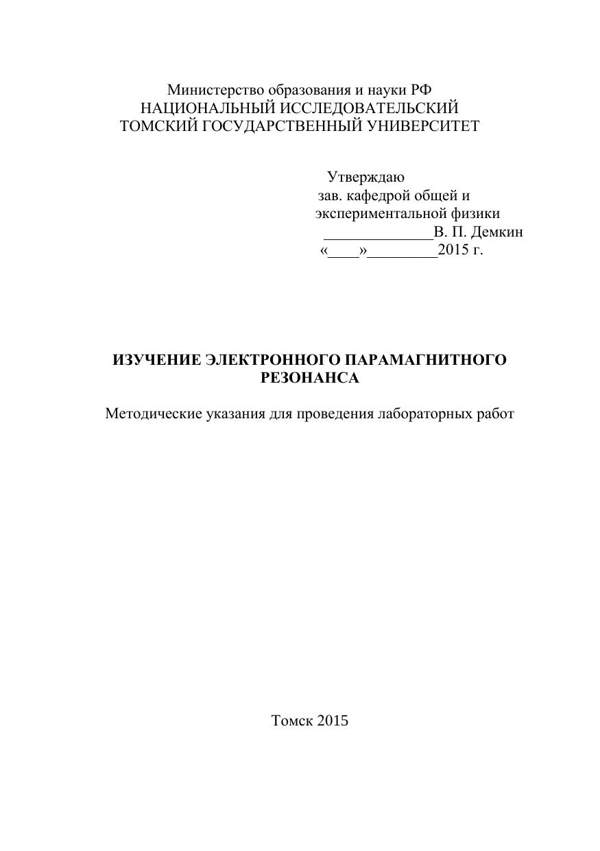 Изучение электронного парамагнитного резонанса. Методические указания для проведения лабораторных работ