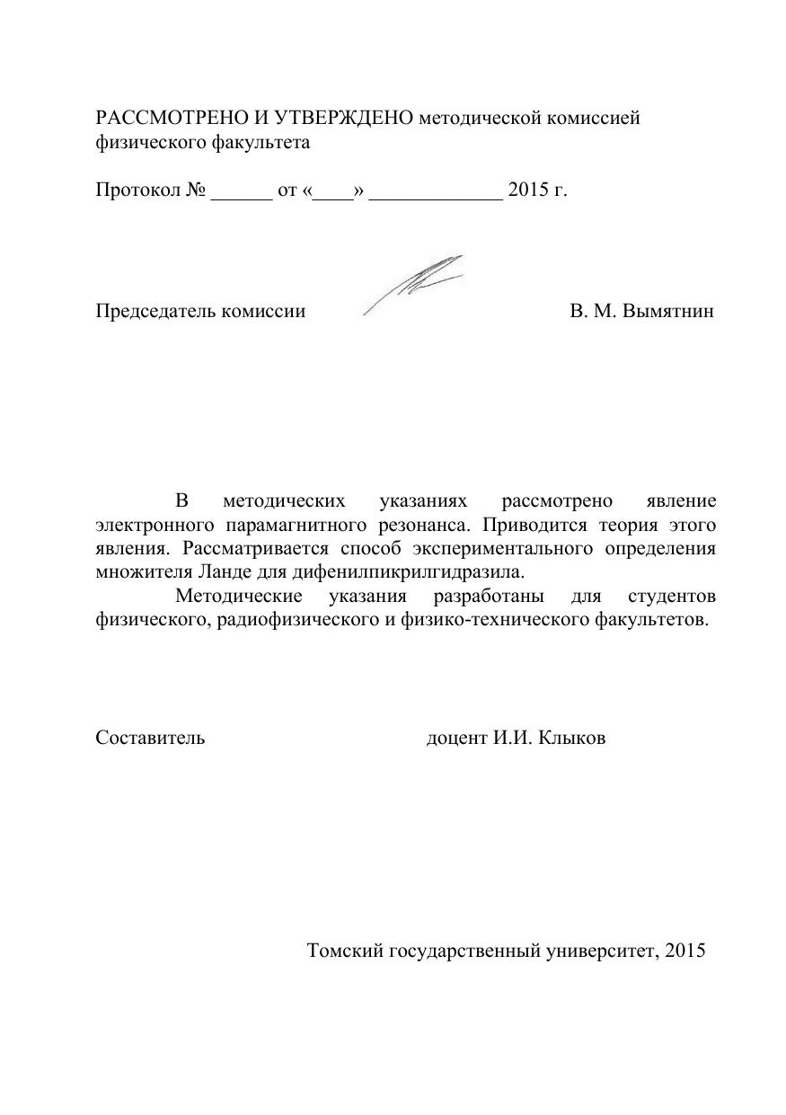 В методических указаниях рассмотрено явление электронного парамагнитного резонанса. Приводится теория этого явления. Рассматривается способ экспериментального определения множителя Ланде для дифенилпикрилгидразила. Методические указания разработаны для студентов физического, радиофизического и физико-технического факультетов.