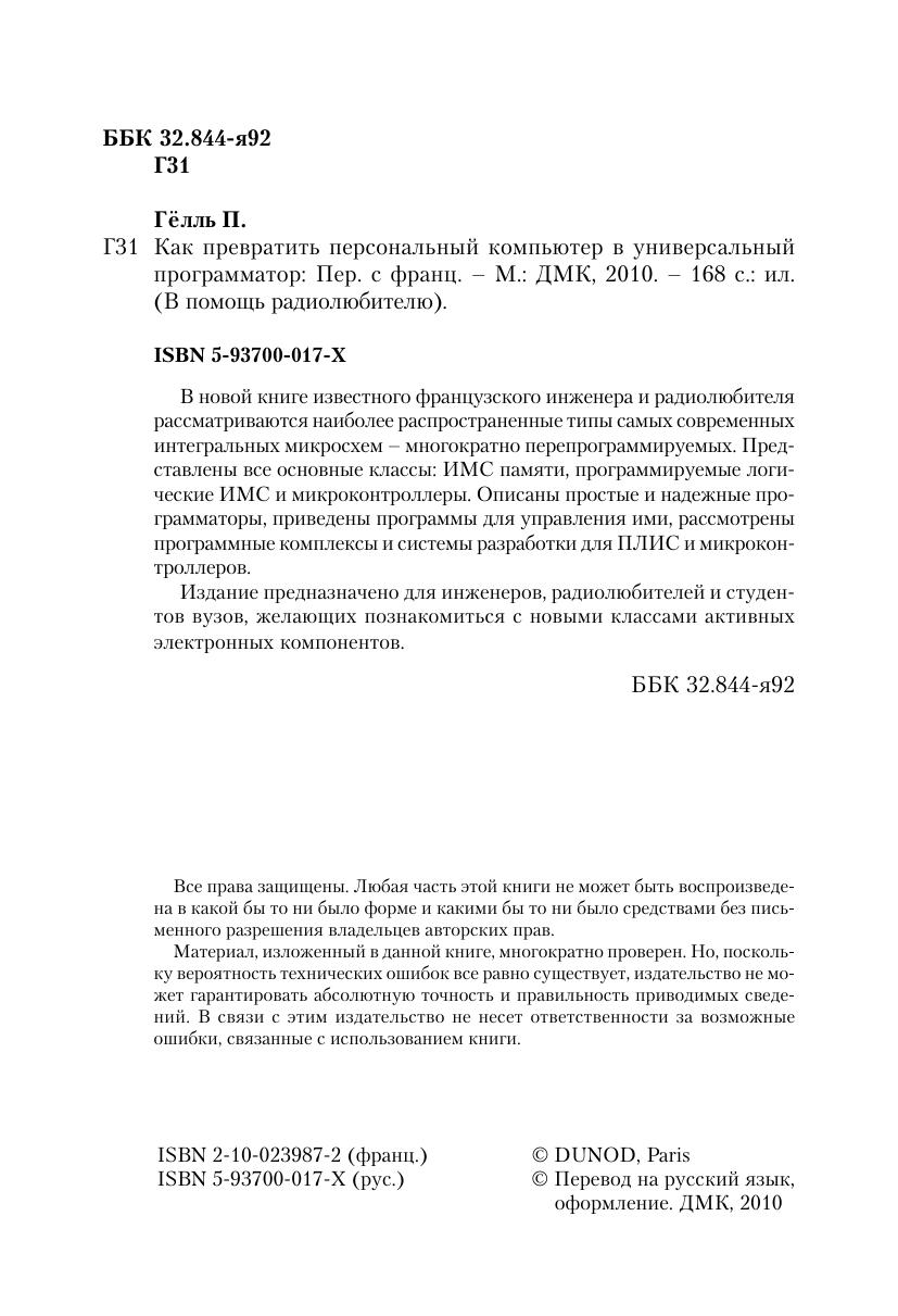 В новой книге известного французского инженера и радиолюбителя рассматриваются наиболее распространенные типы самых современных интегральных микросхем – многократно перепрограммируемых. Представлены все основные классы: ИМС памяти, программируемые логические ИМС и микроконтроллеры. Описаны простые и надежные программаторы, приведены программы для управления ими, рассмотрены программные комплексы и системы разработки для ПЛИС и микроконтроллеров. Издание предназначено для инженеров, радиолюбителей и студентов вузов, желающих познакомиться с новыми классами активных электронных компонентов.