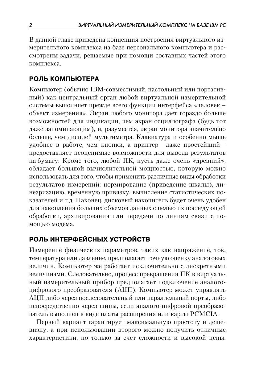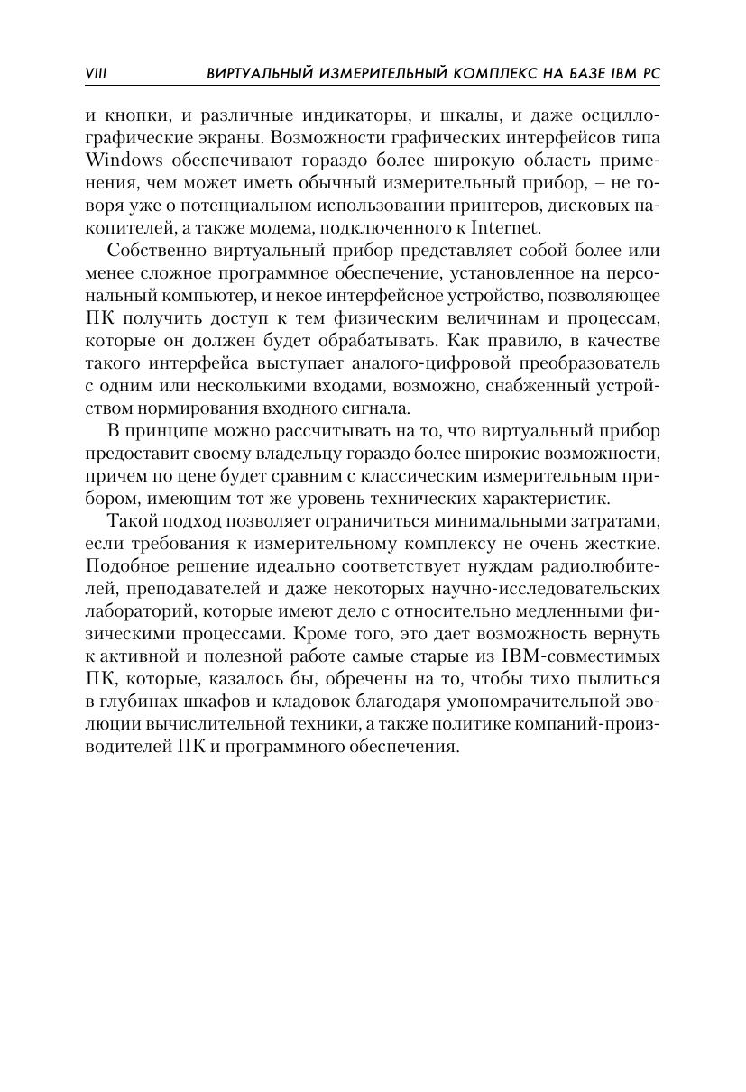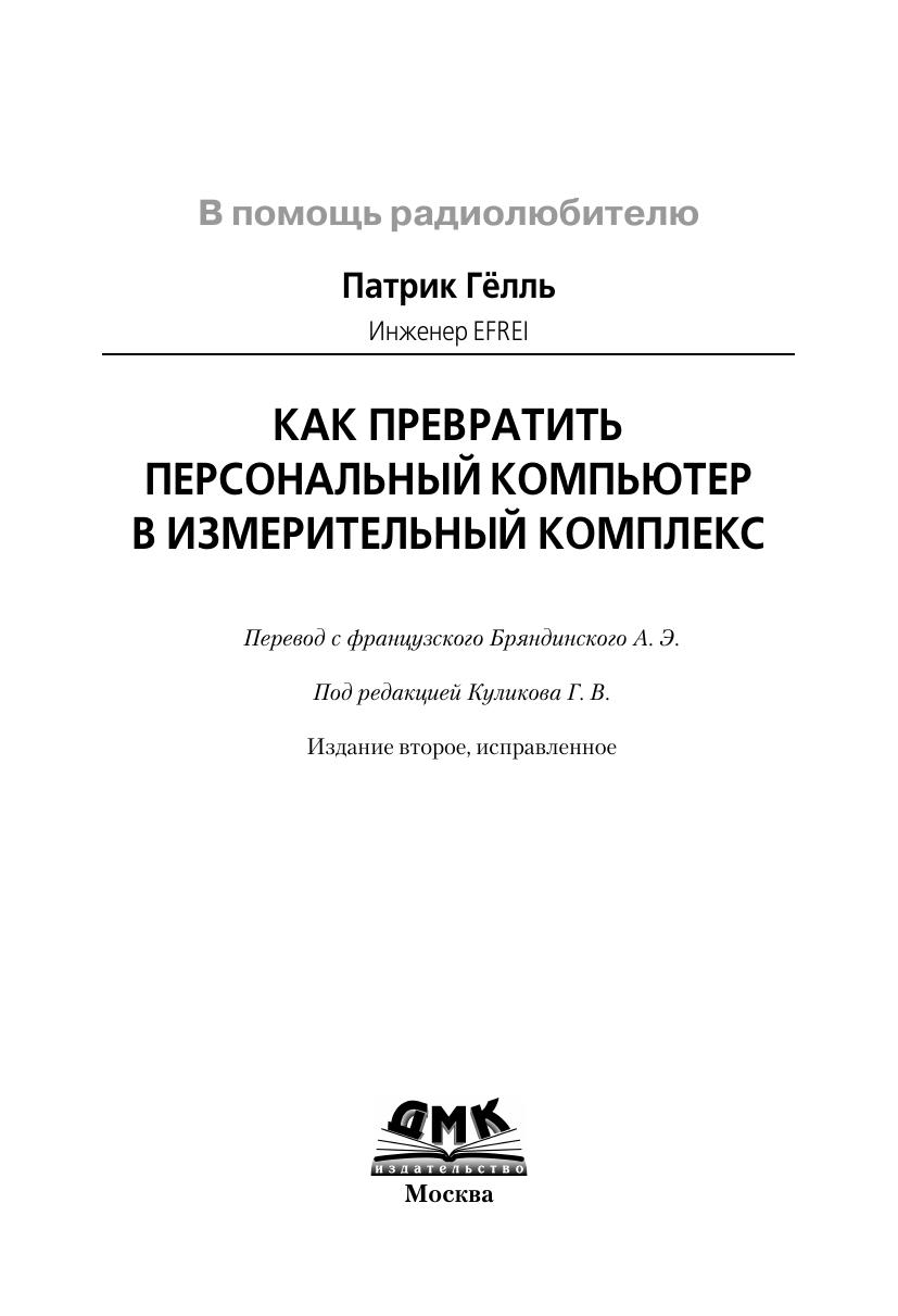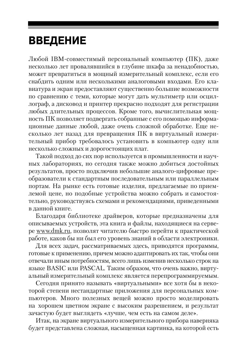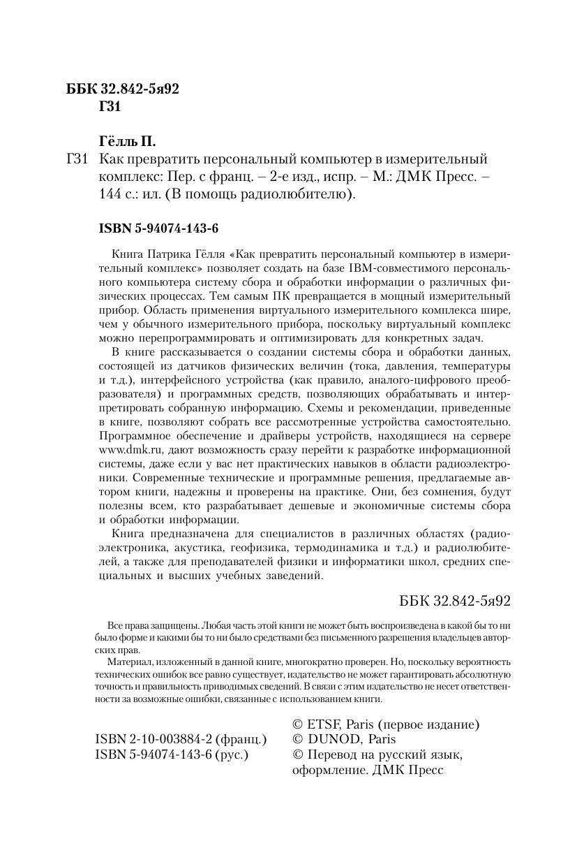 Книга Патрика Гёлля «Как превратить персональный компьютер в измерительный комплекс» позволяет создать на базе IBM совместимого персонального компьютера систему сбора и обработки информации о различных физических процессах. Тем самым ПК превращается в мощный измерительный прибор. Область применения виртуального измерительного комплекса шире, чем у обычного измерительного прибора, поскольку виртуальный комплекс можно перепрограммировать и оптимизировать для конкретных задач. В книге рассказывается о создании системы сбора и обработки данных, состоящей из датчиков физических величин (тока, давления, температуры и т.д.), интерфейсного устройства (как правило, аналого цифрового преобразователя) и программных средств, позволяющих обрабатывать и интерпретировать собранную информацию. Схемы и рекомендации, приведенные в книге, позволяют собрать все рассмотренные устройства самостоятельно. Современные технические и программные решения, предлагаемые автором книги, надежны и проверены на практике. Они, без сомнения, будут полезны всем, кто разрабатывает дешевые и экономичные системы сбора и обработки информации. Книга предназначена для специалистов в различных областях (радио-электроника, акустика, геофизика, термодинамика и т.д.) и радиолюбителей, а также для преподавателей физики и информатики школ, средних специальных и высших учебных заведений.