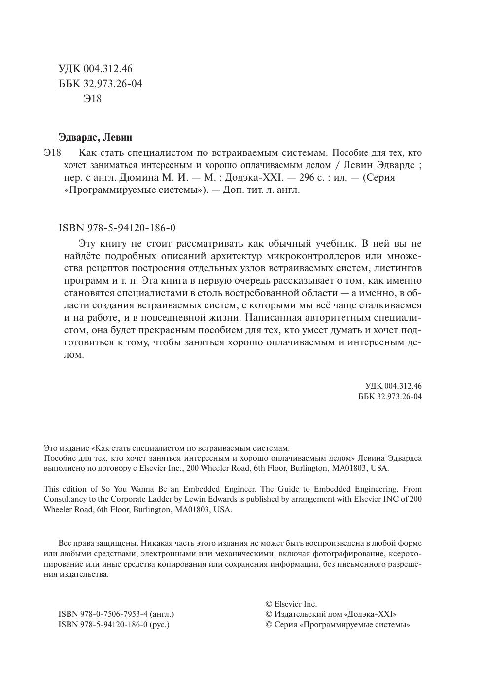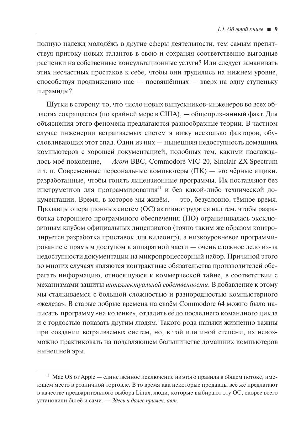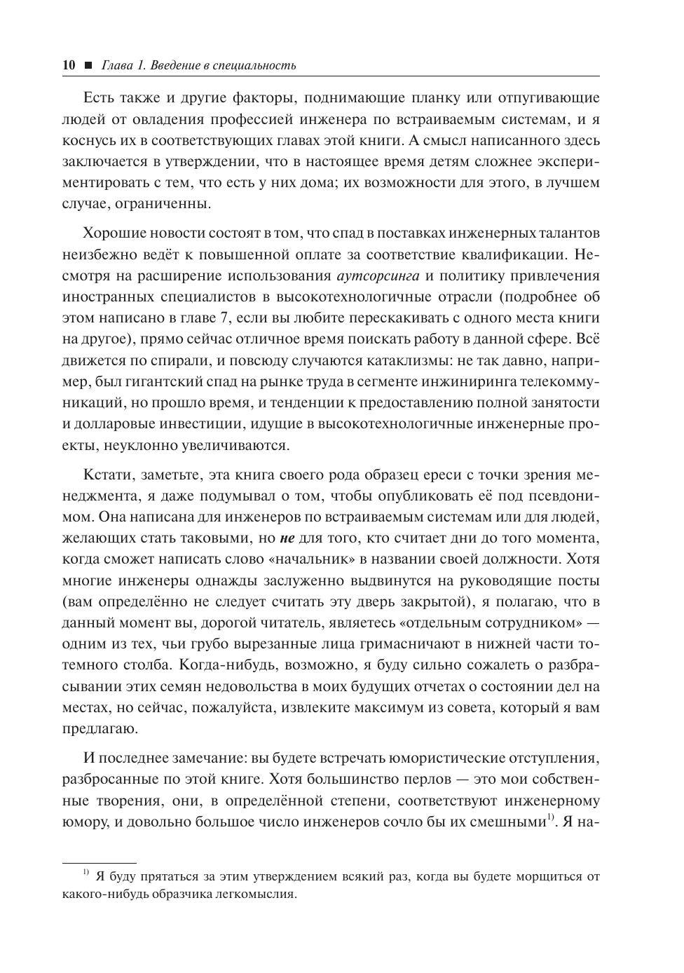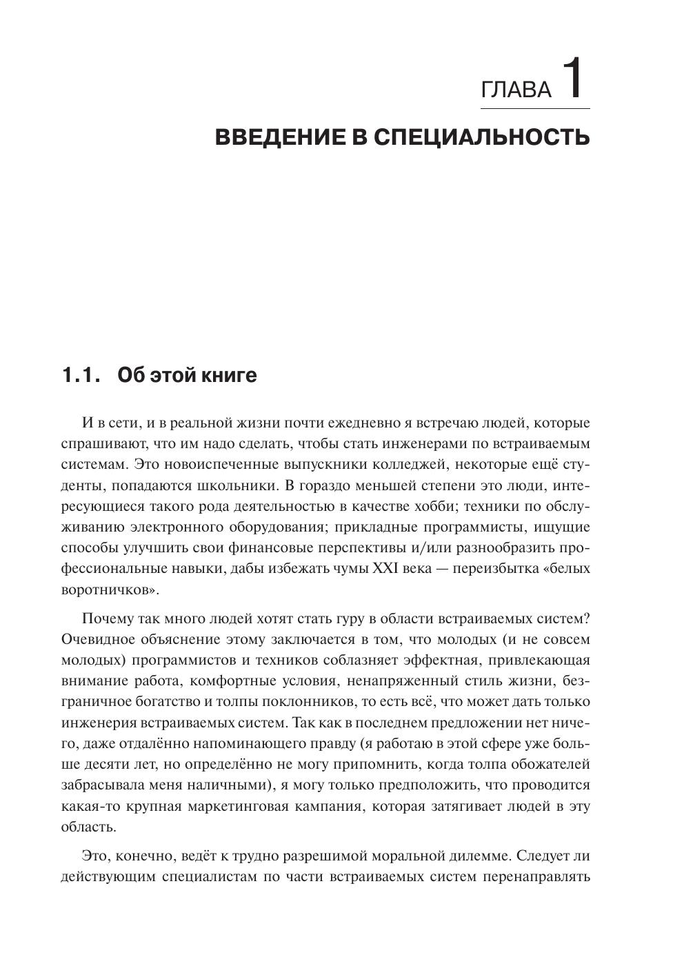 Эту книгу не стоит рассматривать как обычный учебник. В ней вы не найдёте подробных описаний архитектур микроконтроллеров или множества рецептов построения отдельных узлов встраиваемых систем, листингов программ и т. п. Эта книга в первую очередь рассказывает о том, как именно становятся специалистами в столь востребованной области — а именно, в области создания встраиваемых систем, с которыми мы всё чаще сталкиваемся и на работе, и в повседневной жизни. Написанная авторитетным специалистом, она будет прекрасным пособием для тех, кто умеет думать и хочет подготовиться к тому, чтобы заняться хорошо оплачиваемым и интересным делом.
