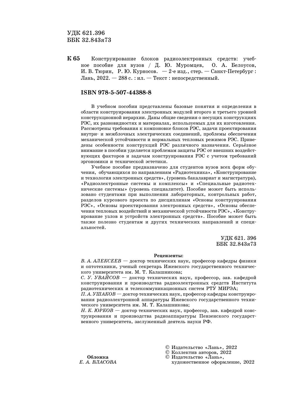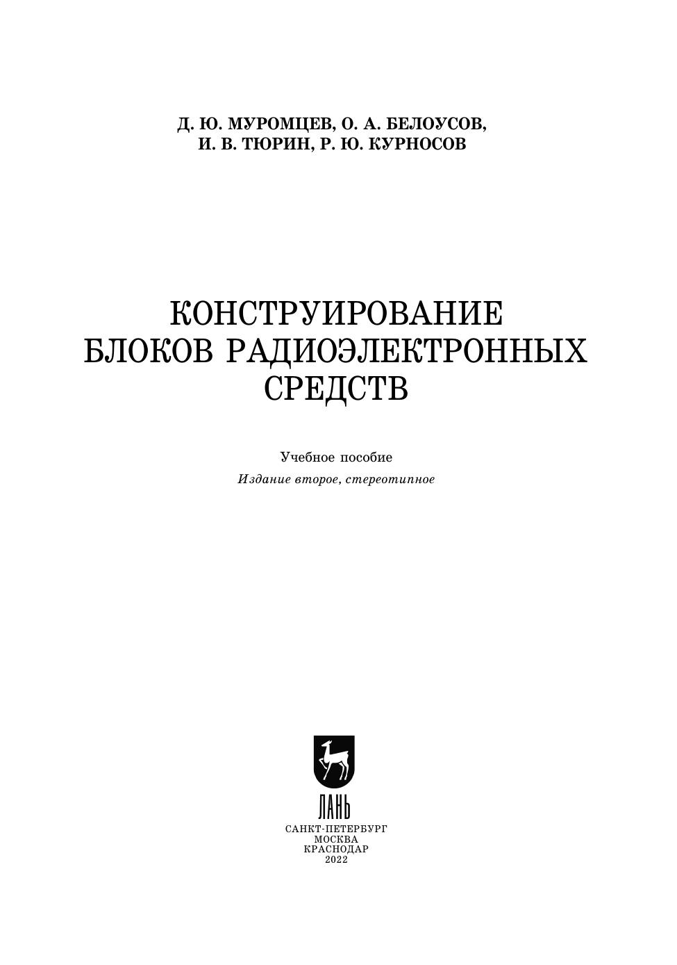 В учебном пособии представлены базовые понятия и определения в области конструирования электронных модулей второго и третьего уровней конструкционной иерархии. Даны общие сведения о несущих конструкциях РЭС, их разновидностях и материалах, используемых для их изготовления. Рассмотрены требования к компоновке блоков РЭС, задачи проектирования внутри- и межблочных электрических соединений, проблемы обеспечения механической устойчивости и нормальных тепловых режимов РЭС. Приведены особенности конструкций РЭС различного назначения. Серьёзное внимание в пособии уделяется проблемам защиты РЭС от внешних воздействующих факторов и задачам конструирования РЭС с учетом требований эргономики и технической эстетики.
