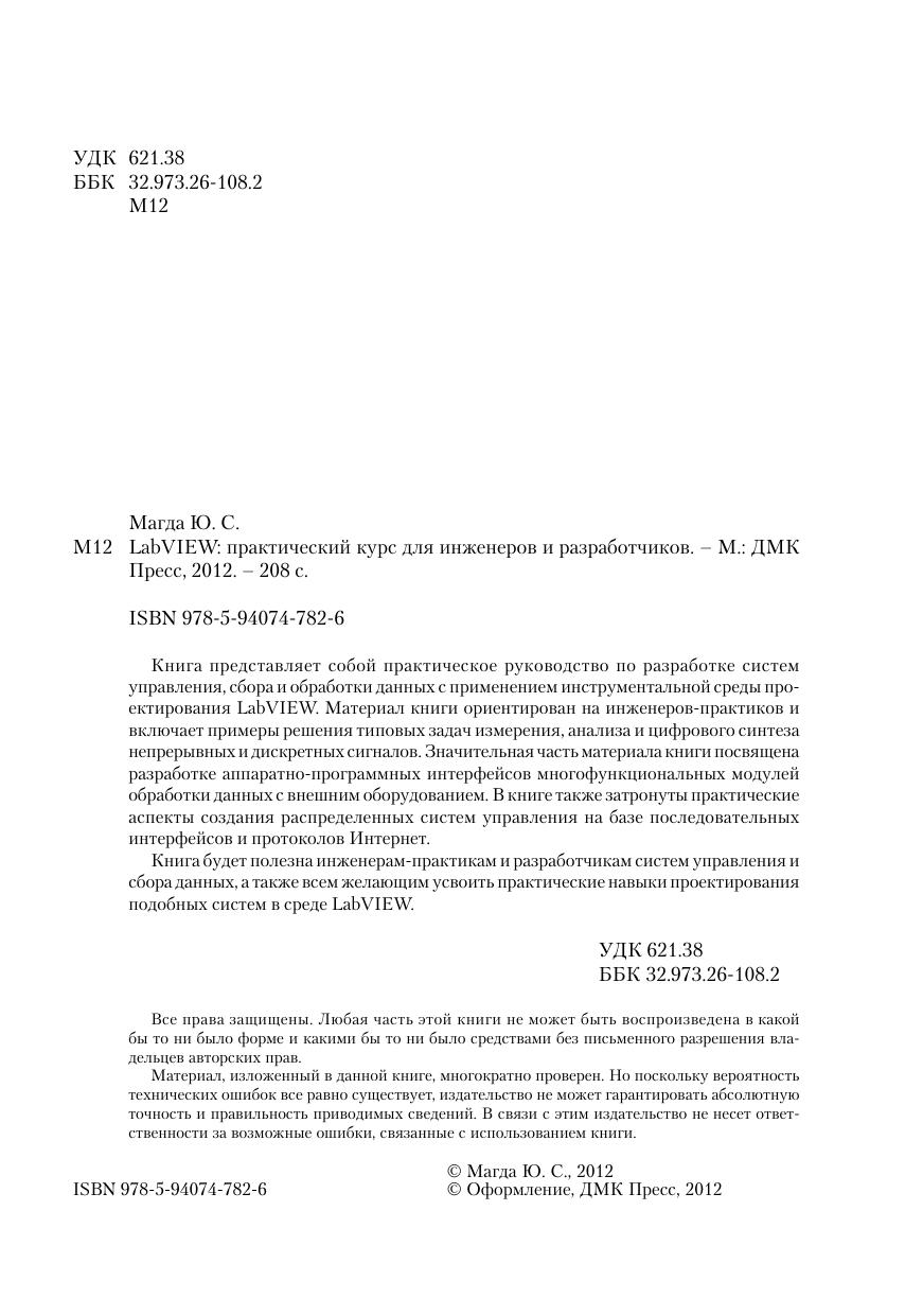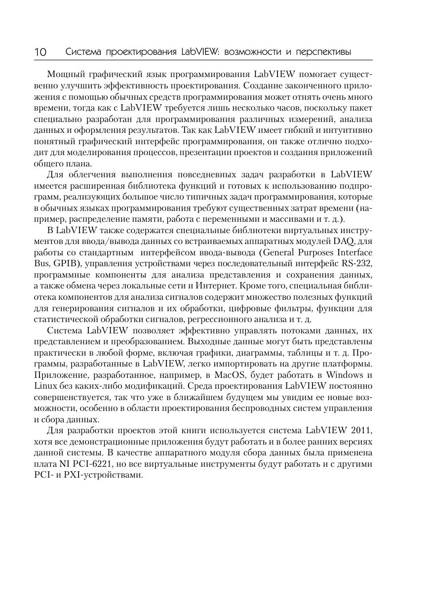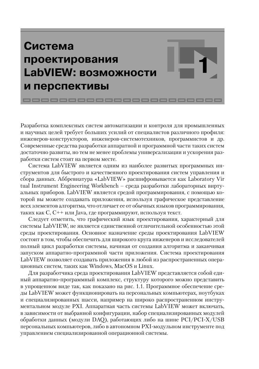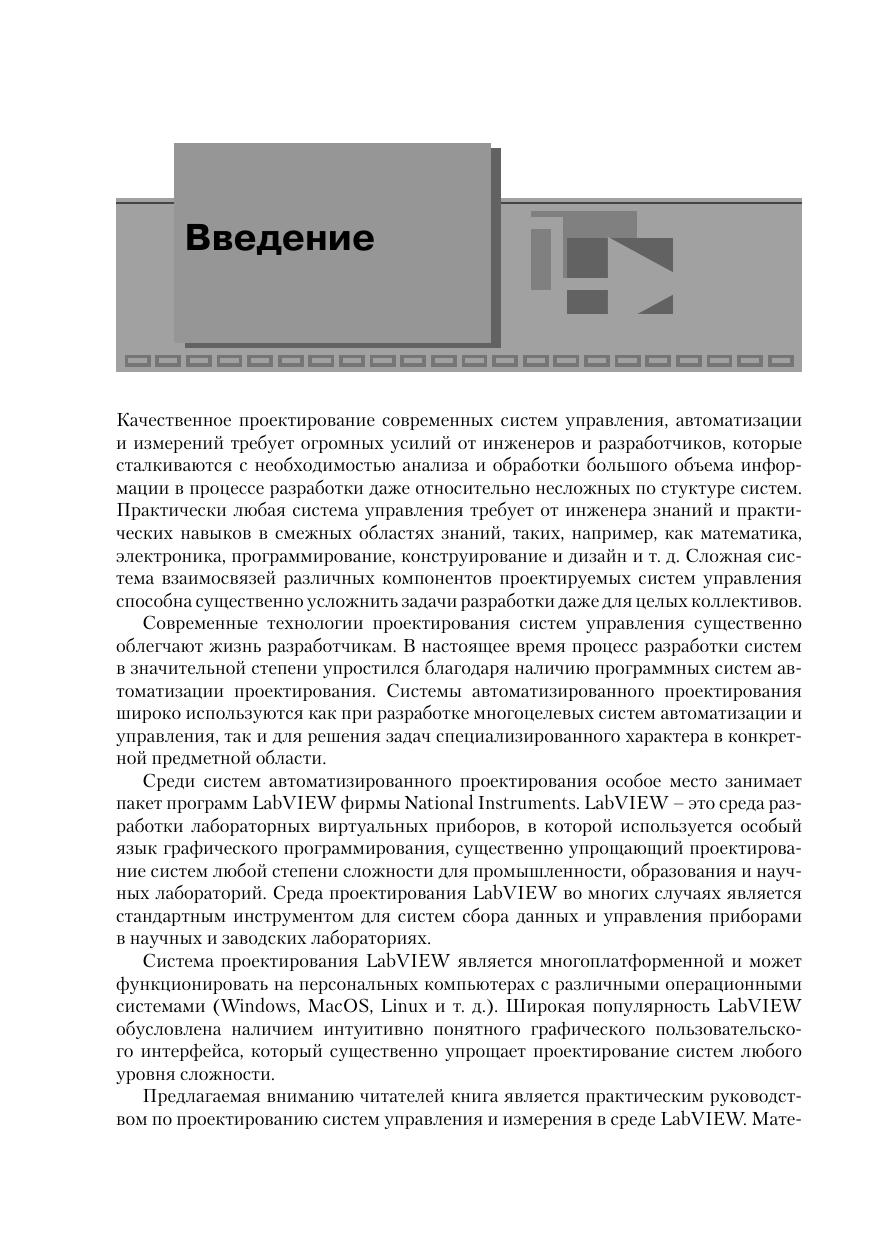 Книга представляет собой практическое руководство по разработке систем управления, сбора и обработки данных с применением инструментальной среды проектирования LabVIEW. Материал книги ориентирован на инженеров-практиков и включает примеры решения типовых задач измерения, анализа и цифрового синтеза непрерывных и дискретных сигналов. Значительная часть материала книги посвящена разработке аппаратно-программных интерфейсов многофункциональных модулей обработки данных с внешним оборудованием. В книге также затронуты практические аспекты создания распределенных систем управления на базе последовательных интерфейсов и протоколов Интернет. Книга будет полезна инженерам-практикам и разработчикам систем управления и сбора данных, а также всем желающим усвоить практические навыки проектирования подобных систем в среде LabVIEW.