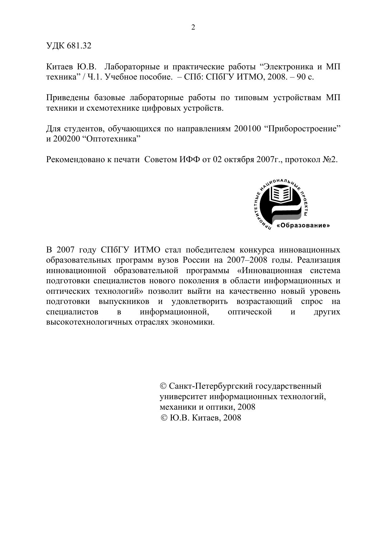 Приведены базовые лабораторные работы по типовым устройствам МП техники и схемотехнике цифровых устройств. Для студентов, обучающихся по направлениям 200100 “Приборостроение” и 200200 “Оптотехника”