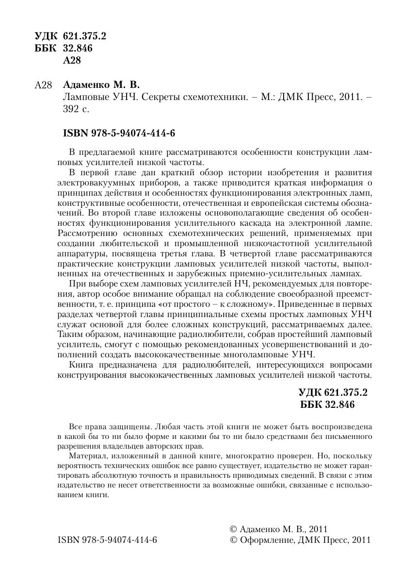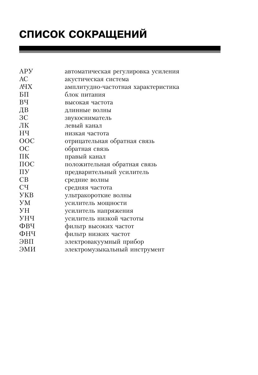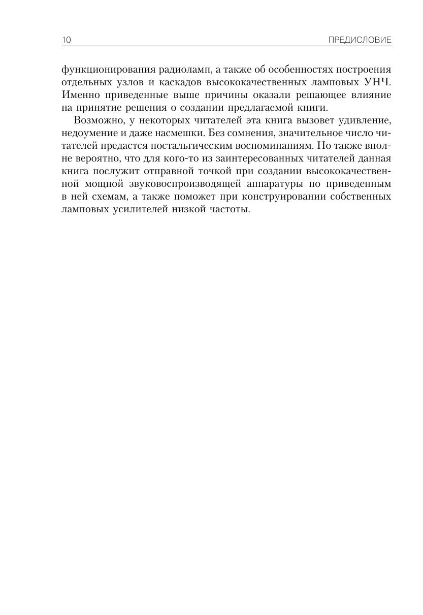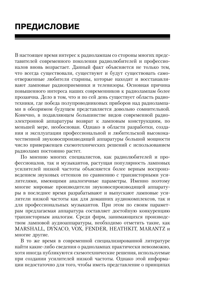 В предлагаемой книге рассматриваются особенности конструкции ламповых усилителей низкой частоты. В первой главе дан краткий обзор истории изобретения и развития электровакуумных приборов, а также приводится краткая информация о принципах действия и особенностях функционирования электронных ламп, конструктивные особенности, отечественная и европейская системы обозначений. Во второй главе изложены основополагающие сведения об особенностях функционирования усилительного каскада на электронной лампе. Рассмотрению основных схемотехнических решений, применяемых при создании любительской и промышленной низкочастотной усилительной аппаратуры, посвящена третья глава. В четвертой главе рассматриваются практические конструкции ламповых усилителей низкой частоты, выполненных на отечественных и зарубежных приемно-усилительных лампах. При выборе схем ламповых усилителей НЧ, рекомендуемых для повторения, автор особое внимание обращал на соблюдение своеобразной преемственности, т. е. принципа «от простого – к сложному». Приведенные в первых разделах четвертой главы принципиальные схемы простых ламповых УНЧ служат основой для более сложных конструкций, рассматриваемых далее. Таким образом, начинающие радиолюбители, собрав простейший ламповый усилитель, смогут с помощью рекомендованных усовершенствований и дополнений создать высококачественные многоламповые УНЧ. Книга предназначена для радиолюбителей, интересующихся вопросами конструирования высококачественных ламповых усилителей низкой частоты.