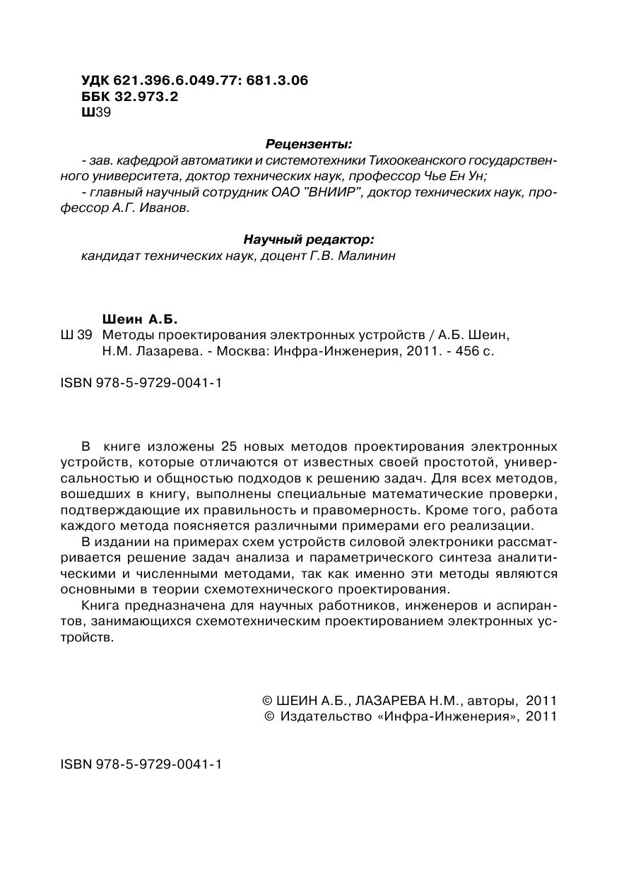В книге изложены 25 новых методов проектирования электронных устройств, которые отличаются от известных своей простотой, универсальностью и общностью подходов к решению задач. Для всех методов, вошедших в книгу, выполнены специальные математические проверки, подтверждающие их правильность и правомерность. Кроме того, работа каждого метода поясняется различными примерами его реализации. В издании на примерах схем устройств силовой электроники рассматривается решение задач анализа и параметрического синтеза аналитическими и численными методами, так как именно эти методы являются основными в теории схемотехнического проектирования. Книга предназначена для научных работников, инженеров и аспирантов, занимающихся схемотехническим проектированием электронных устройств.