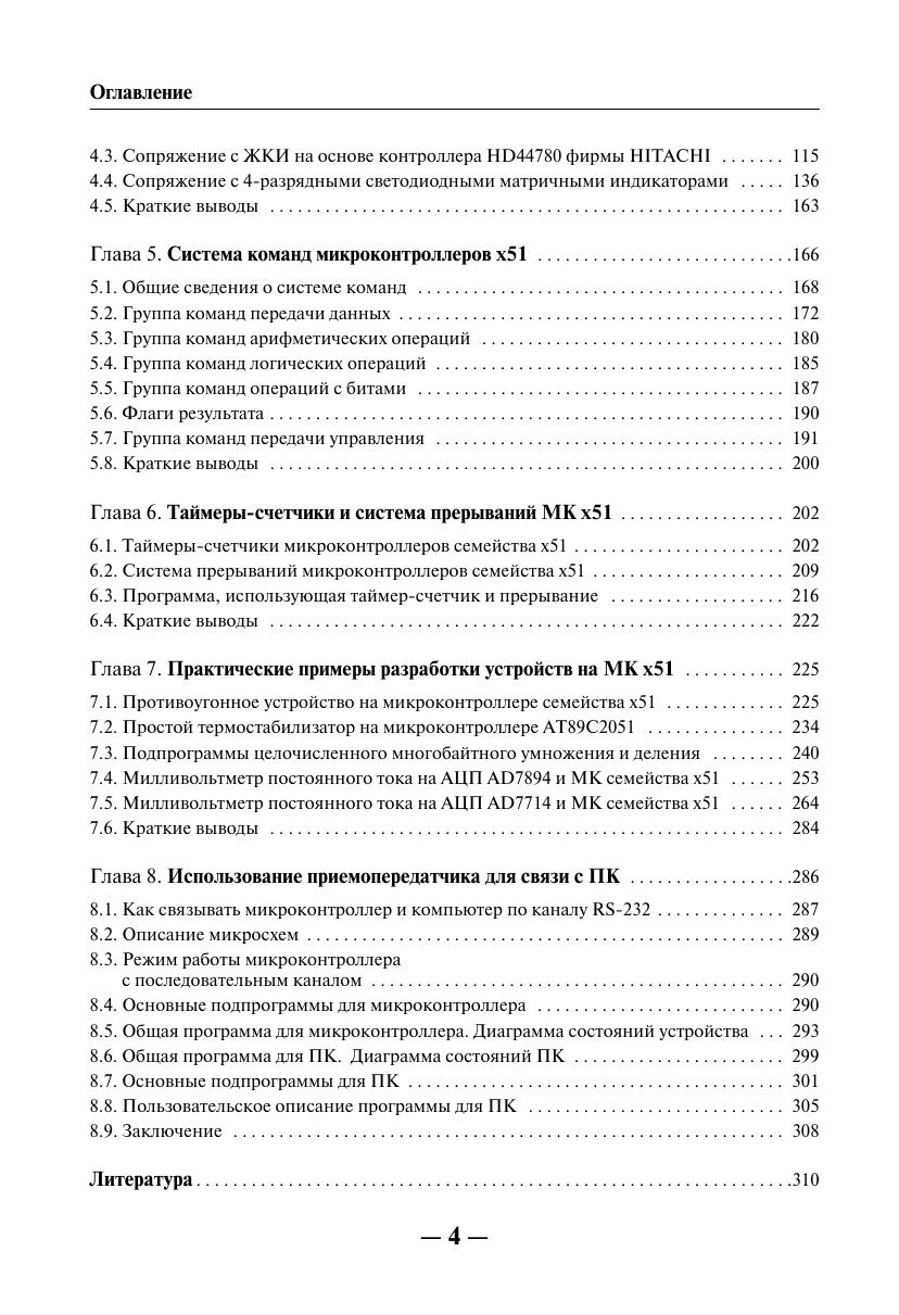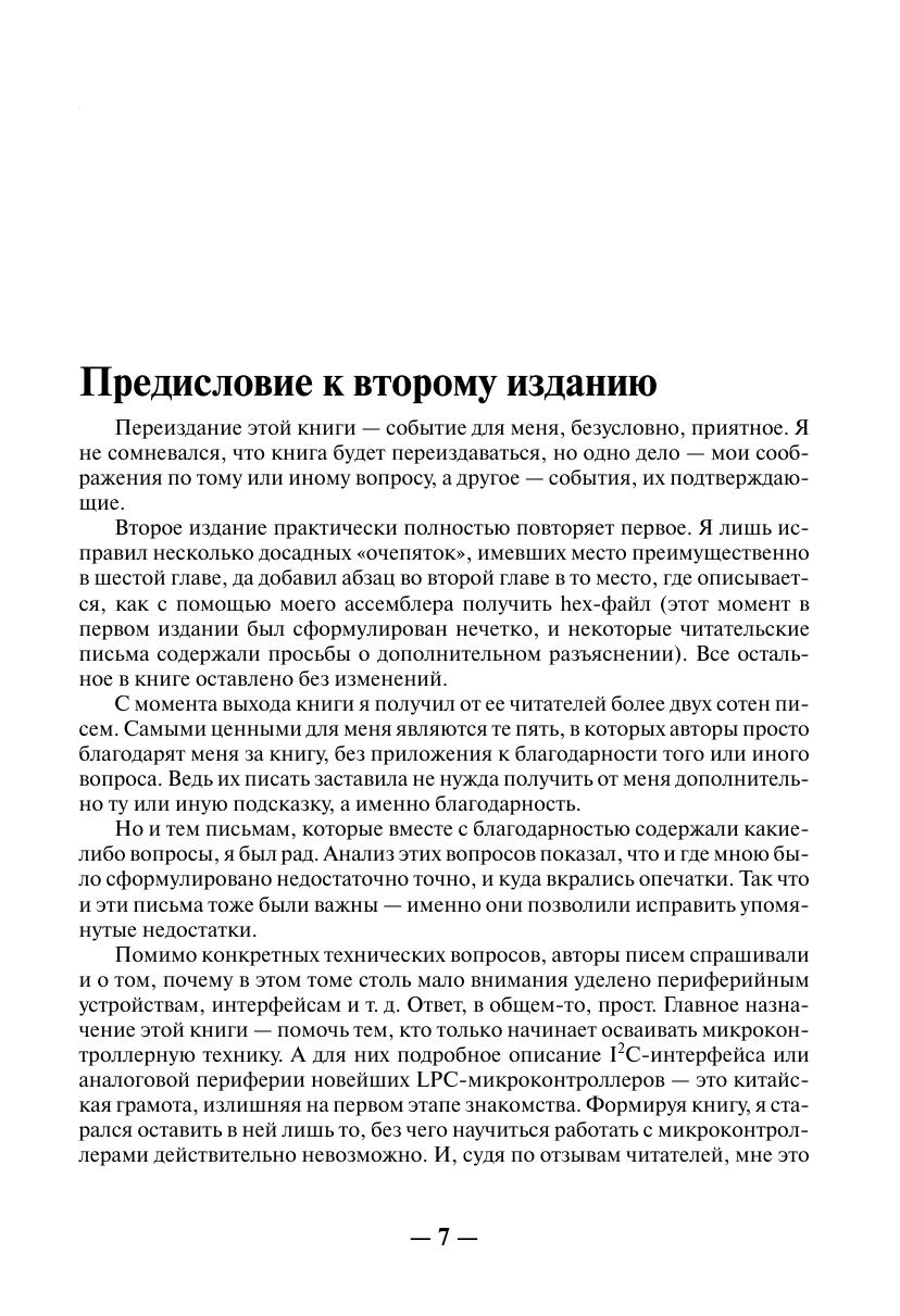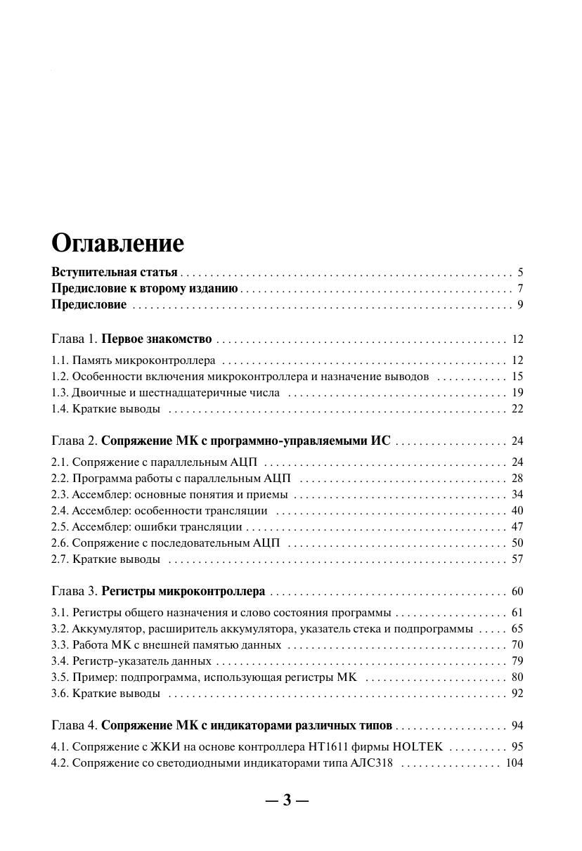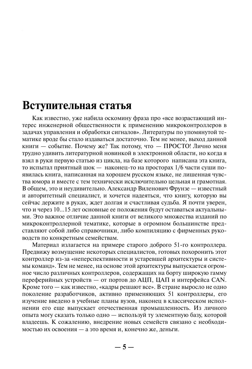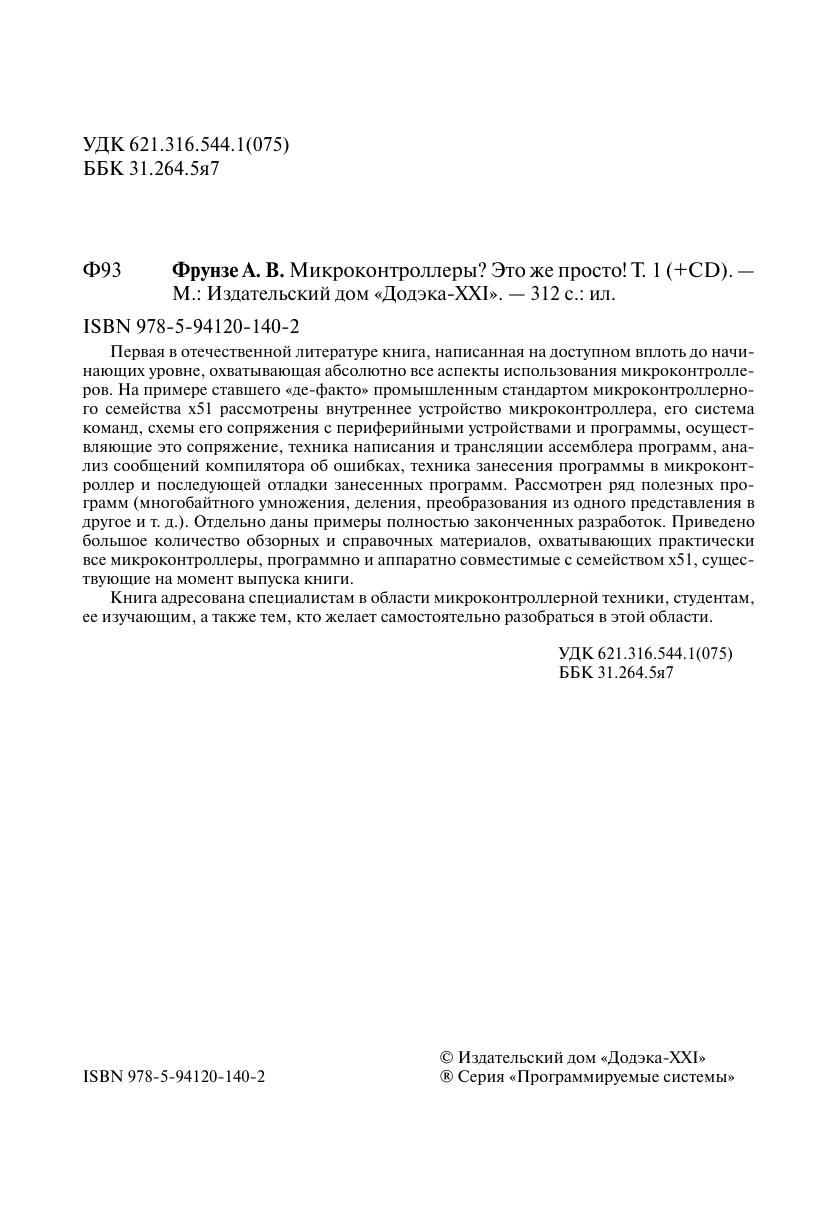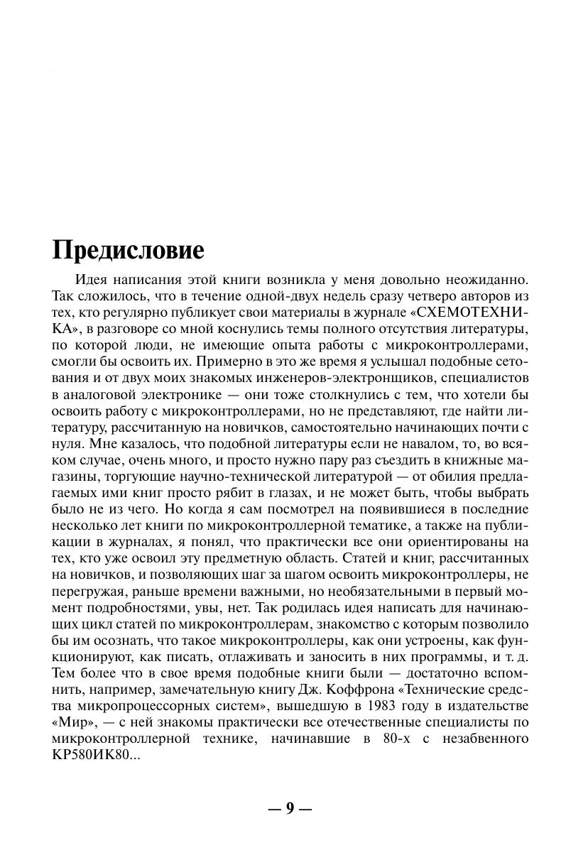 Первая в отечественной литературе книга, написанная на доступном вплоть до начинающих уровне, охватывающая абсолютно все аспекты использования микроконтроллеров. На примере ставшего «де факто» промышленным стандартом микроконтроллерного семейства х51 рассмотрены внутреннее устройство микроконтроллера, его система команд, схемы его сопряжения с периферийными устройствами и программы, осуществляющие это сопряжение, техника написания и трансляции ассемблера программ, анализ сообщений компилятора об ошибках, техника занесения программы в микроконтроллер и последующей отладки занесенных программ. Рассмотрен ряд полезных программ (многобайтного умножения, деления, преобразования из одного представления в другое и т. д.). Отдельно даны примеры полностью законченных разработок. Приведено большое количество обзорных и справочных материалов, охватывающих практически все микроконтроллеры, программно и аппаратно совместимые с семейством х51, существующие на момент выпуска книги. Книга адресована специалистам в области микроконтроллерной техники, студентам, ее изучающим, а также тем, кто желает самостоятельно разобраться в этой области.