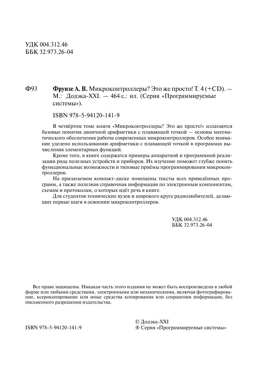 В четвёртом томе книги «Микроконтроллеры? Это же просто!» излагаются базовые понятия двоичной арифметики с плавающей точкой — основы математического обеспечения работы современных микроконтроллеров. Особое внимание уделено использованию арифметики с плавающей точкой в программах вычисления элементарных функций. Кроме того, в книге содержатся примеры аппаратной и программной реализации ряда полезных устройств и приборов. Их изучение поможет глубже понять функциональные возможности и типовые приёмы программирования микроконтроллеров. На прилагаемом компакт диске помещены тексты всех приведённых программ, а также полезная справочная информация по электронным компонентам, схемам и протоколам, о которых идёт речь в книге. Для студентов технических вузов и широкого круга радиолюбителей, делающих первые шаги в освоении микроконтроллеров.