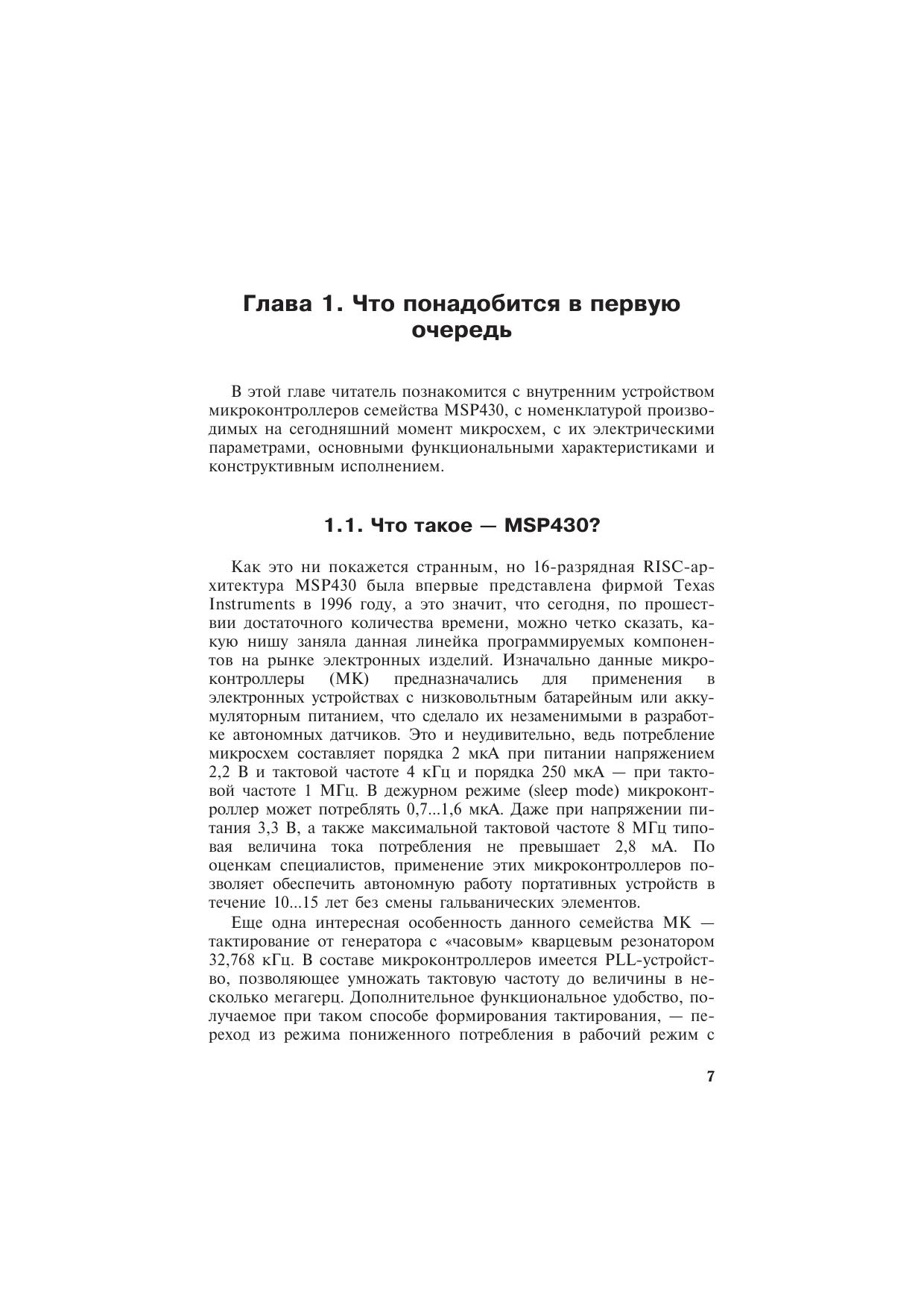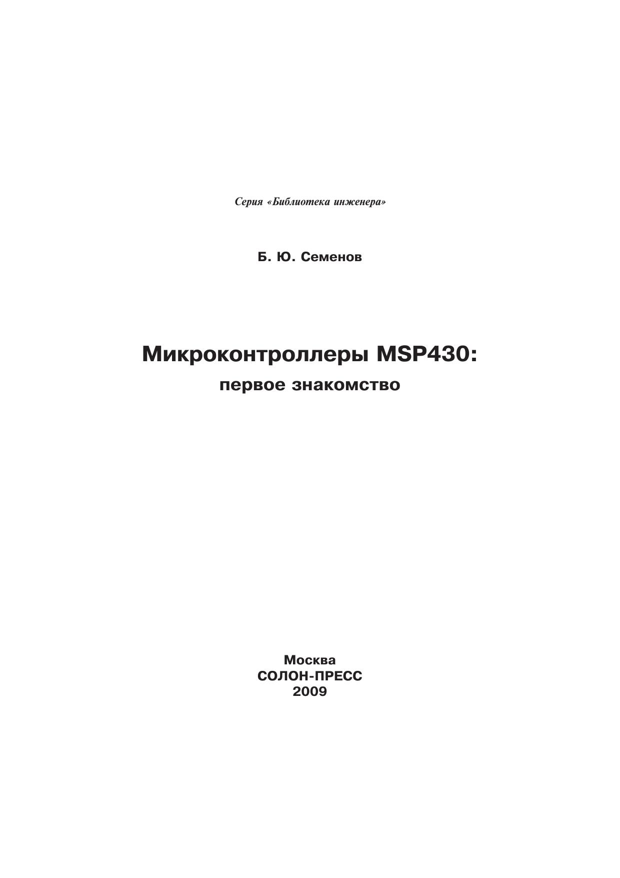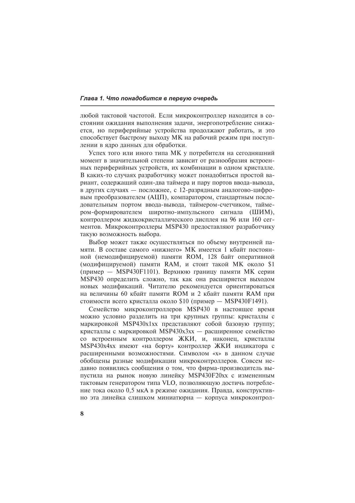 Книга посвящена микроконтроллерам серии MSP430, которые производятся фирмой Texas Instruments. Едва ли удастся найти конкурента этим микроконтроллерам по величине потребляемого тока и производительности, если речь идет о разработке автономных малогабаритных приборов с низковольтным батарейным питанием. Книга в доступной форме поможет разобраться с архитектурой и системой команд MSP430, сориентирует читателя в многообразии «софта» для разработки программного обеспечения, расскажет о способах «прошивки» памяти MSP430, о существующих программаторах. Приведенные схемы, печатные платы и сборочные рисунки позволят собрать несколько несложных программаторов flash-памяти MSP430 самостоятельно.Книга адресована инженерам, начинающим работать с микроконтроллерами, студентам радиотехнических специальностей вузов, специалистам, занимающимся обслуживанием и ремонтом электронной аппаратуры, радиолюбителям, а также всем тем, кто интересуется перспективной электронной техникой.