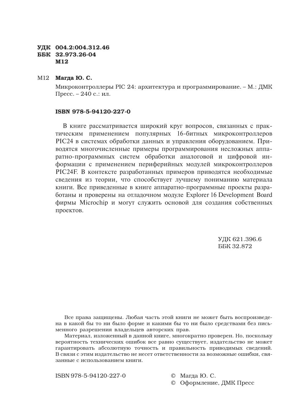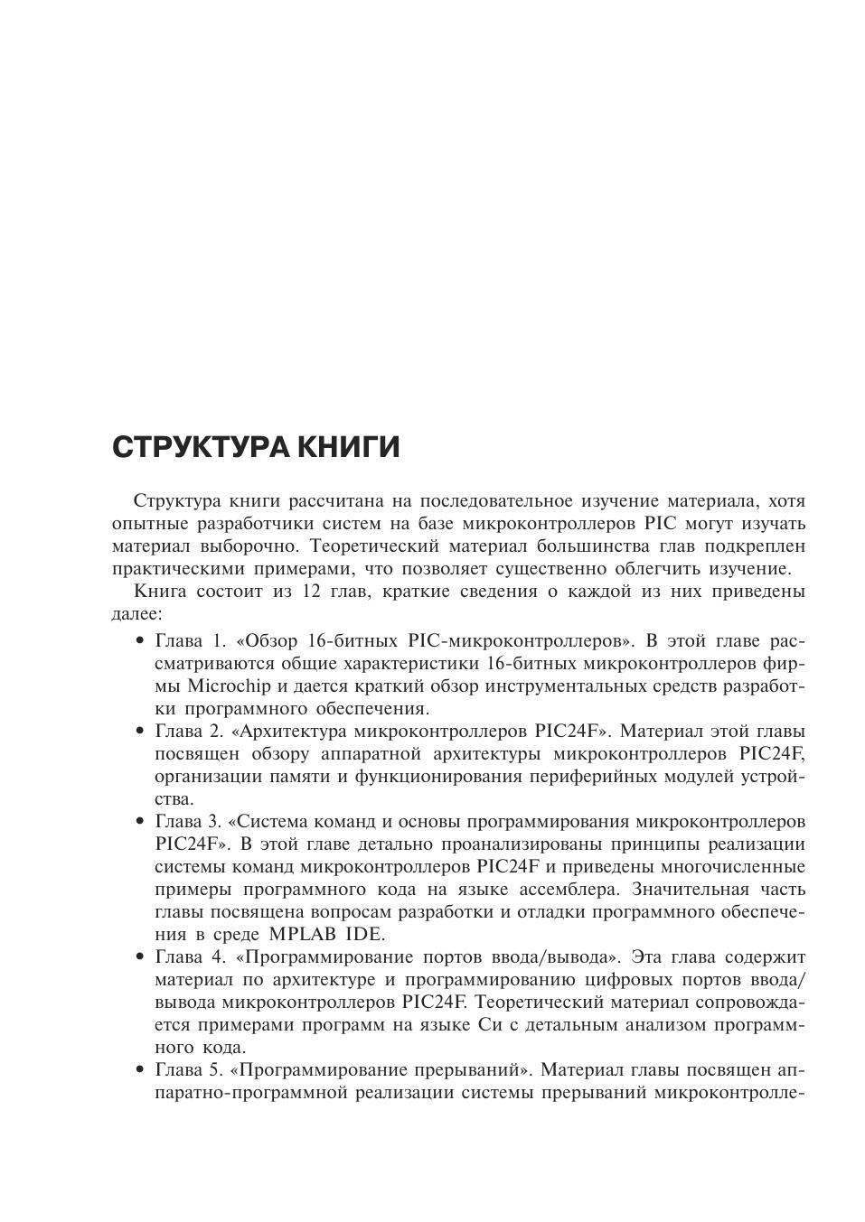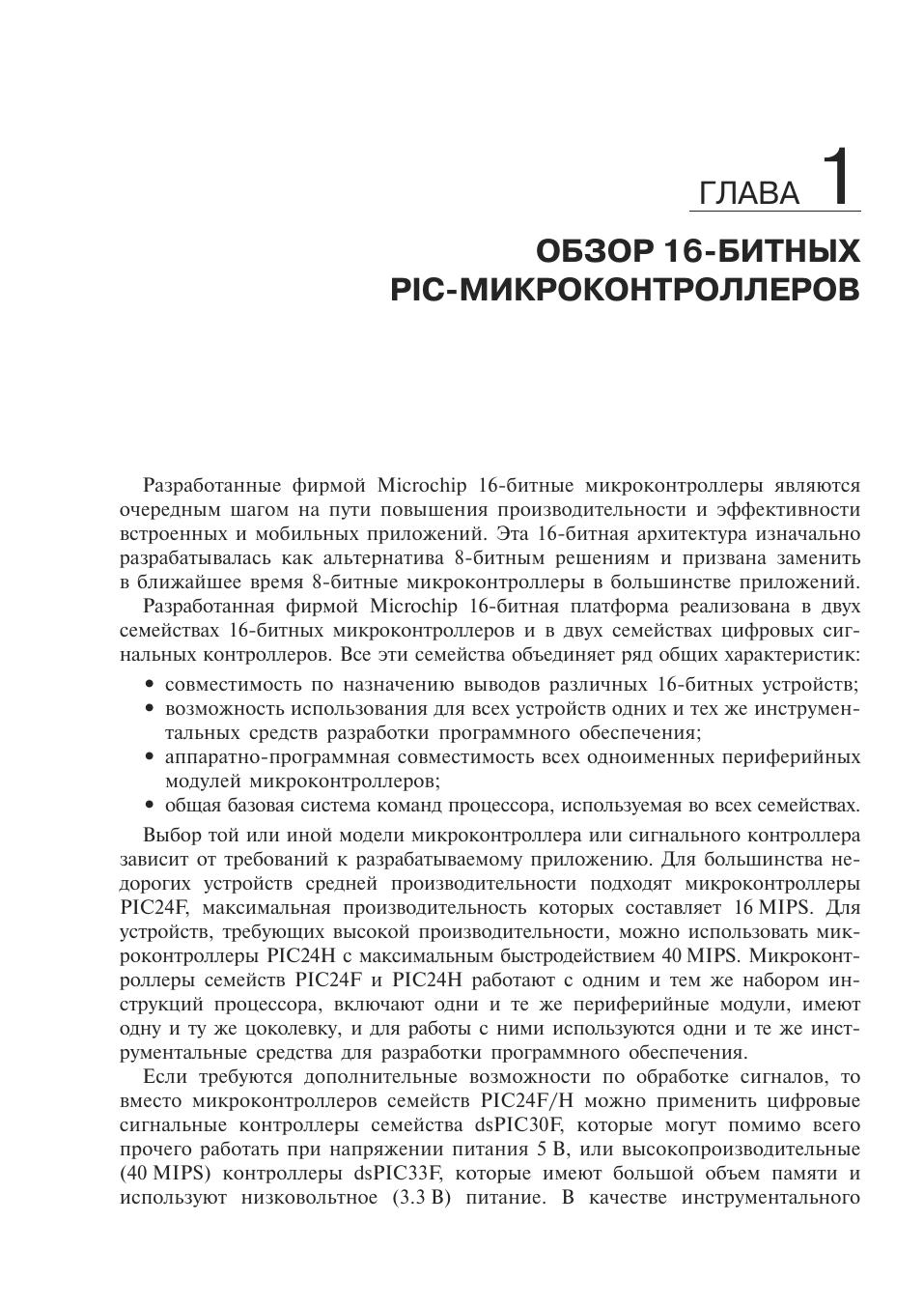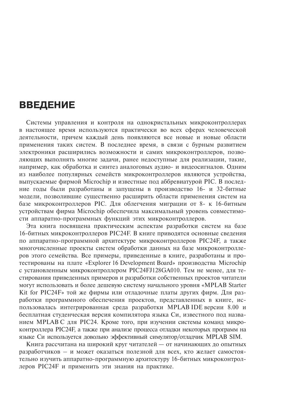 В книге рассматривается широкий круг вопросов, связанных с практическим применением популярных 16-битных микроконтроллеров PIC24 в системах обработки данных и управления оборудованием. Приводятся многочисленные примеры программирования несложных аппаратно-программных систем обработки аналоговой и цифровой информации с применением периферийных модулей микроконтроллеров PIC24F. В контексте разработанных примеров приводятся необходимые сведения из теории, что способствует лучшему пониманию материала книги. Все приведенные в книге аппаратно-программные проекты разработаны и проверены на отладочном модуле Explorer 16 Development Board фирмы Microchip и могут служить основой для создания собственных проектов.