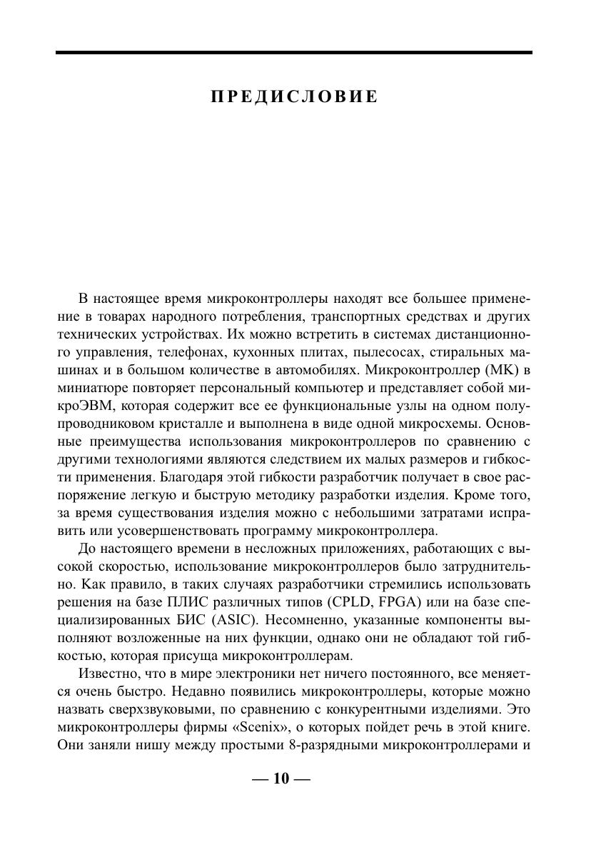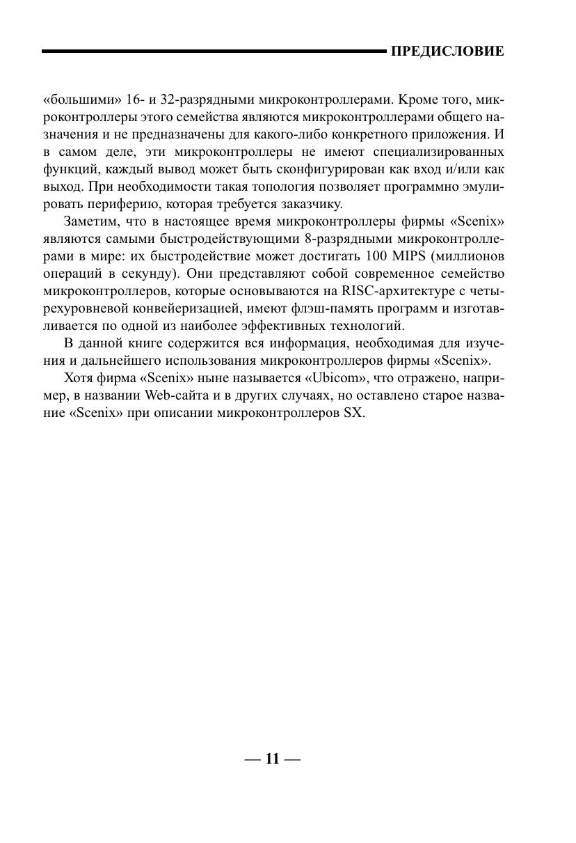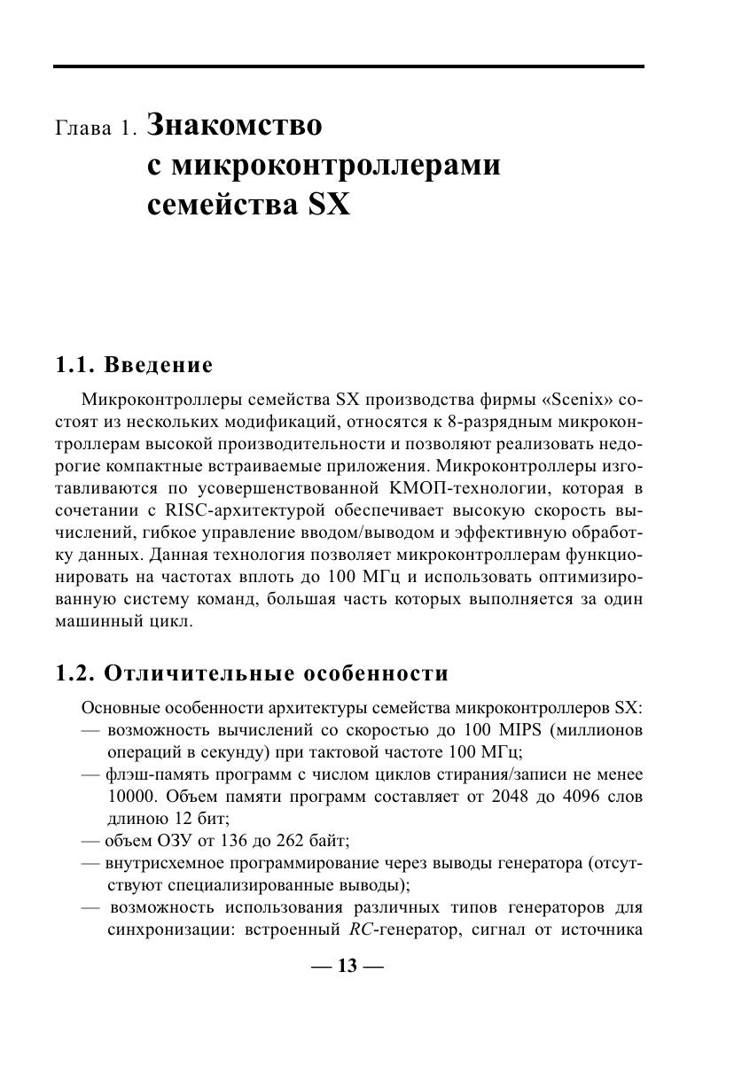 Книга представляет собой справочное пособие по микроконтроллерам серии SX фирмы «Scenix» (сейчас «Ubicom»). Микроконтроллеры данного семейства являются самыми быстродействующими на настоящий момент времени 8 разрядными микроконтроллерами общего назначения в мире (до 100 MIPS). Они представляют собой современное семейство микроконтроллеров, построены по RISC архитектуре с четырехуровневой конвейеризацией, имеют флэш память программ и изготавливаются по одной из наиболее эффективных технологий. В книге содержится информация, необходимая для изучения и дальнейшего использования микроконтроллеров: описание архитектуры, синхронизации, режимов работы, программирование портов ввода/вывода, компаратора, таймеров и прерываний. Отдельно рассмотрены средства разработки, необходимые для использования микроконтроллеров SX. Предназначена для разработчиков радиоэлектронной аппаратуры, студентов технических вузов и специалистов в области цифровой обработки сигнала.